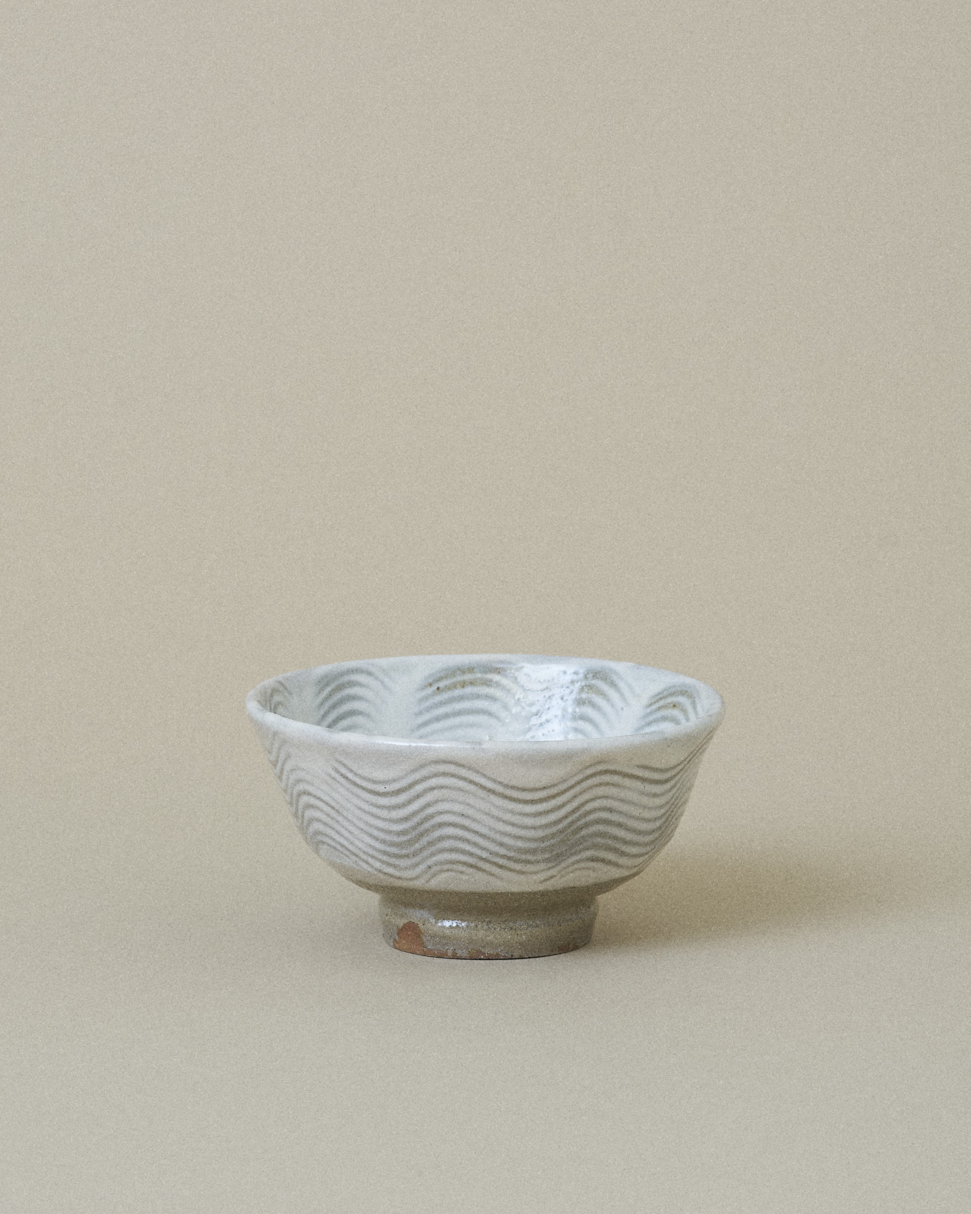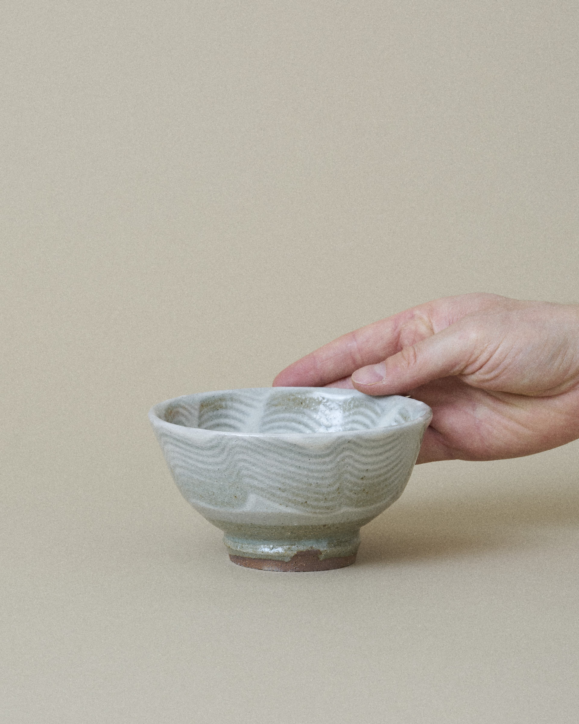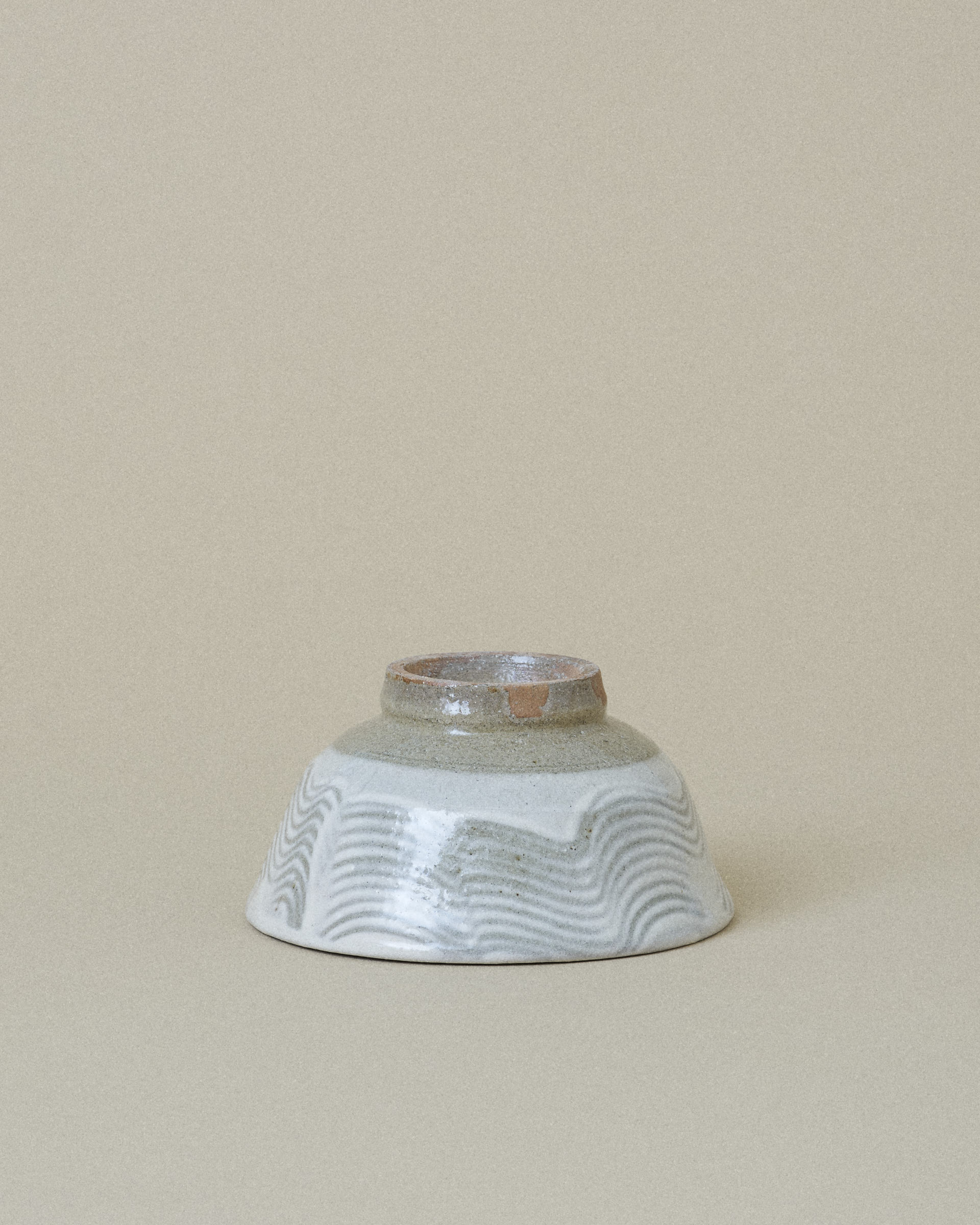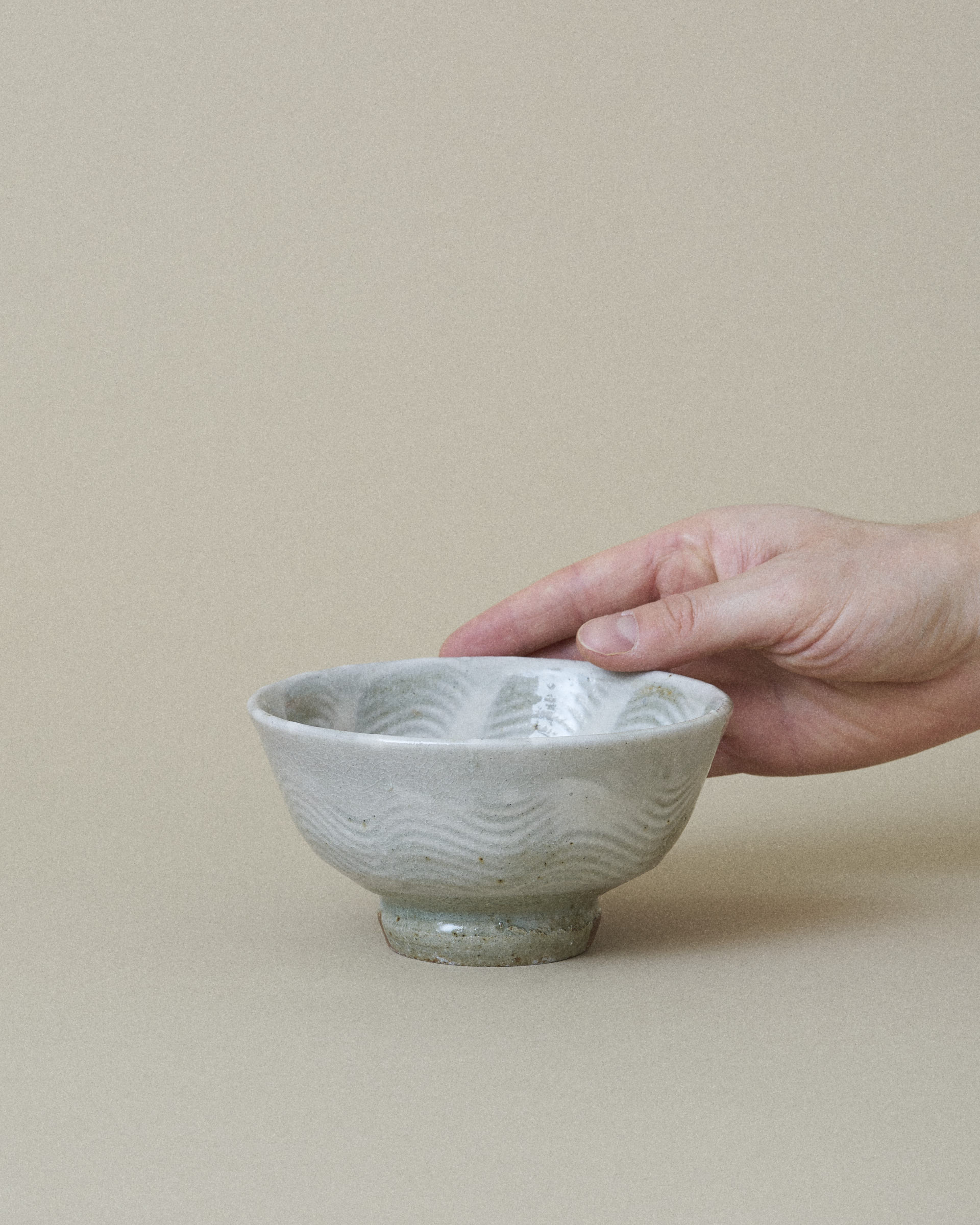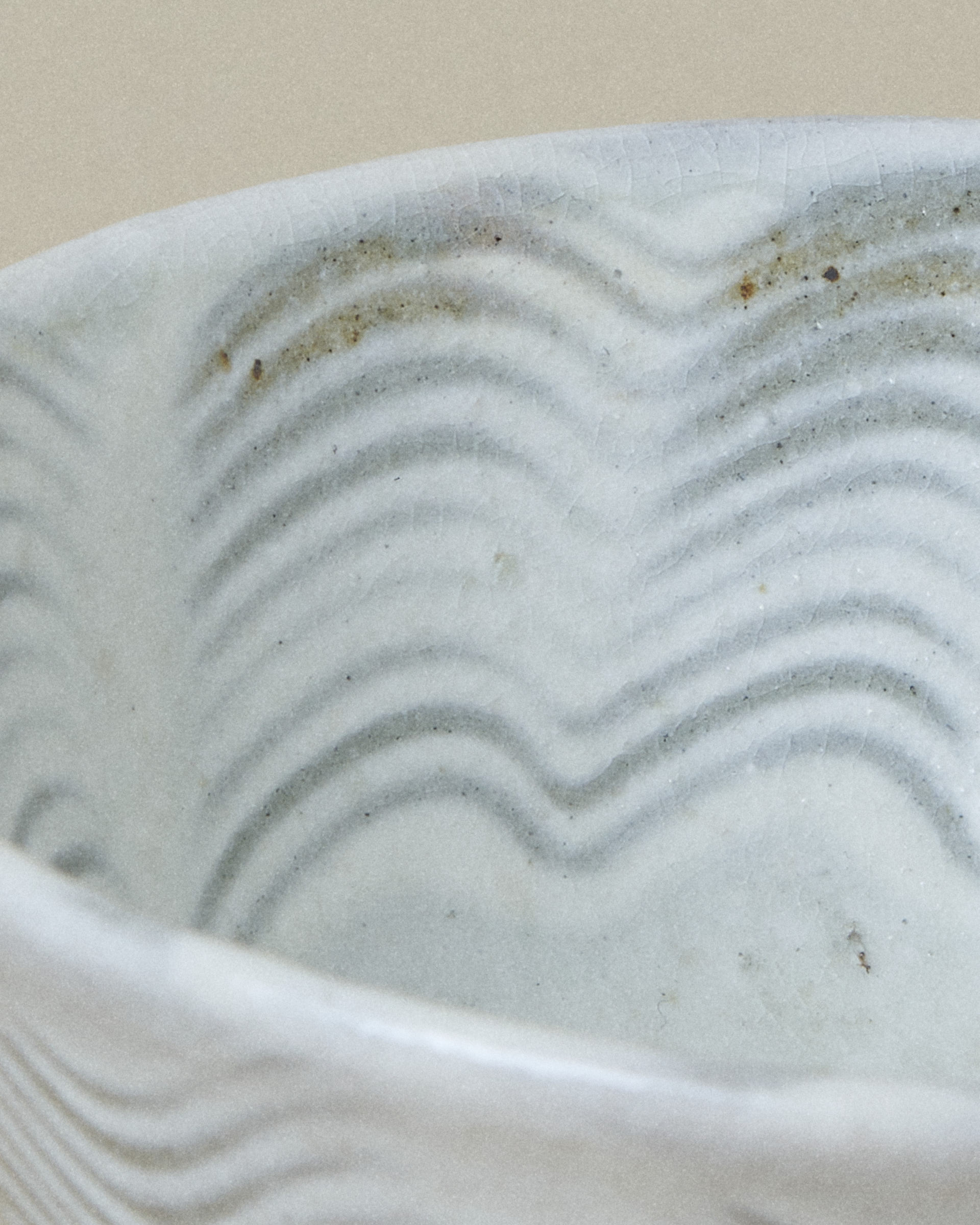 This bowl is finished with a gentle grey glaze touched by a hint of jade. Over the surface, white slip has been applied both inside and out and then combed into a flowing wave pattern, creating movement and texture. The lines bring a sense of rhythm and spontaneity, making each piece uniquely expressive.