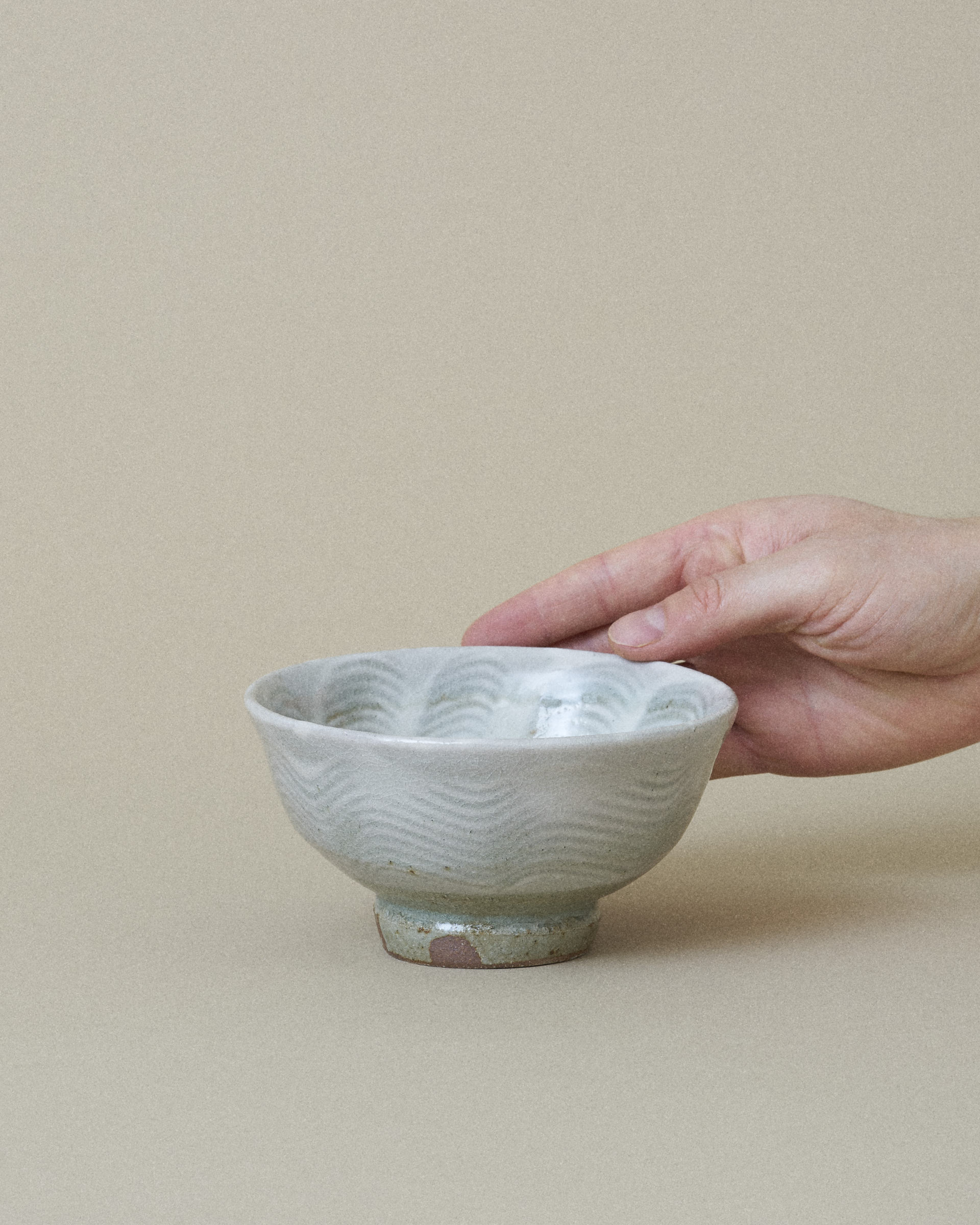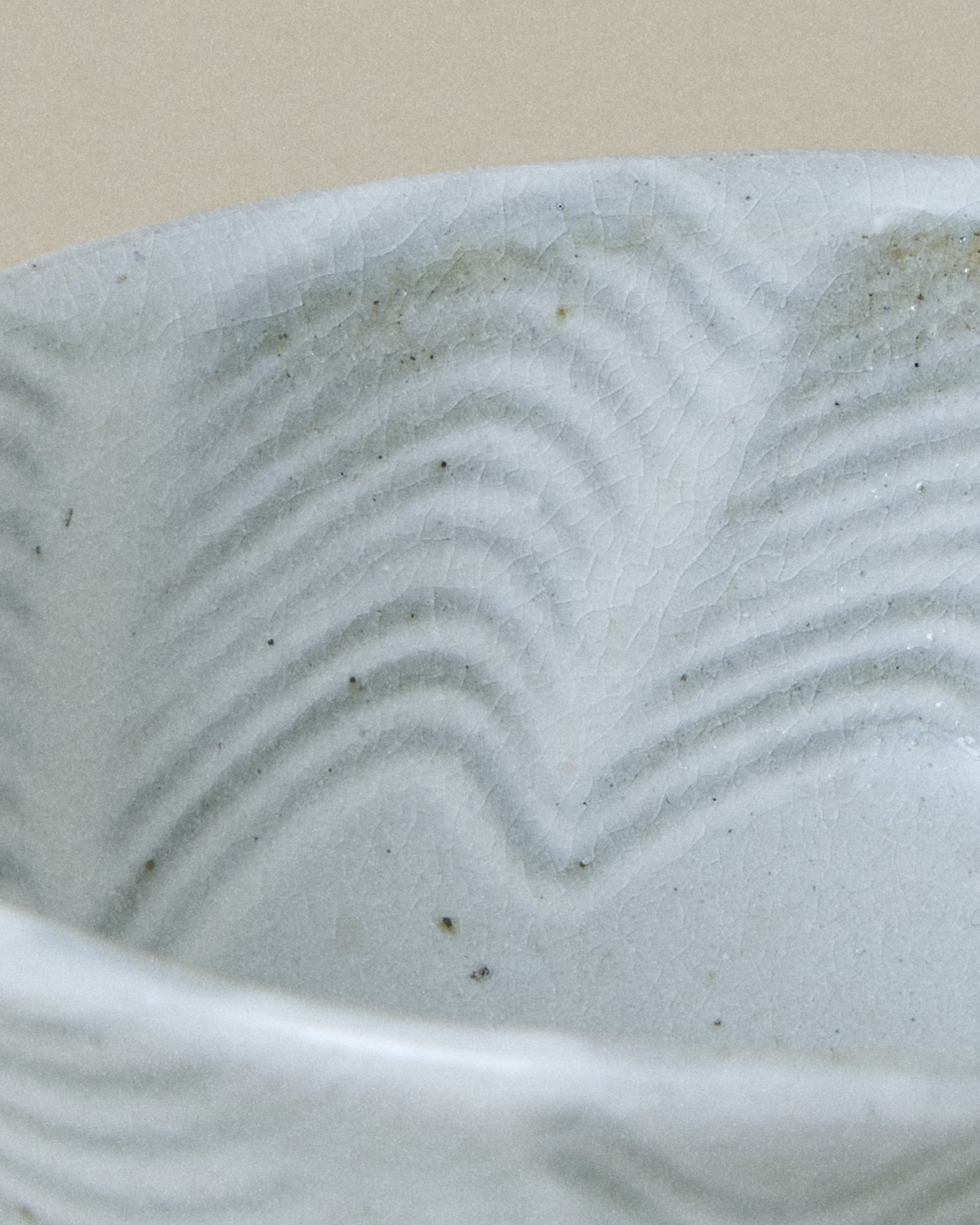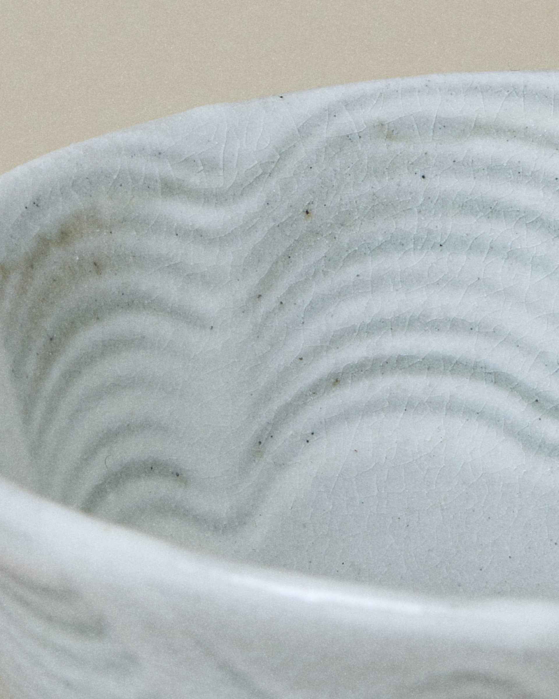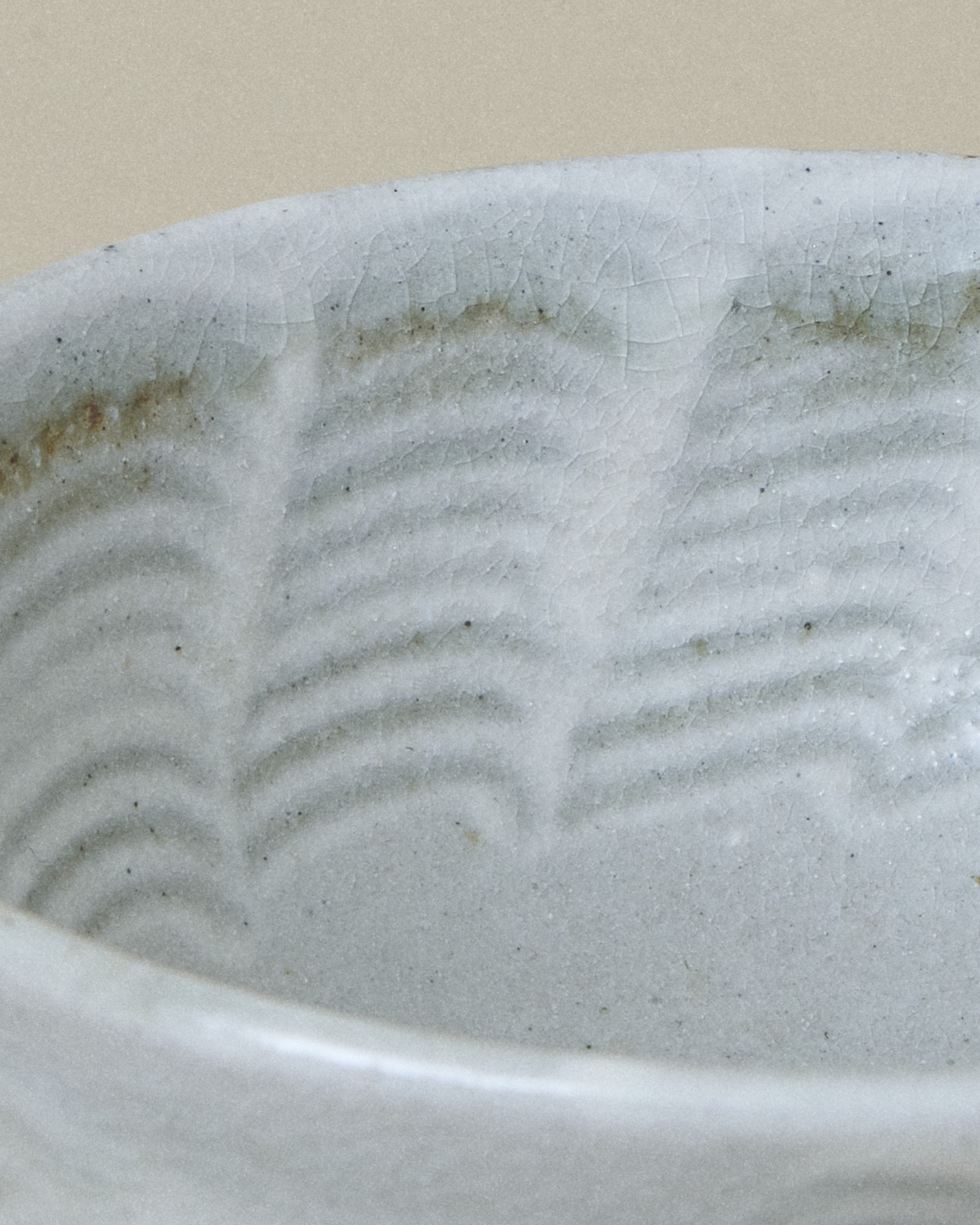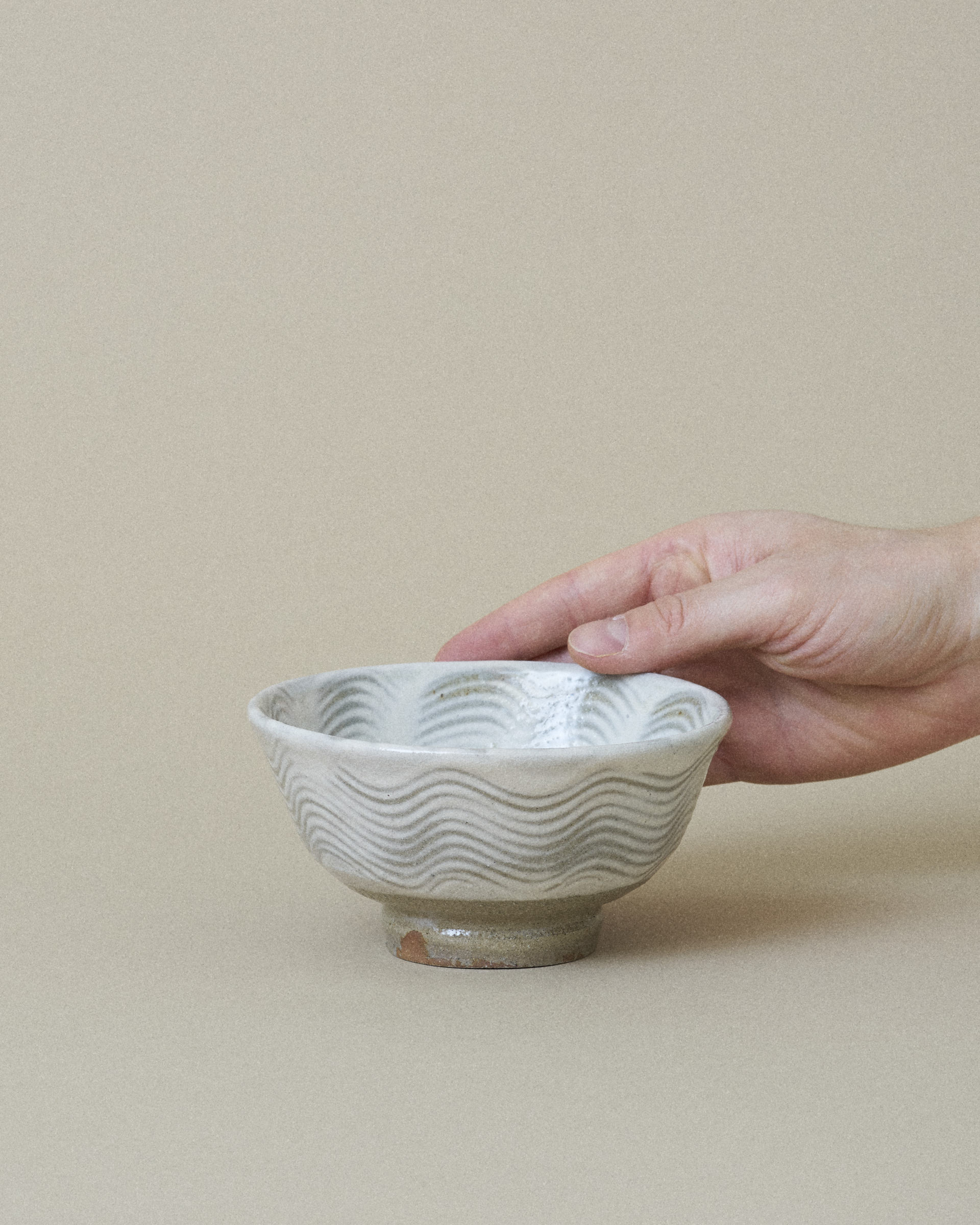 This bowl is finished with a gentle grey glaze touched by a hint of jade. Over the surface, white slip has been applied both inside and out and then combed into a flowing wave pattern, creating movement and texture. The lines bring a sense of rhythm and spontaneity, making each piece uniquely expressive.