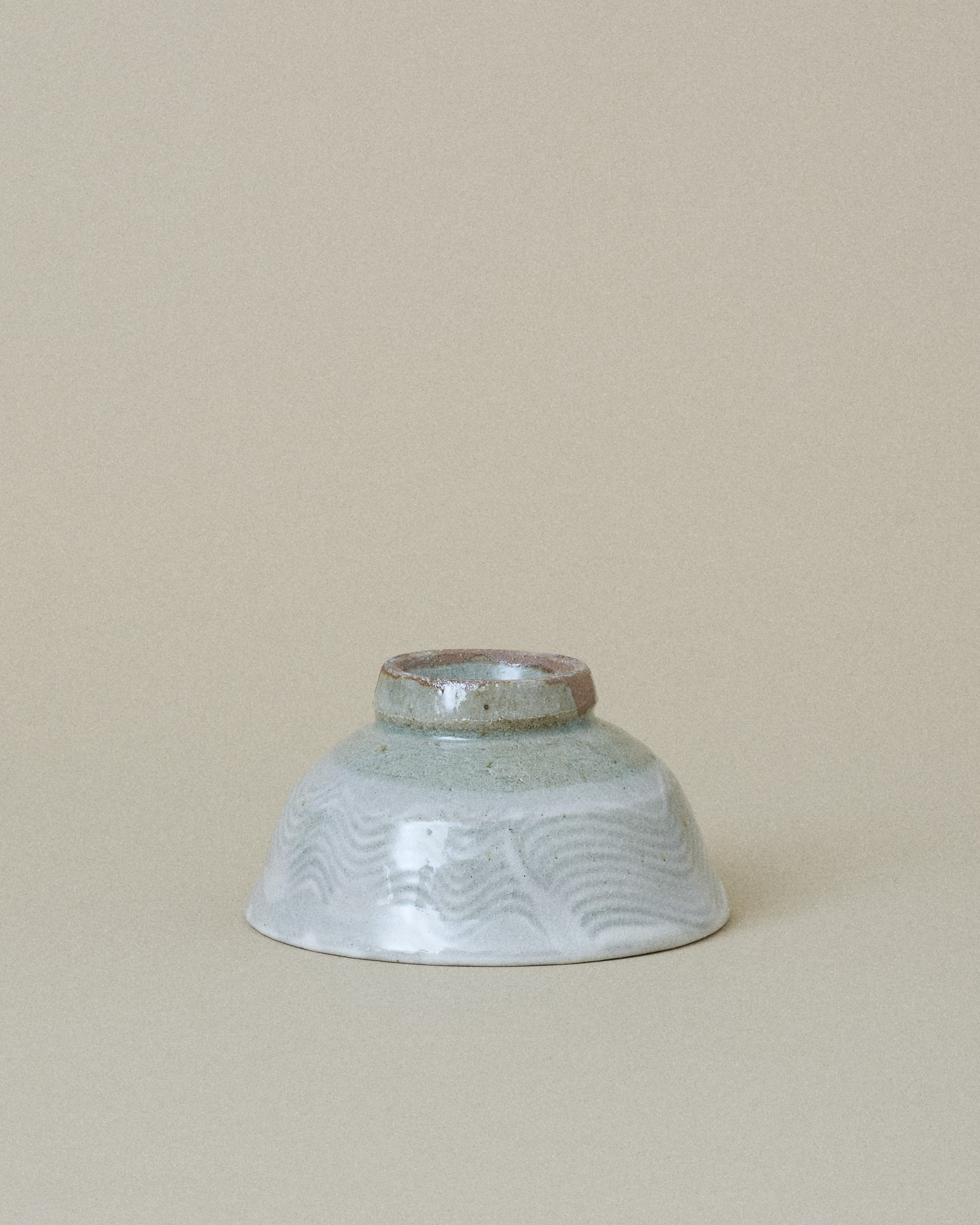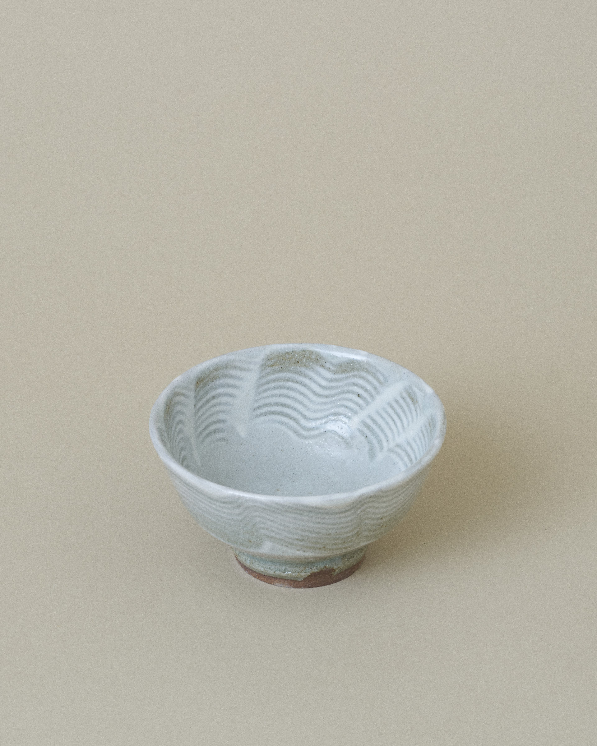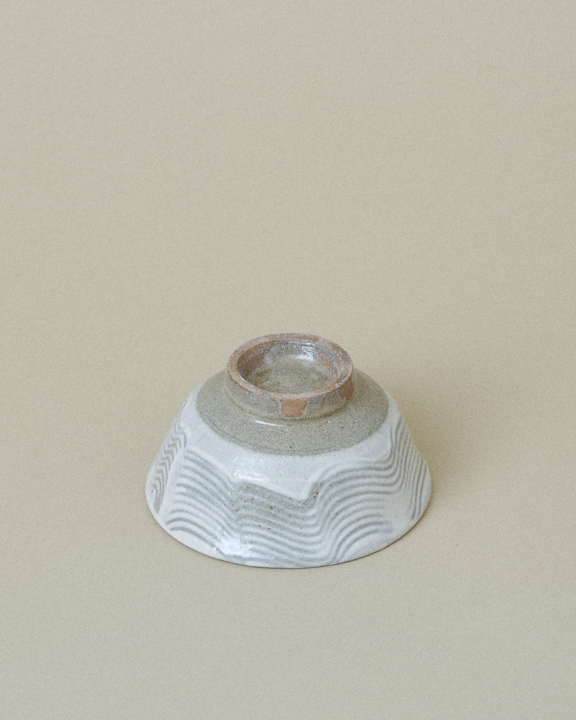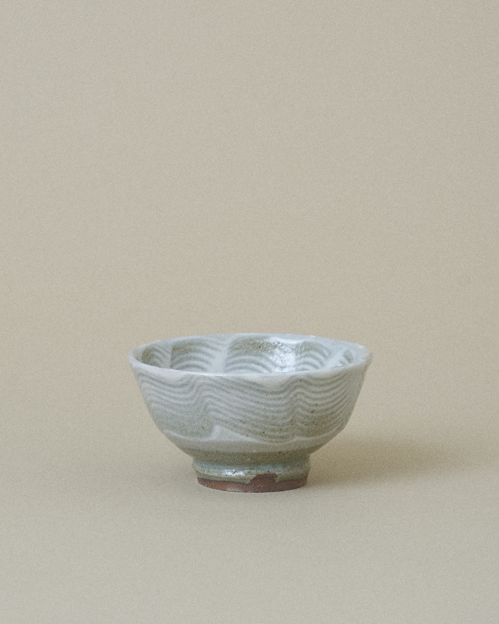 This bowl is finished with a gentle grey glaze touched by a hint of jade. Over the surface, white slip has been applied both inside and out and then combed into a flowing wave pattern, creating movement and texture. The lines bring a sense of rhythm and spontaneity, making each piece uniquely expressive.