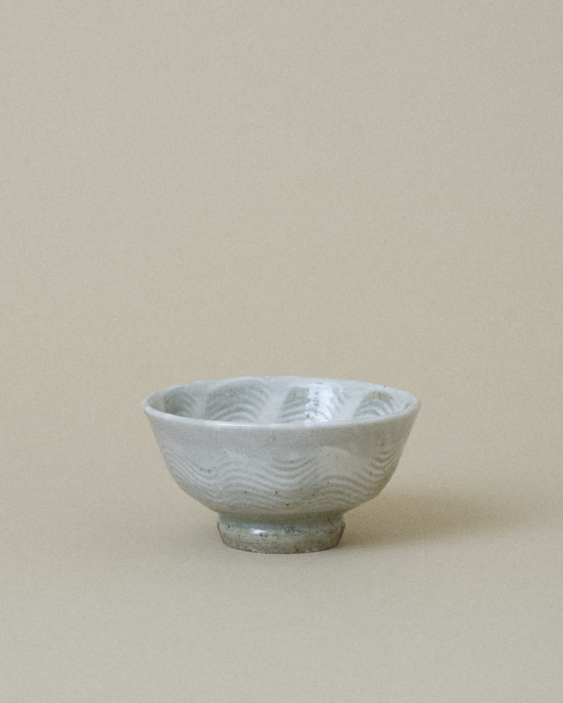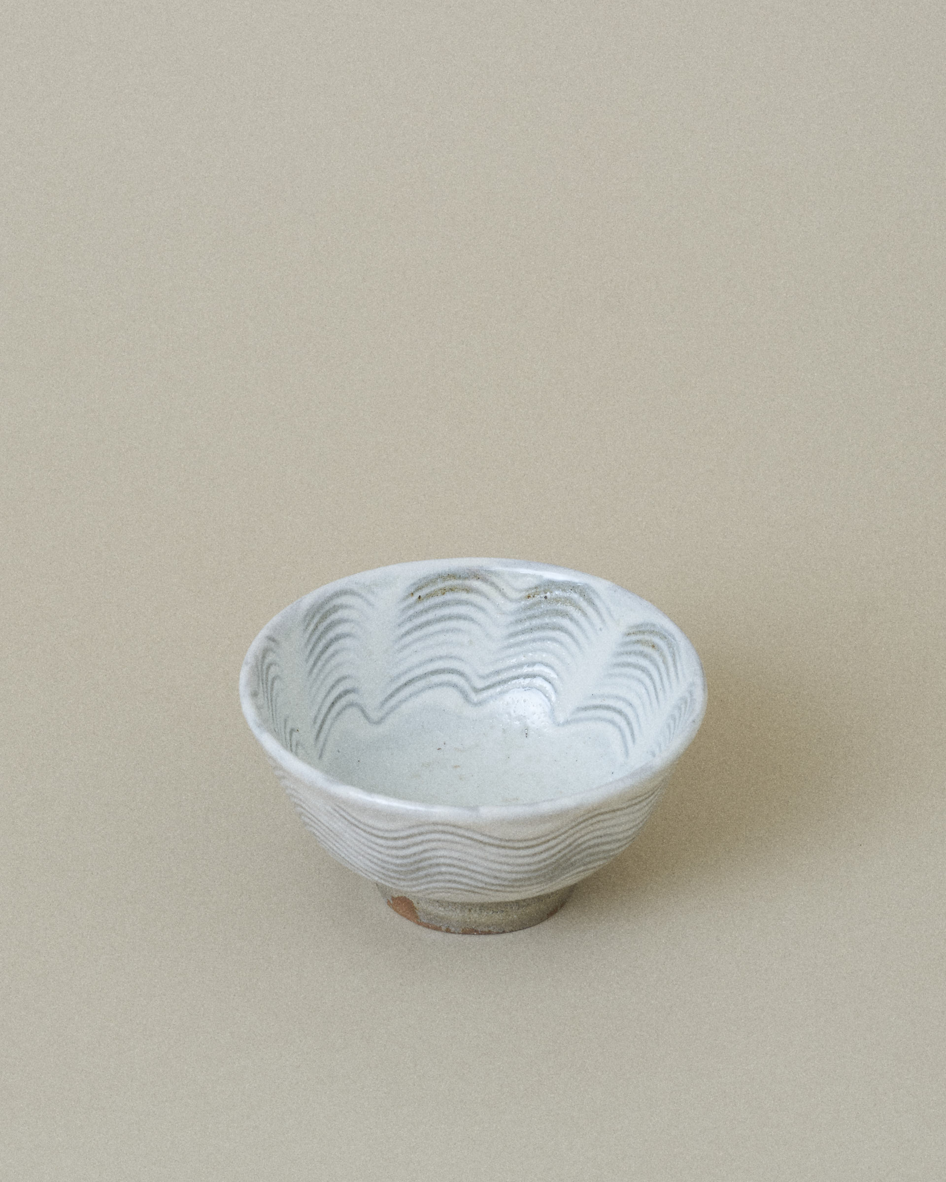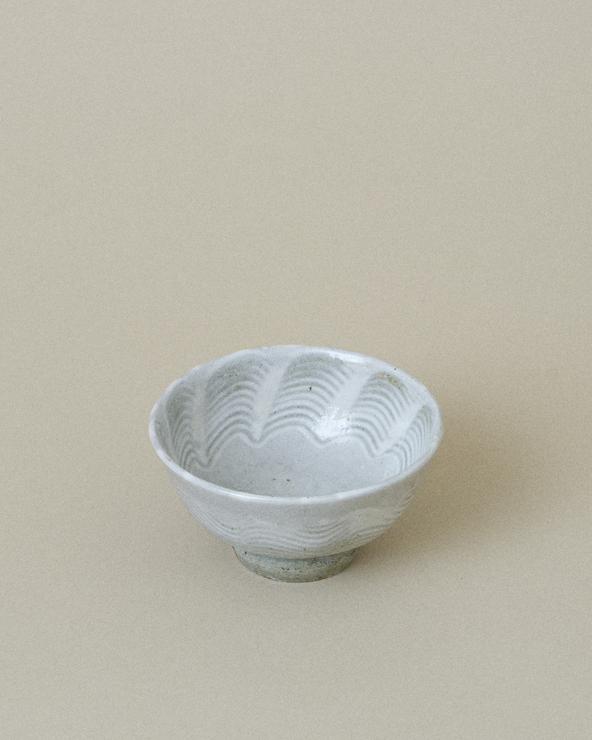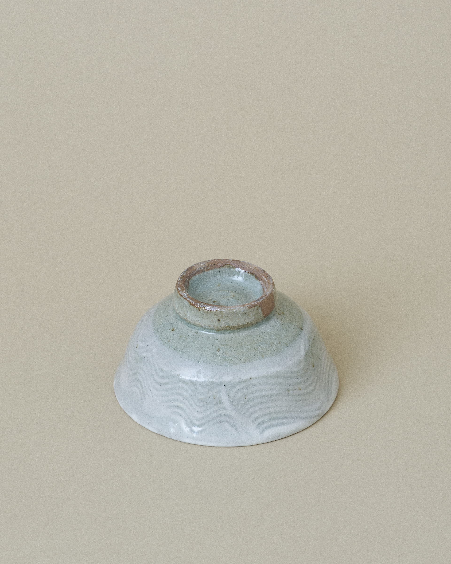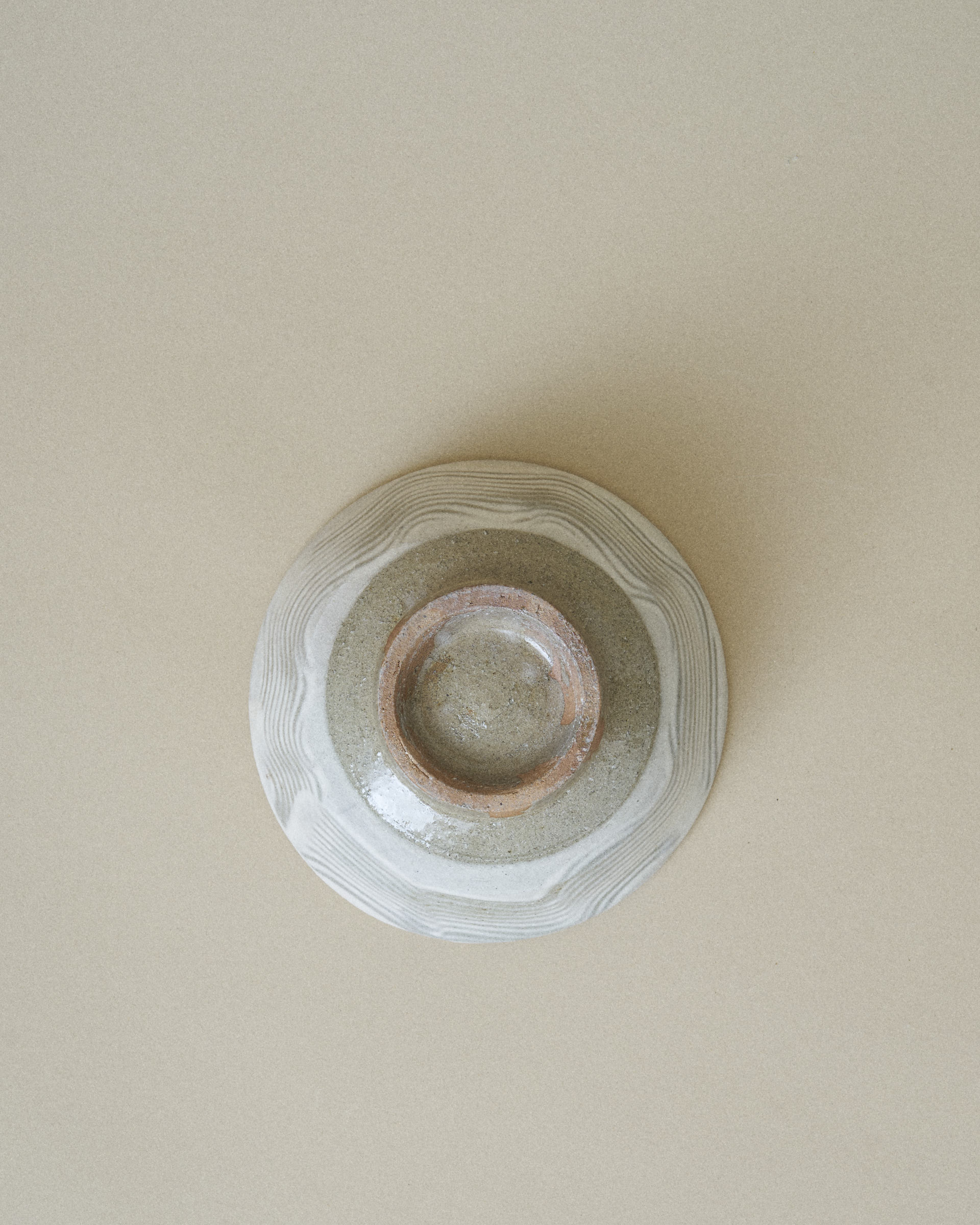 This bowl is finished with a gentle grey glaze touched by a hint of jade. Over the surface, white slip has been applied both inside and out and then combed into a flowing wave pattern, creating movement and texture. The lines bring a sense of rhythm and spontaneity, making each piece uniquely expressive.