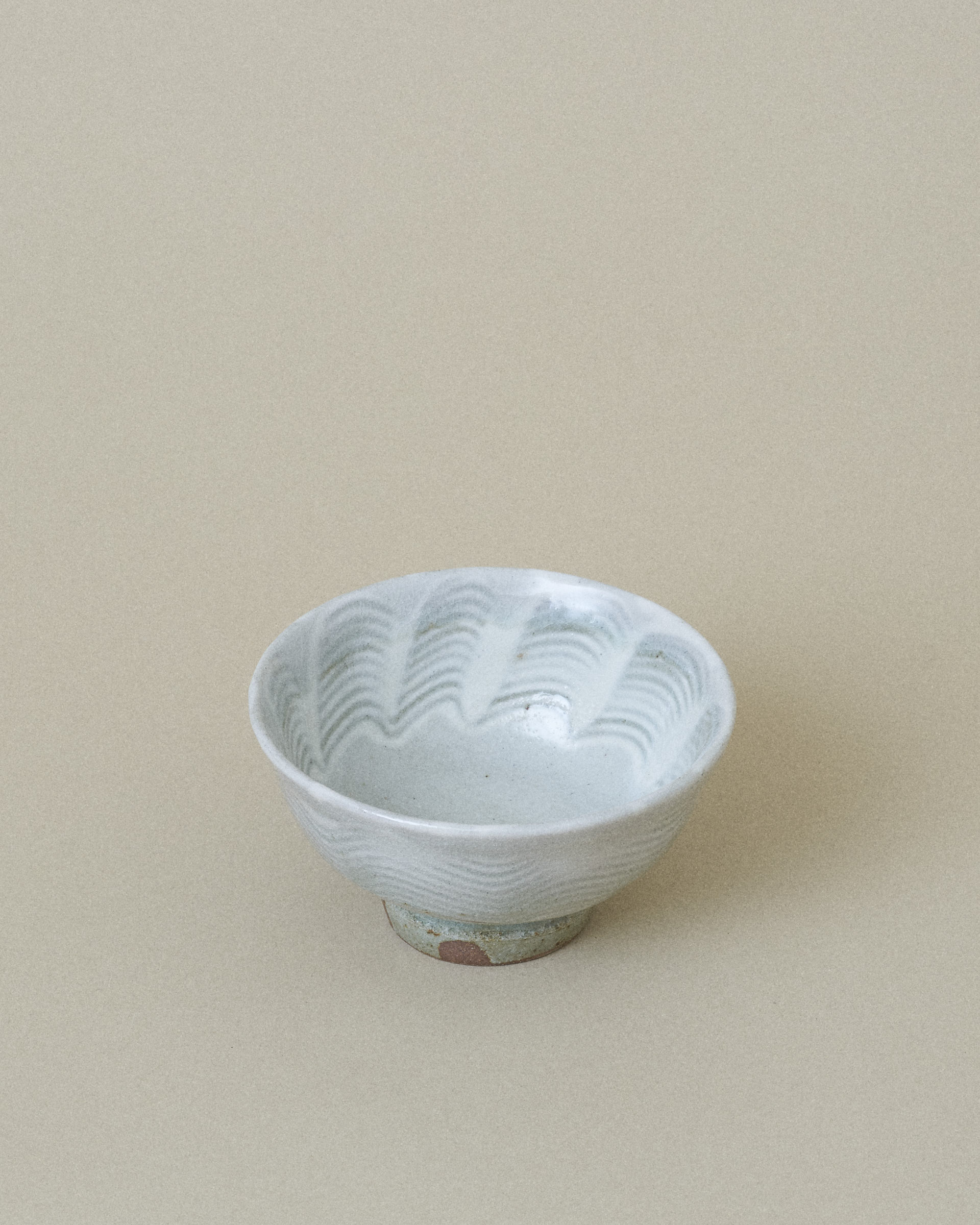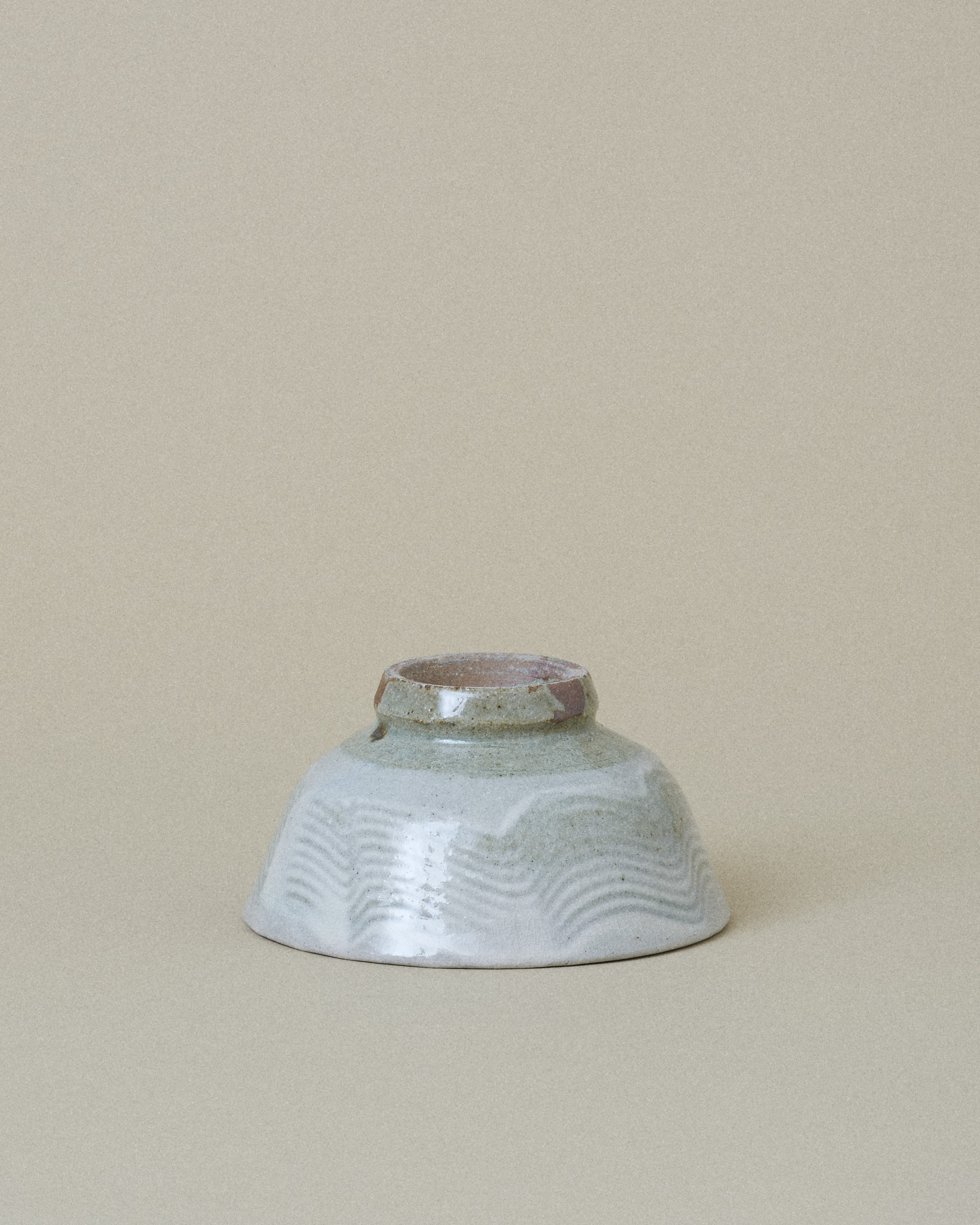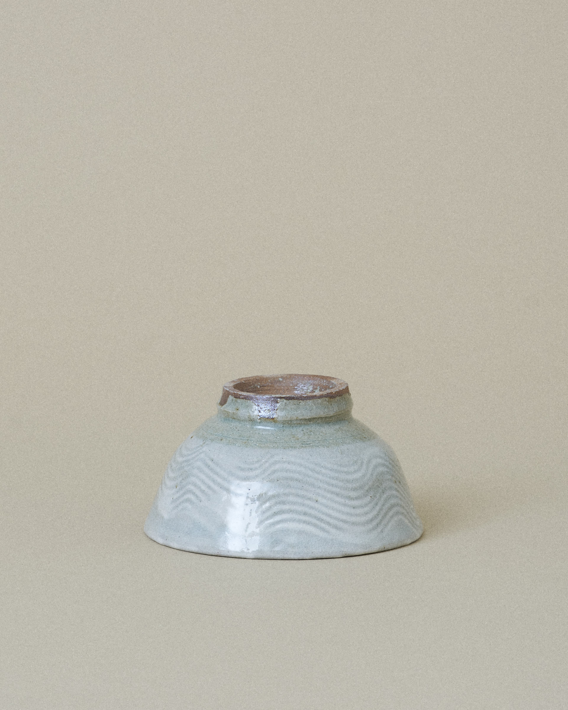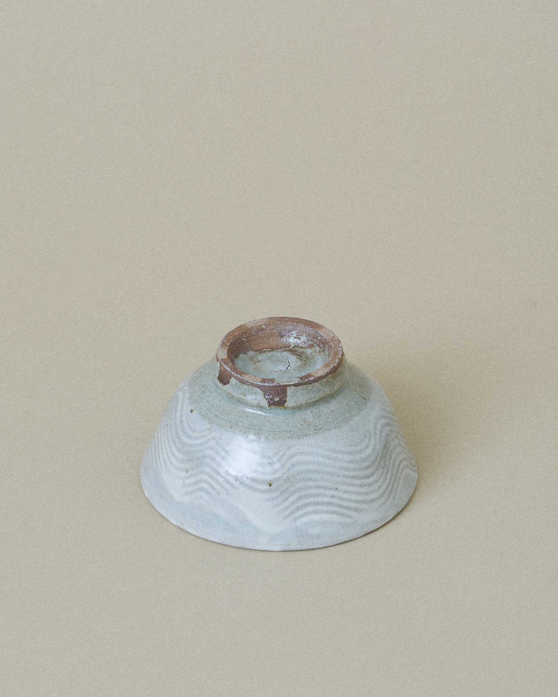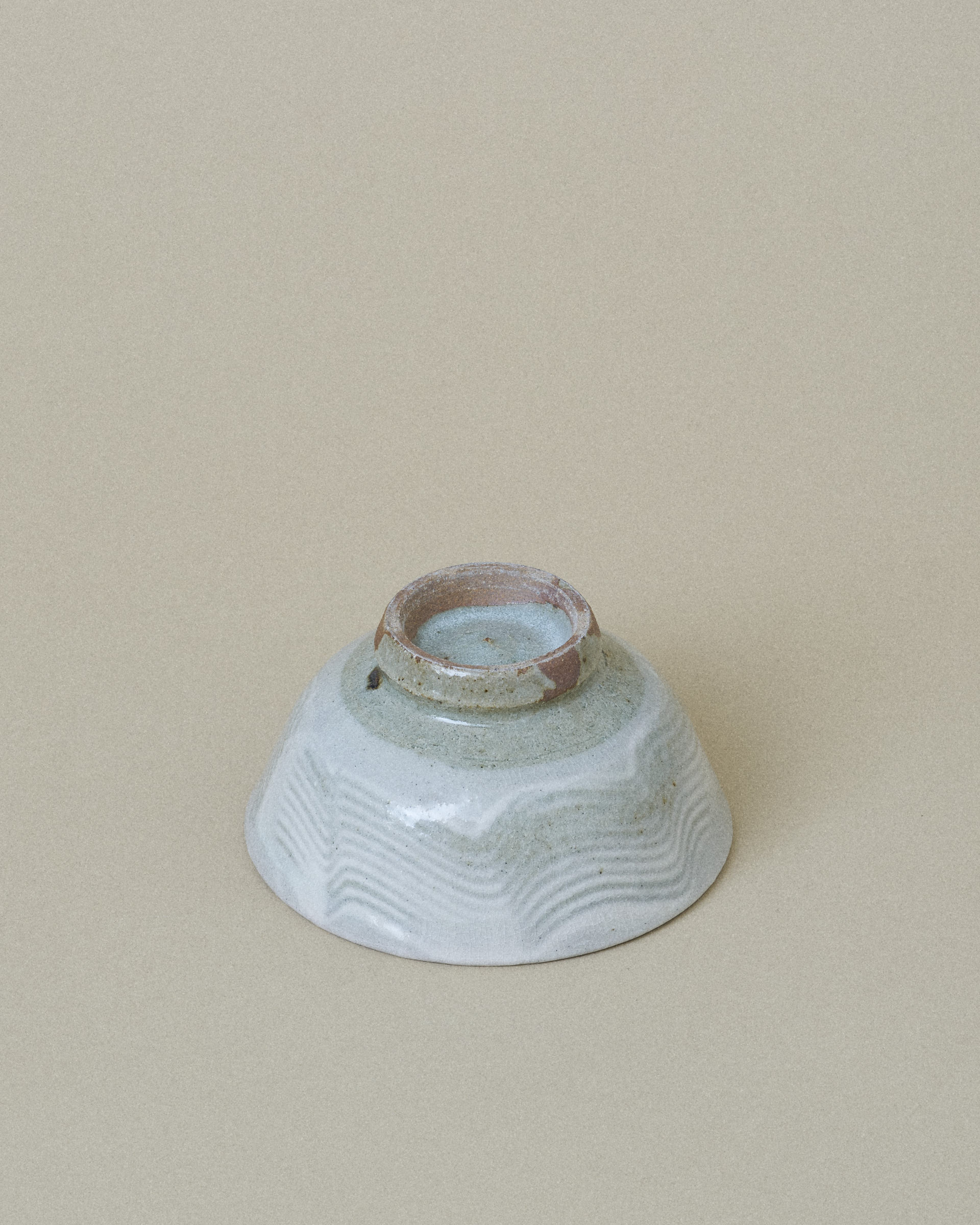 This bowl is finished with a gentle grey glaze touched by a hint of jade. Over the surface, white slip has been applied both inside and out and then combed into a flowing wave pattern, creating movement and texture. The lines bring a sense of rhythm and spontaneity, making each piece uniquely expressive.