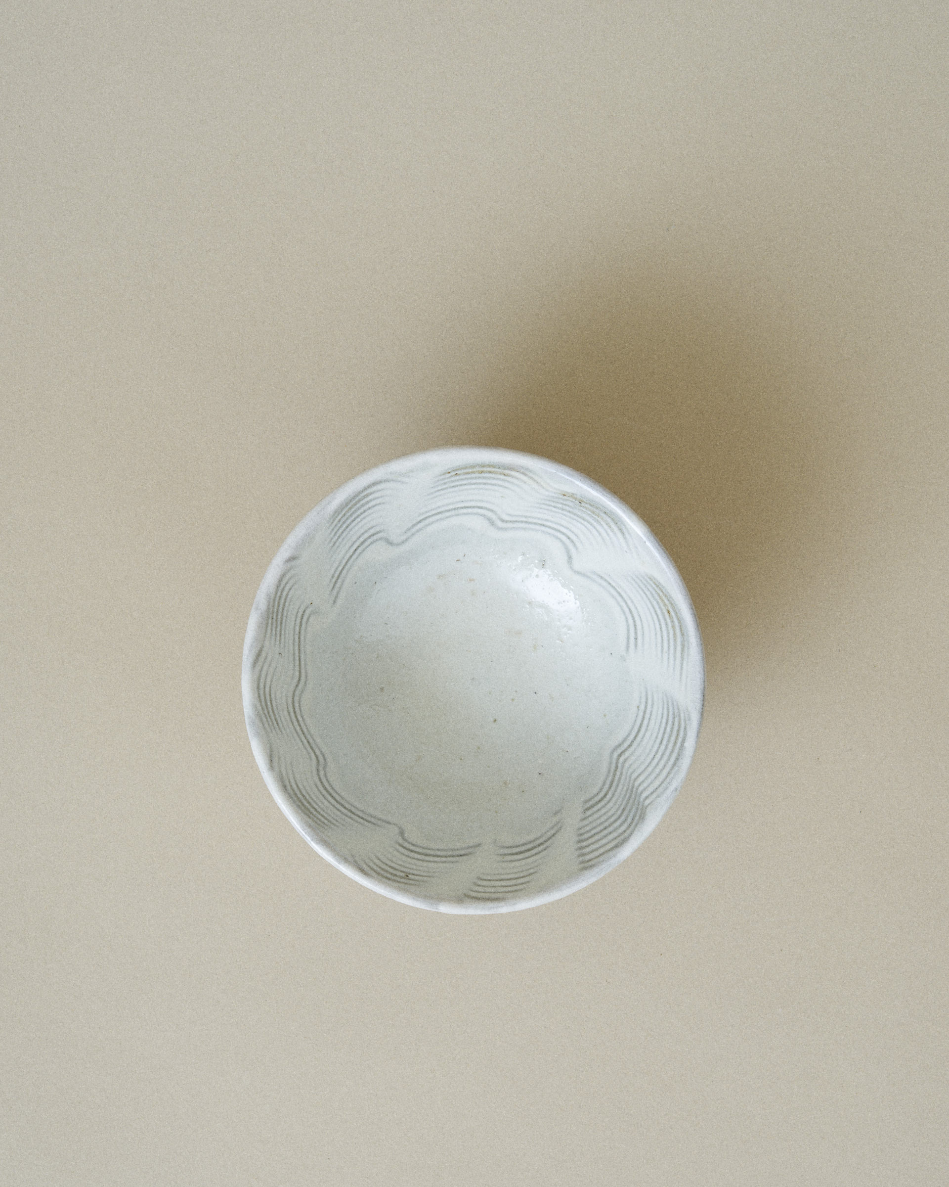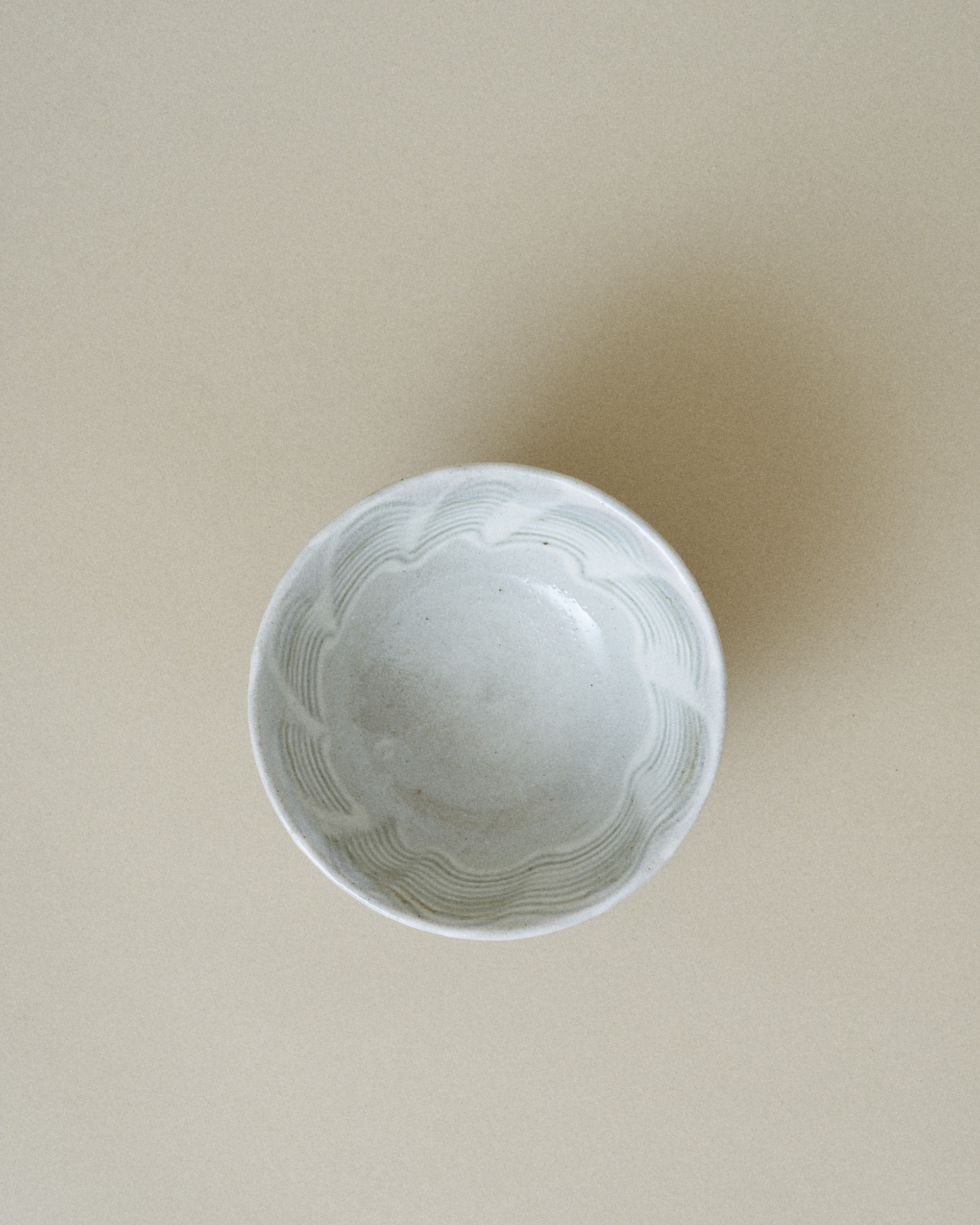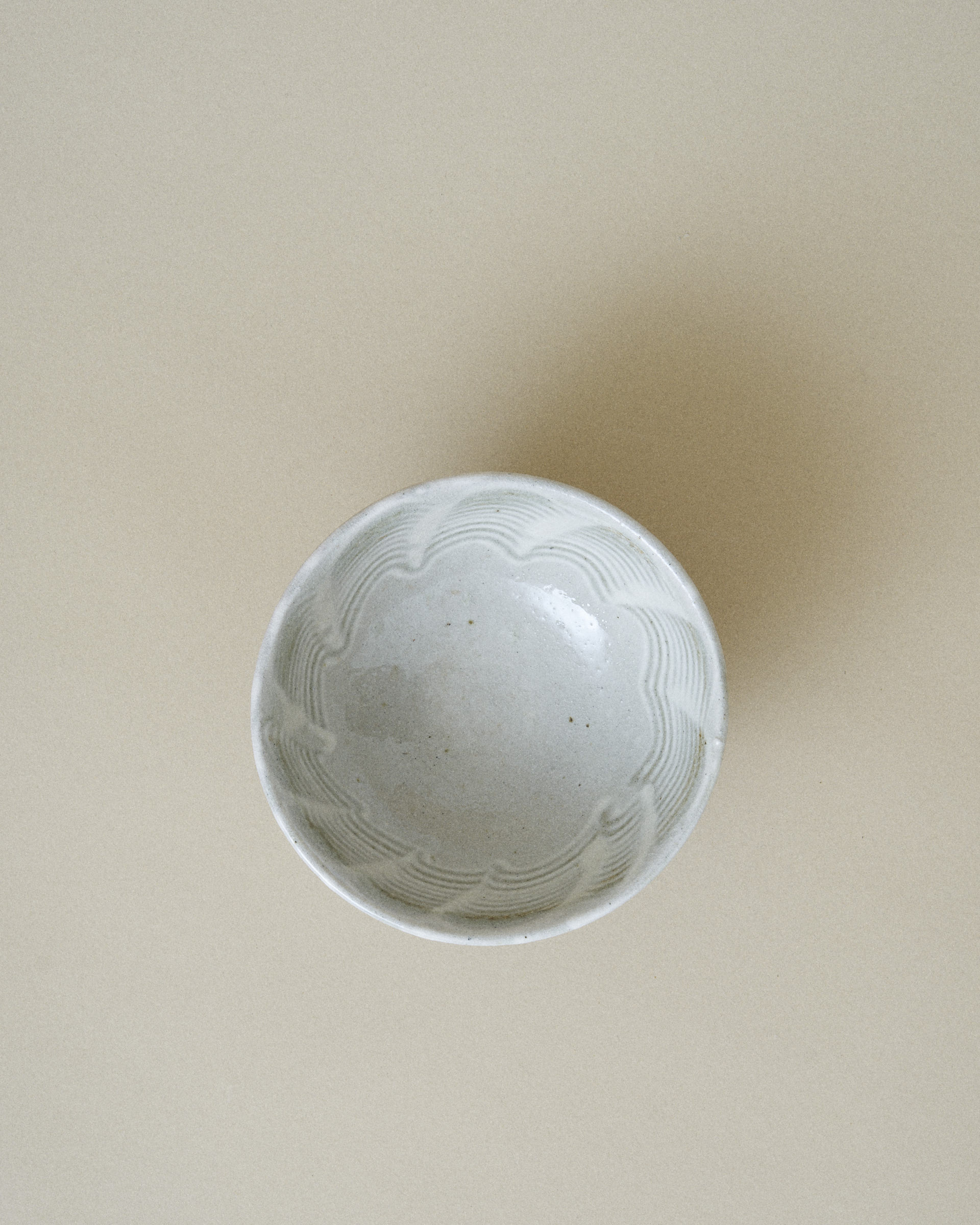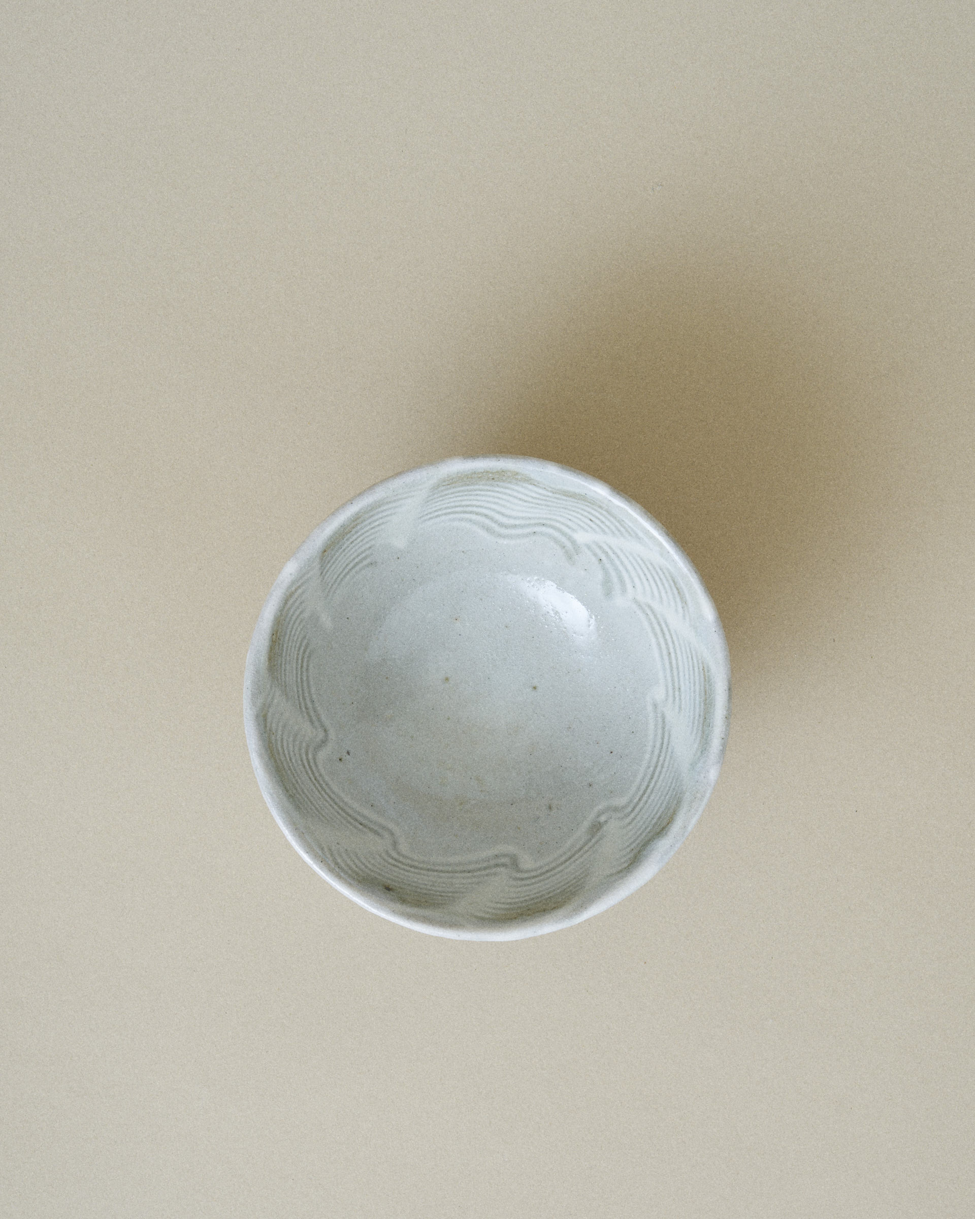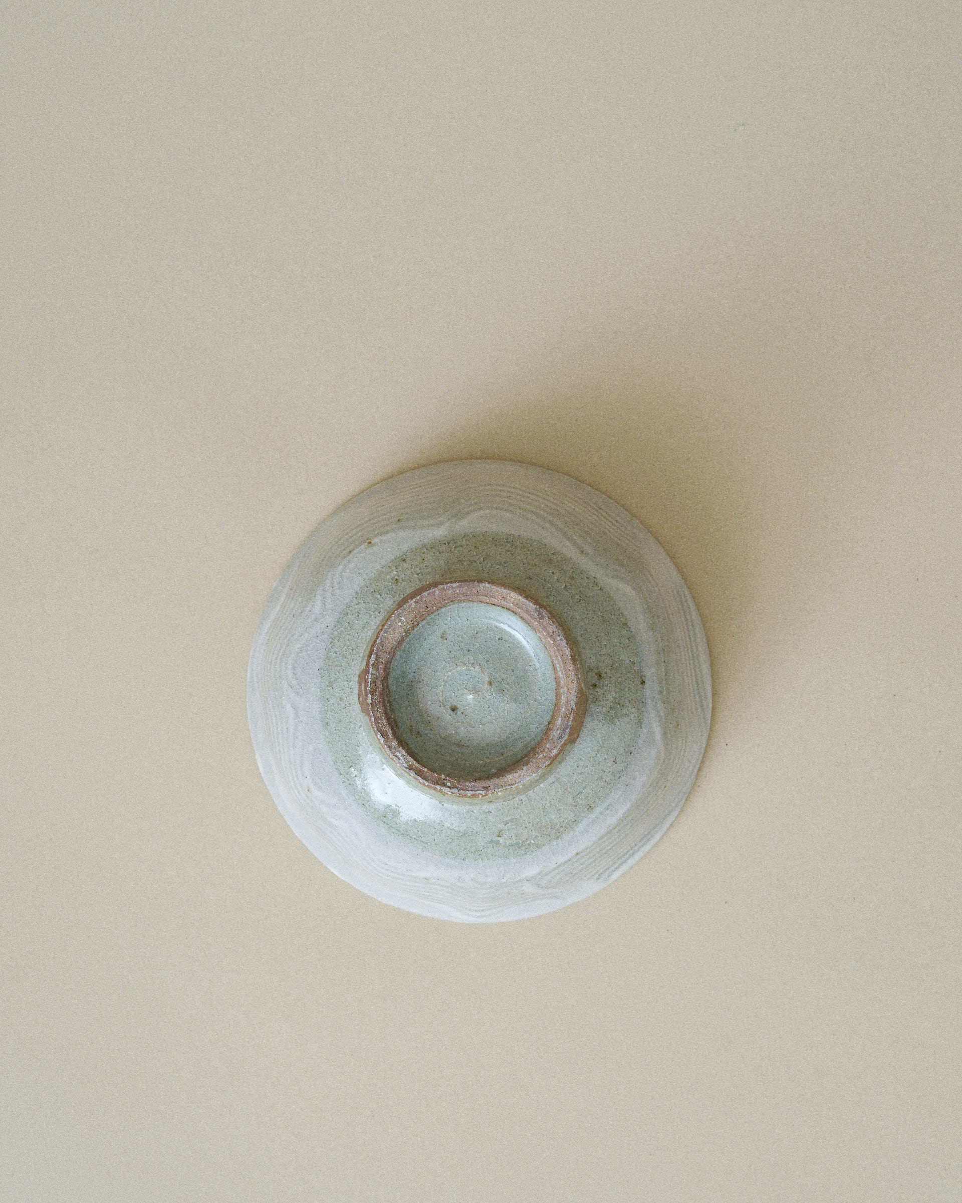 This bowl is finished with a gentle grey glaze touched by a hint of jade. Over the surface, white slip has been applied both inside and out and then combed into a flowing wave pattern, creating movement and texture. The lines bring a sense of rhythm and spontaneity, making each piece uniquely expressive.