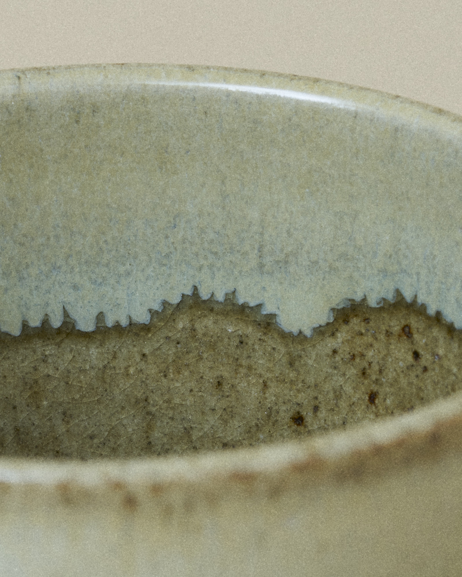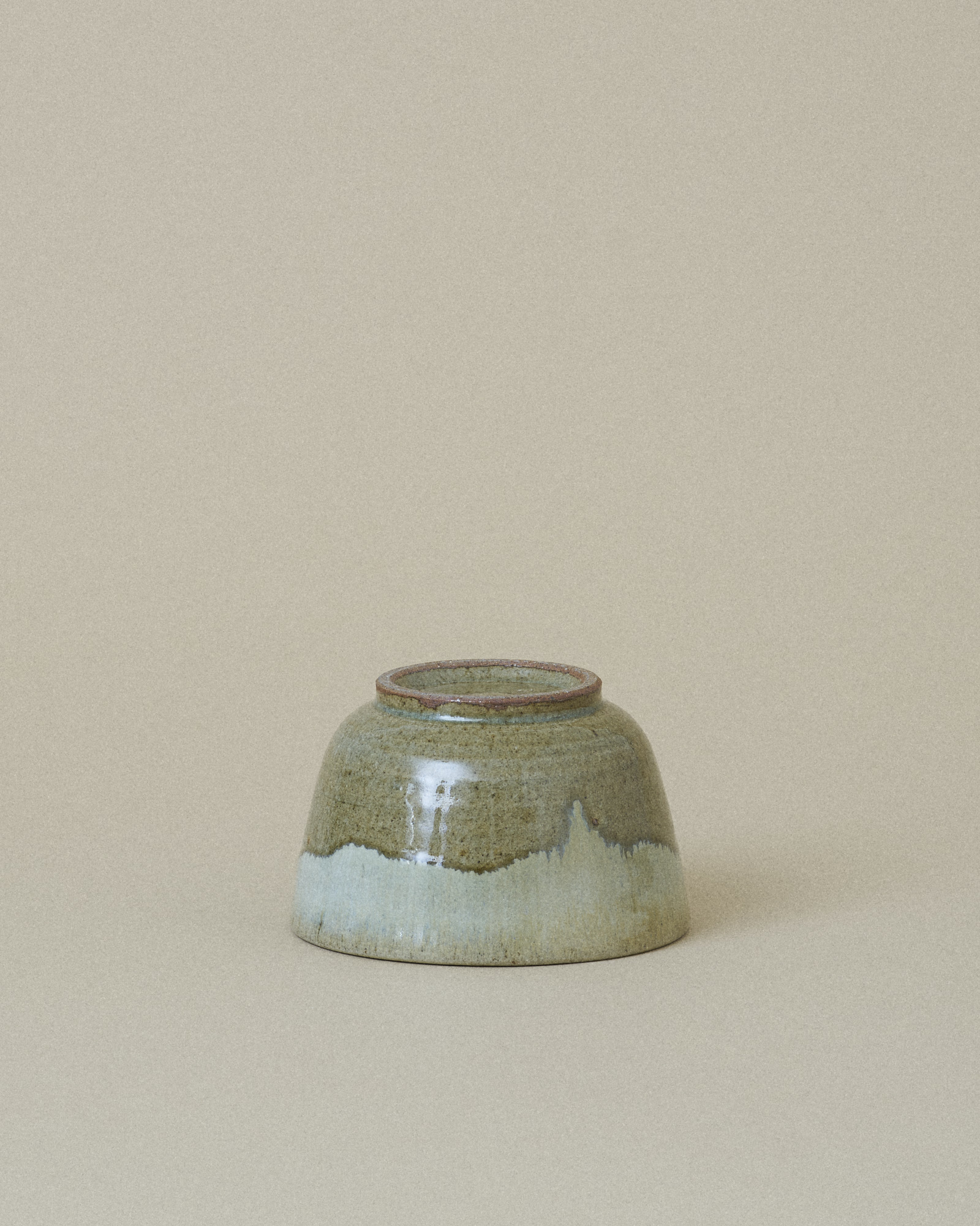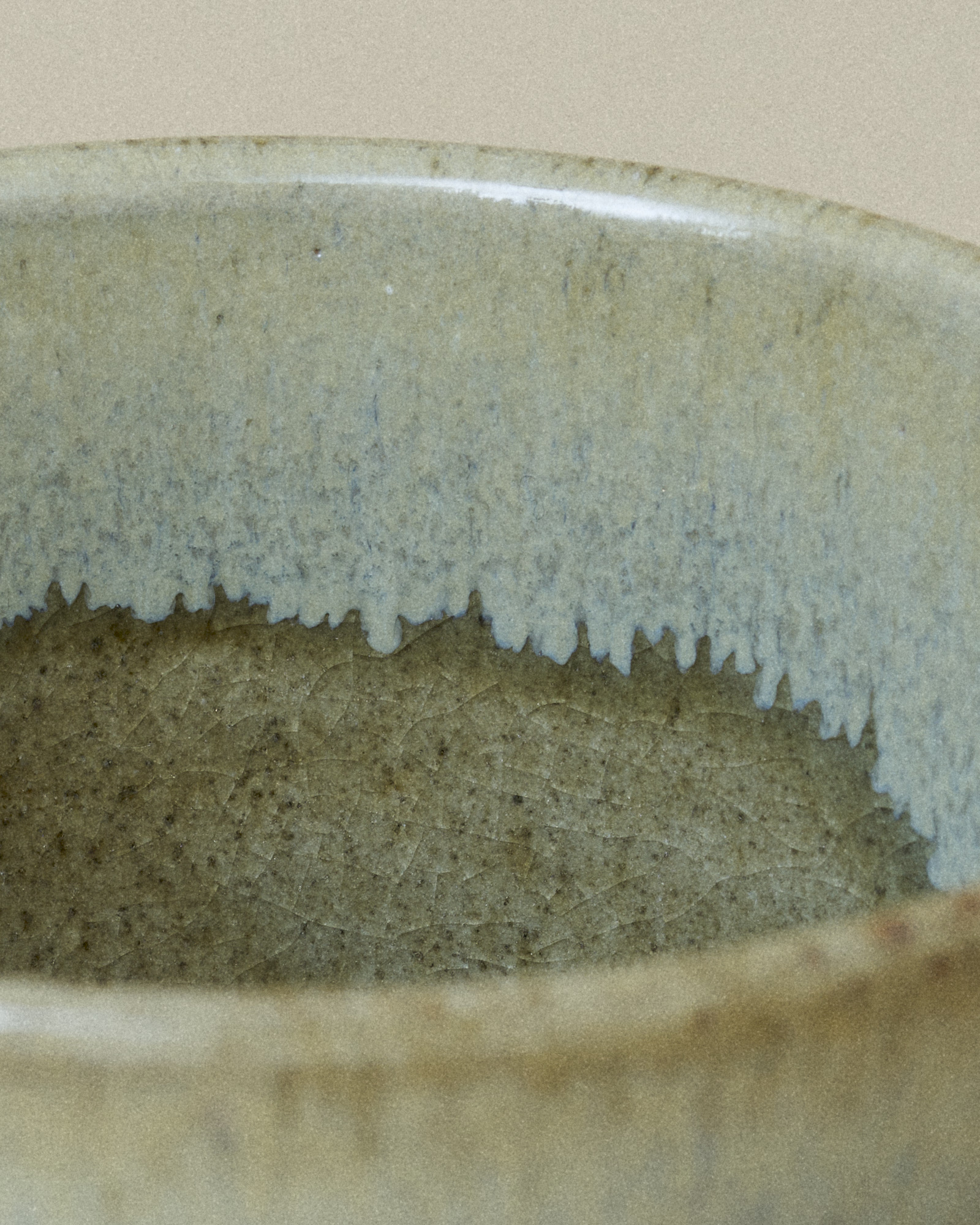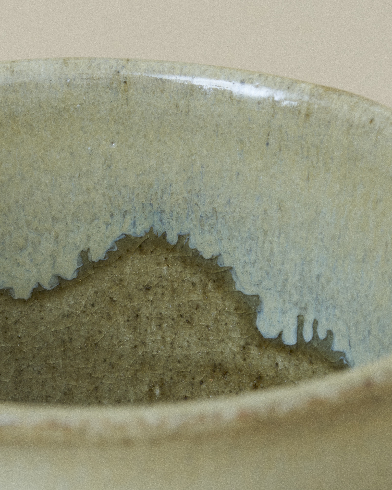 A pale sage green glaze cascades into a muted olive-brown base, creating a natural, organic gradient that flows seamlessly across both the interior and exterior of the bowl.