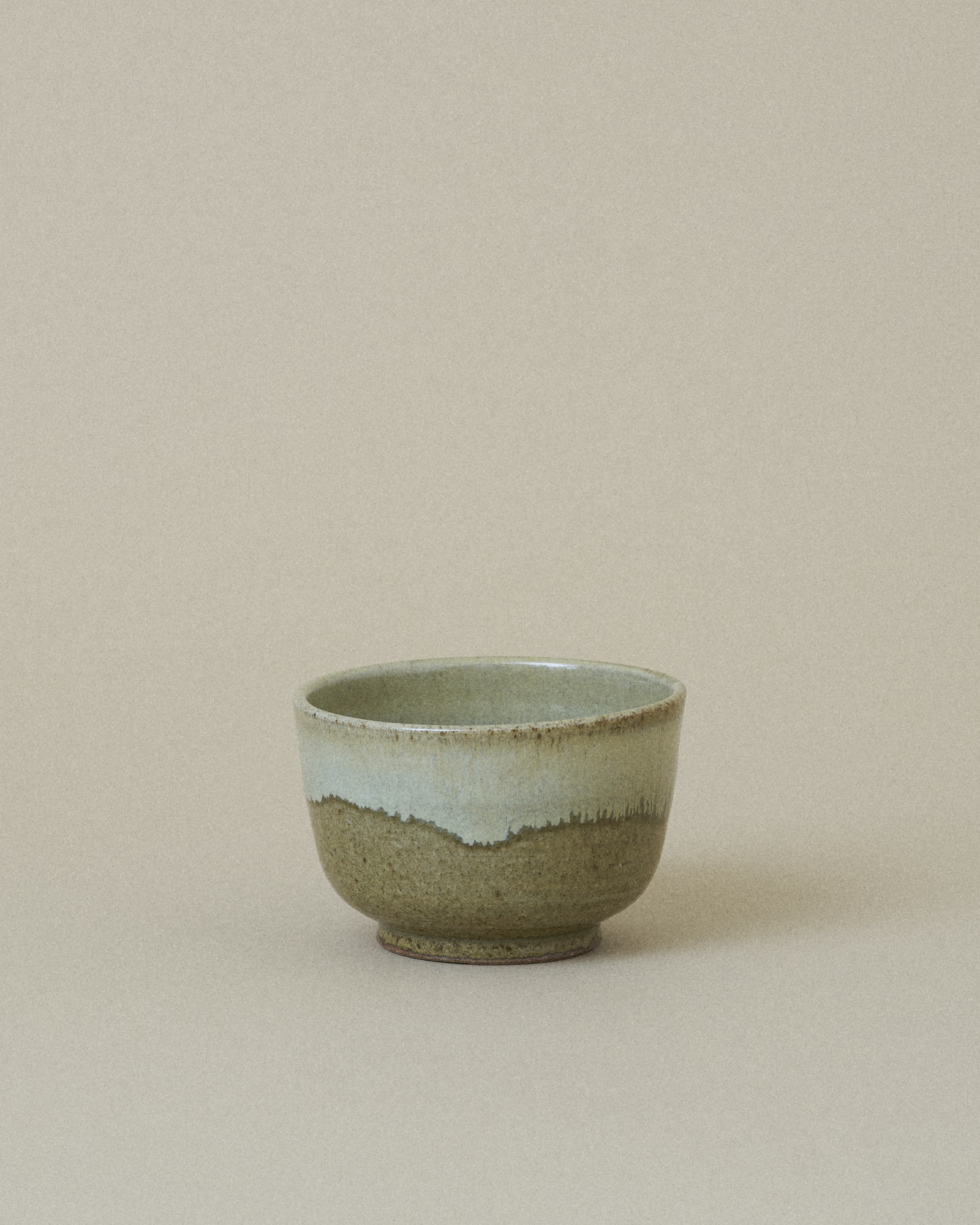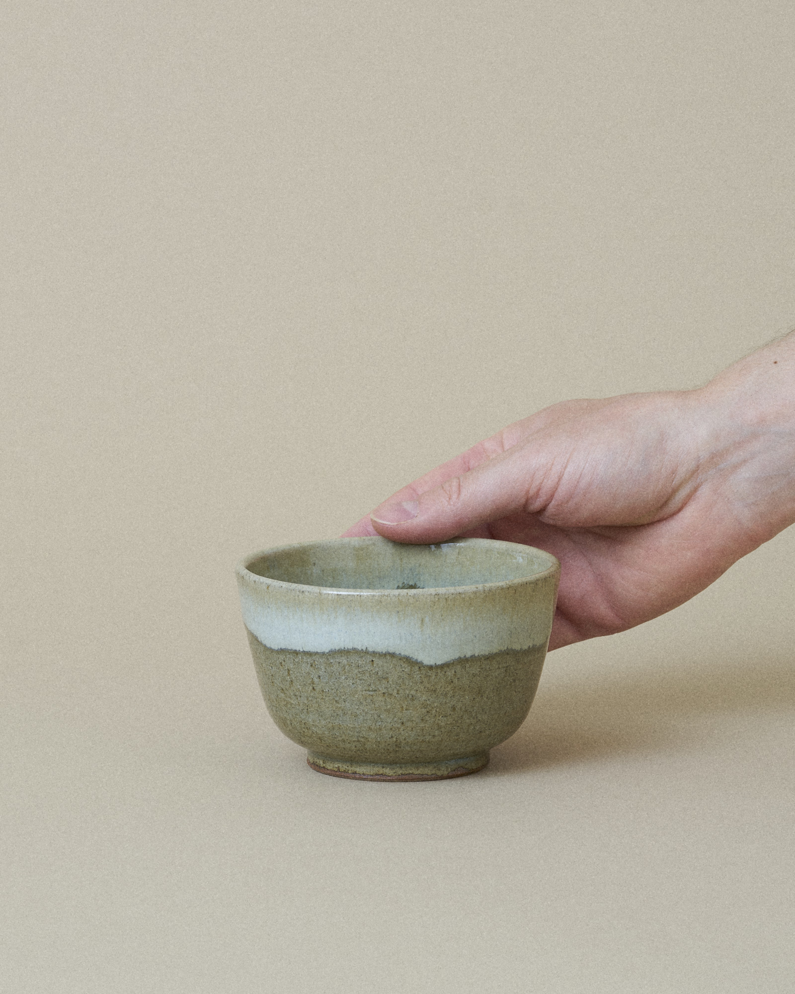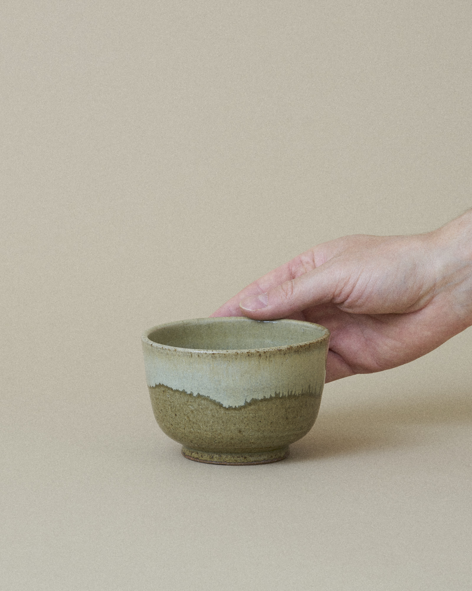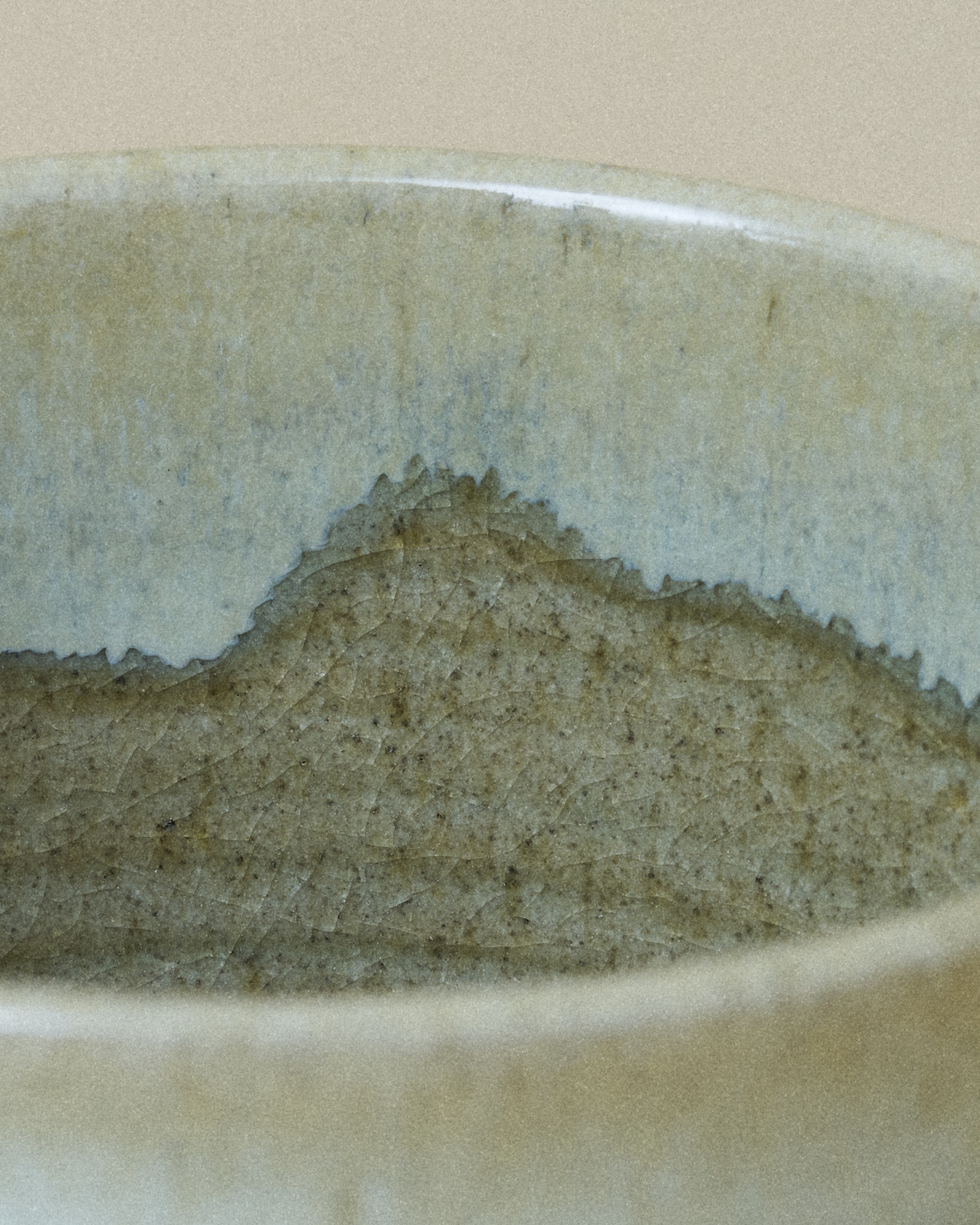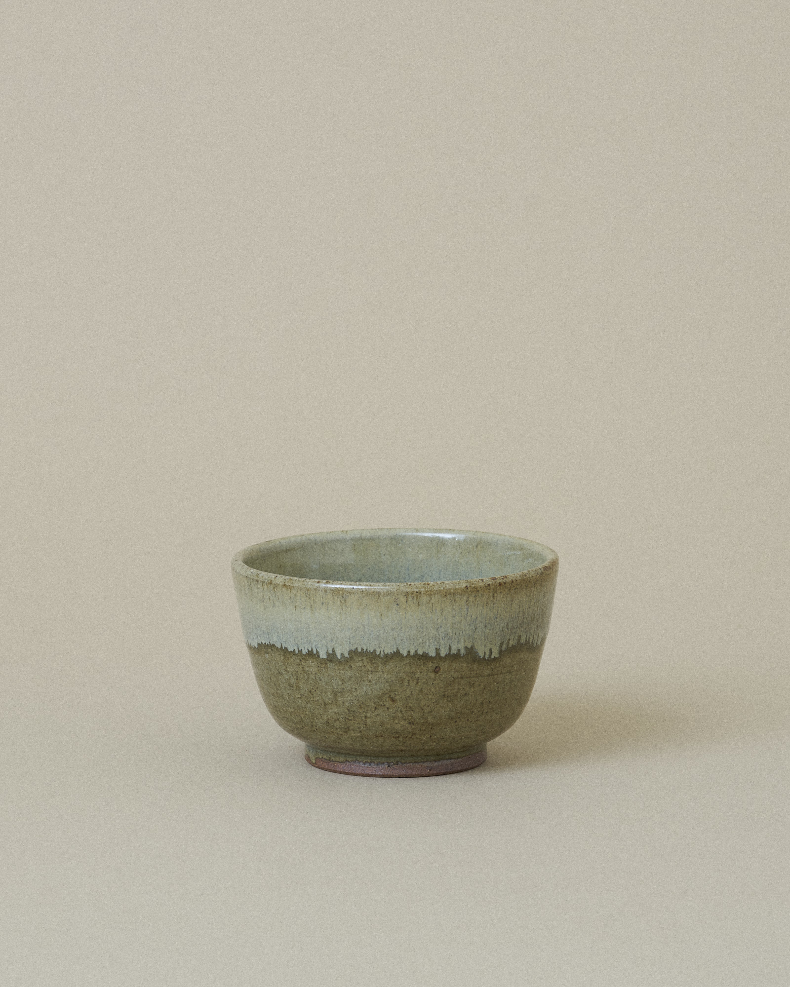 A pale sage green glaze cascades into a muted olive-brown base, creating a natural, organic gradient that flows seamlessly across both the interior and exterior of the bowl.