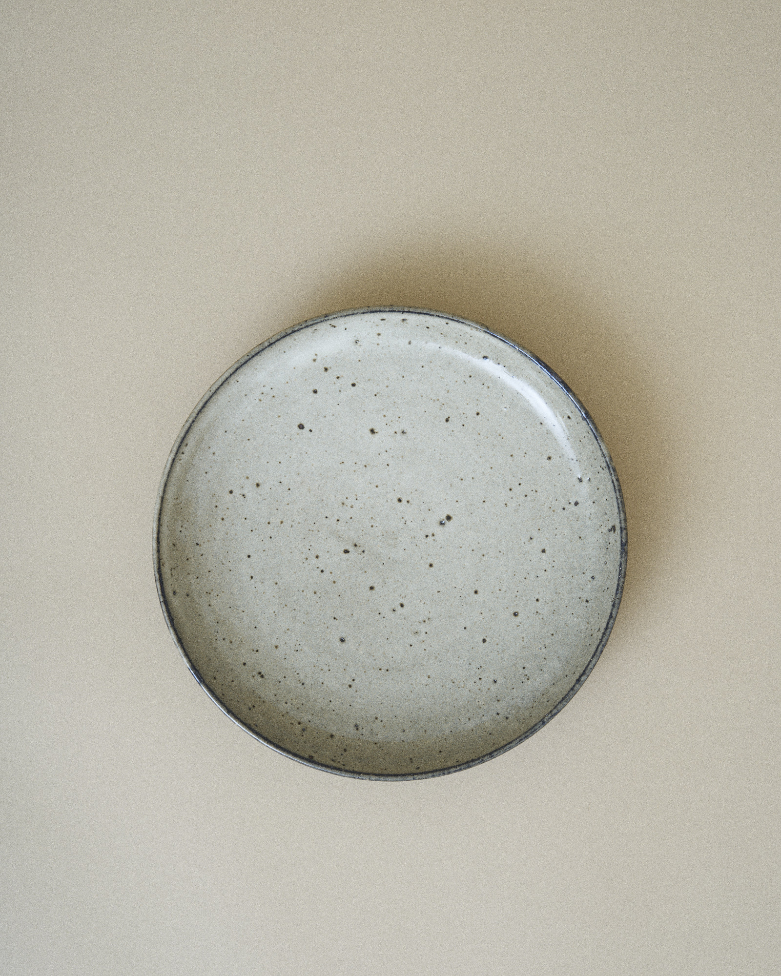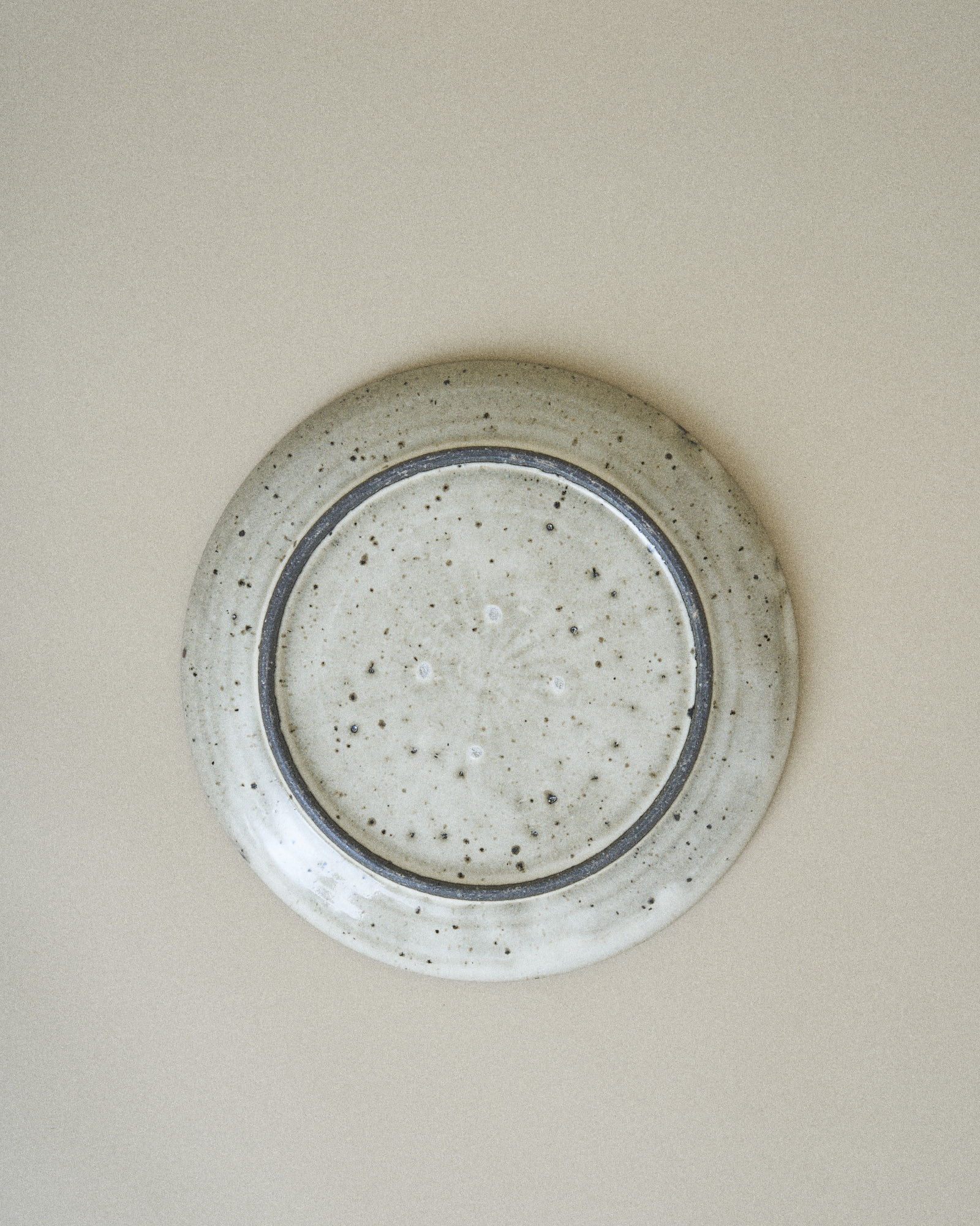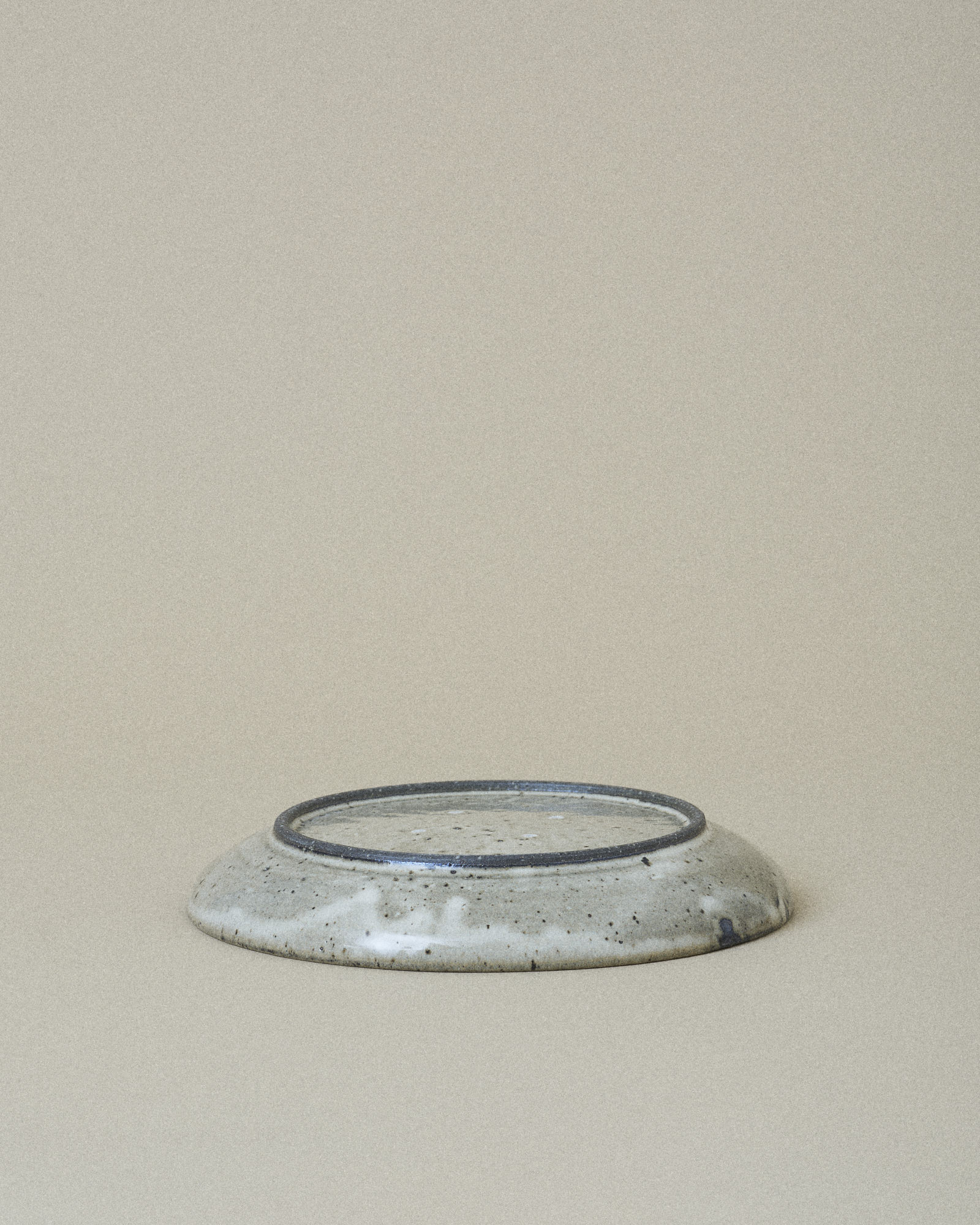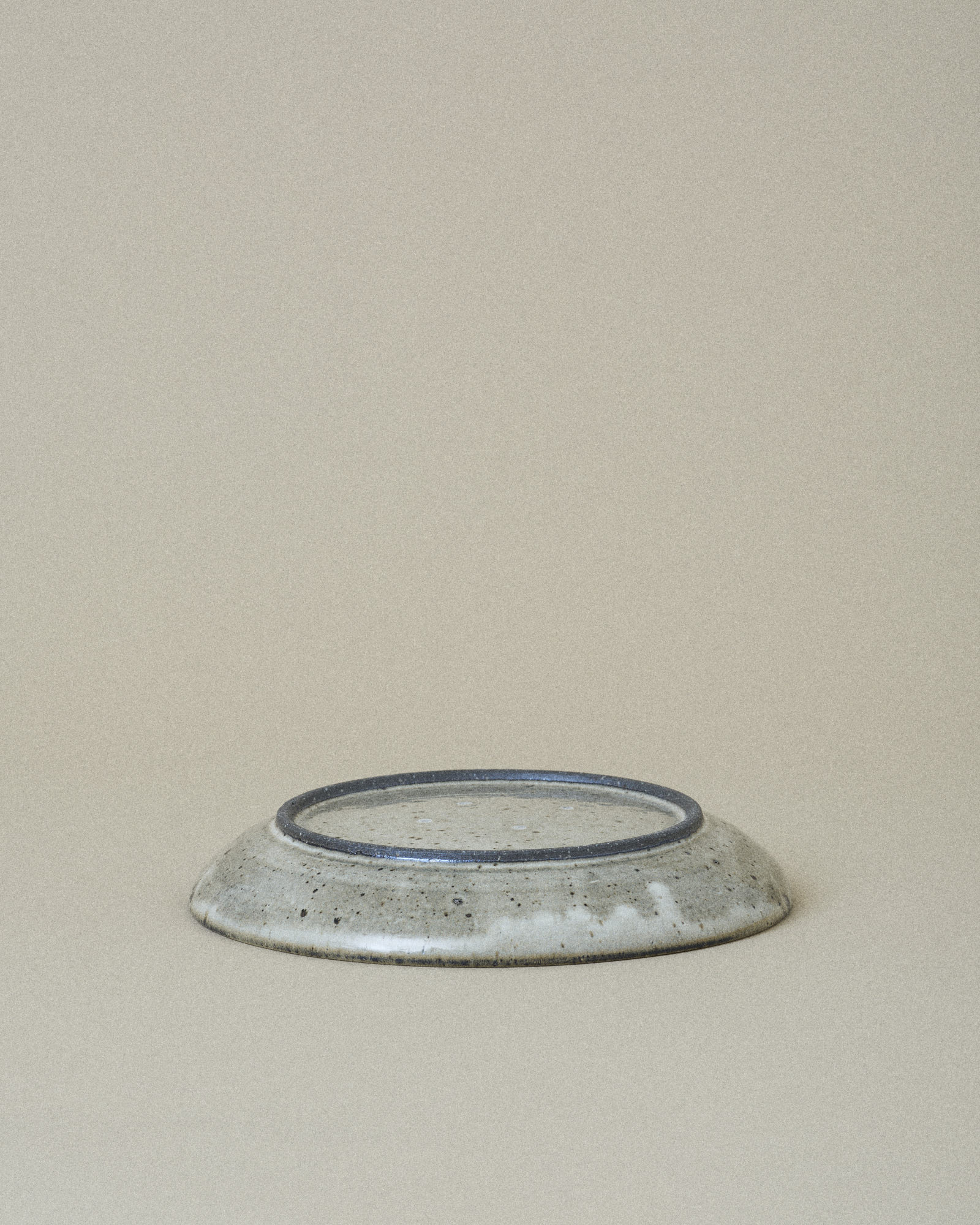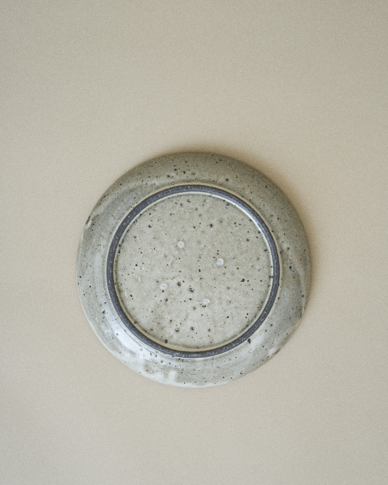 This plate’s surface is coated in a serene, speckled stone-grey glaze. A striking, dark charcoal rim beautifully frames the dish. The front and backside also showcase artful glaze variations, with white flowing streaks that highlight the plate’s unique handcrafted form.