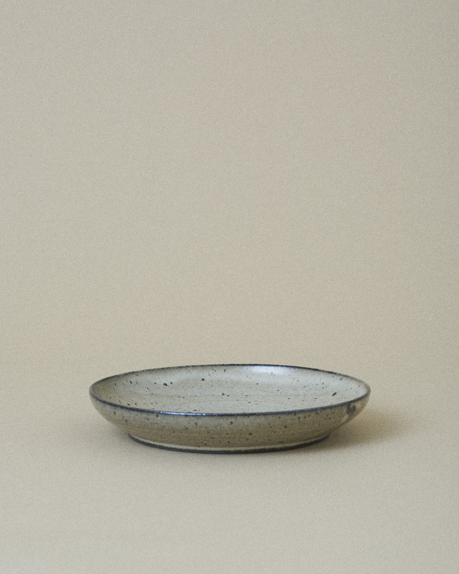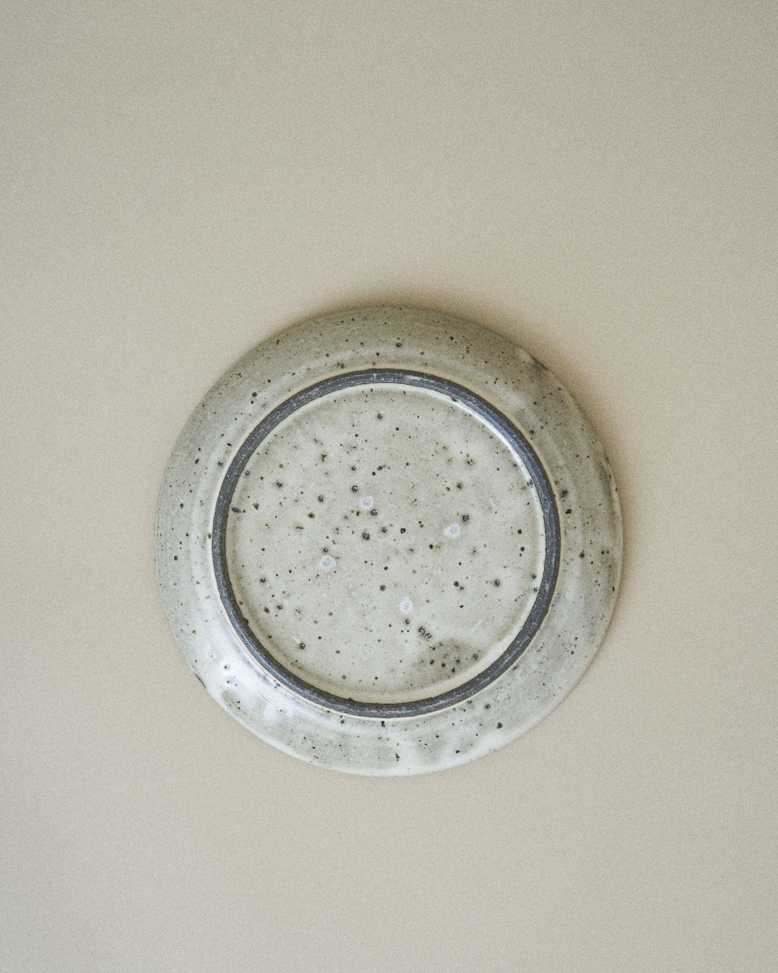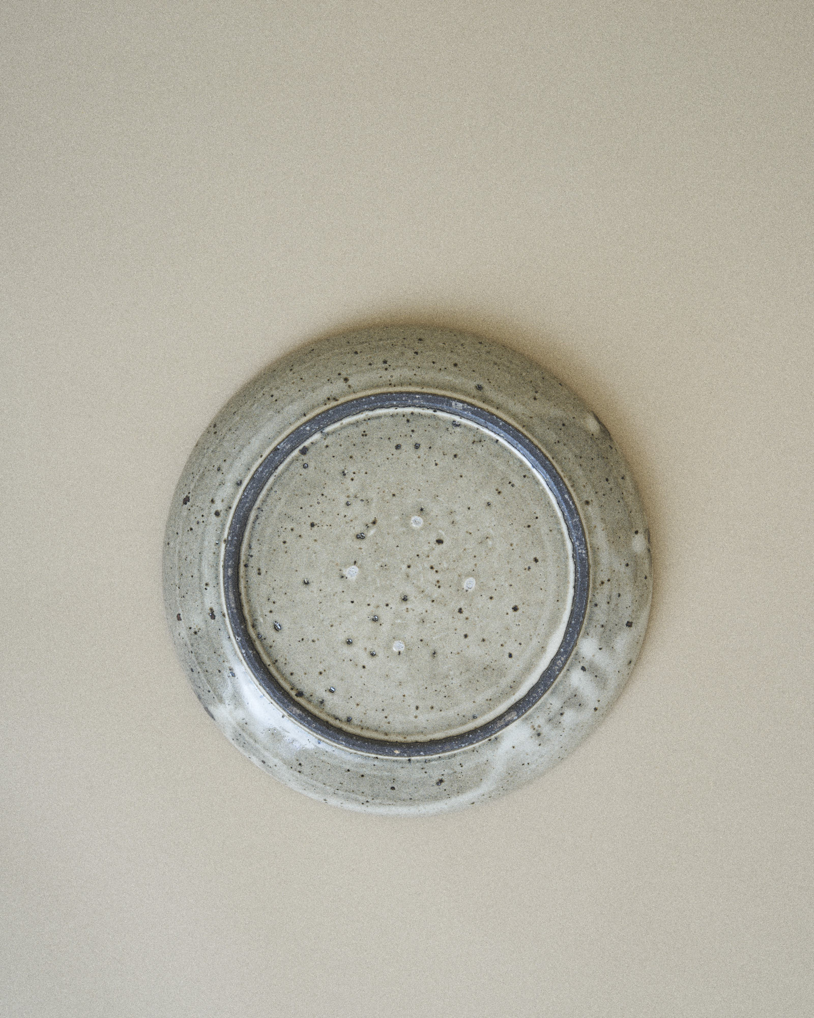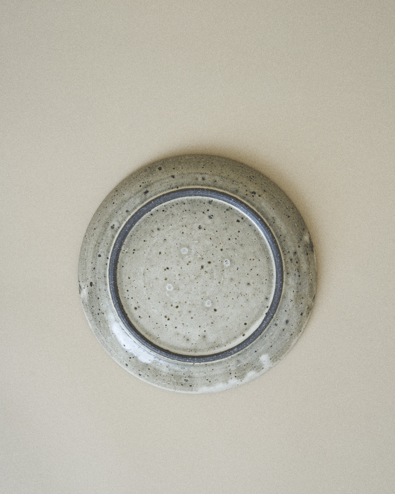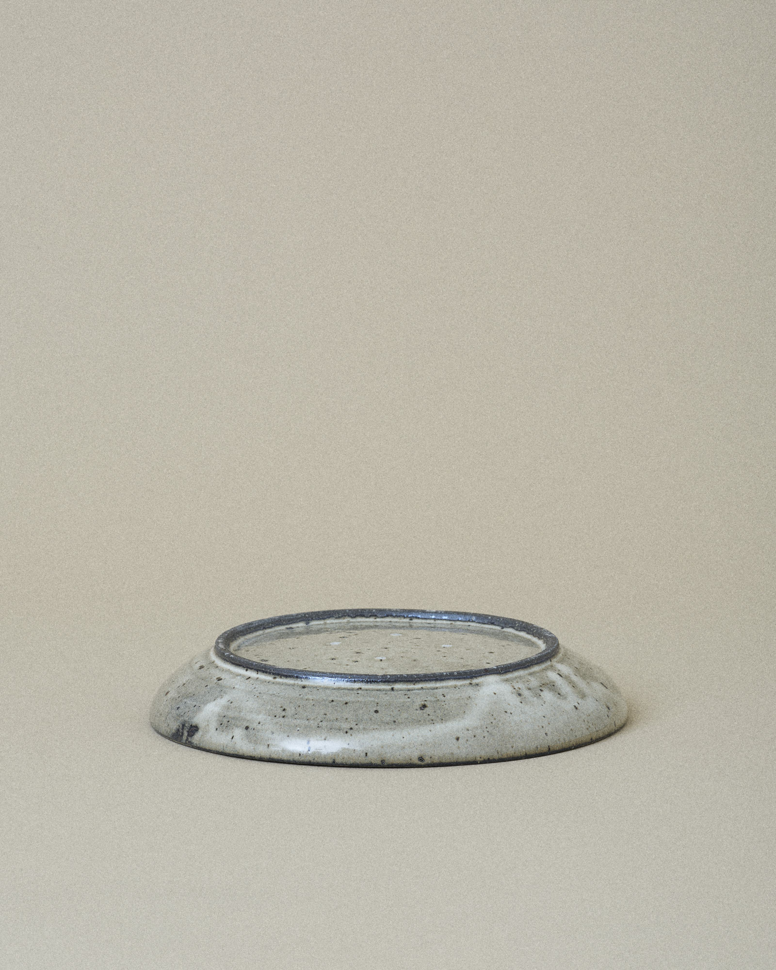 This plate’s surface is coated in a serene, speckled stone-grey glaze. A striking, dark charcoal rim beautifully frames the dish. The front and backside also showcase artful glaze variations, with white flowing streaks that highlight the plate’s unique handcrafted form.