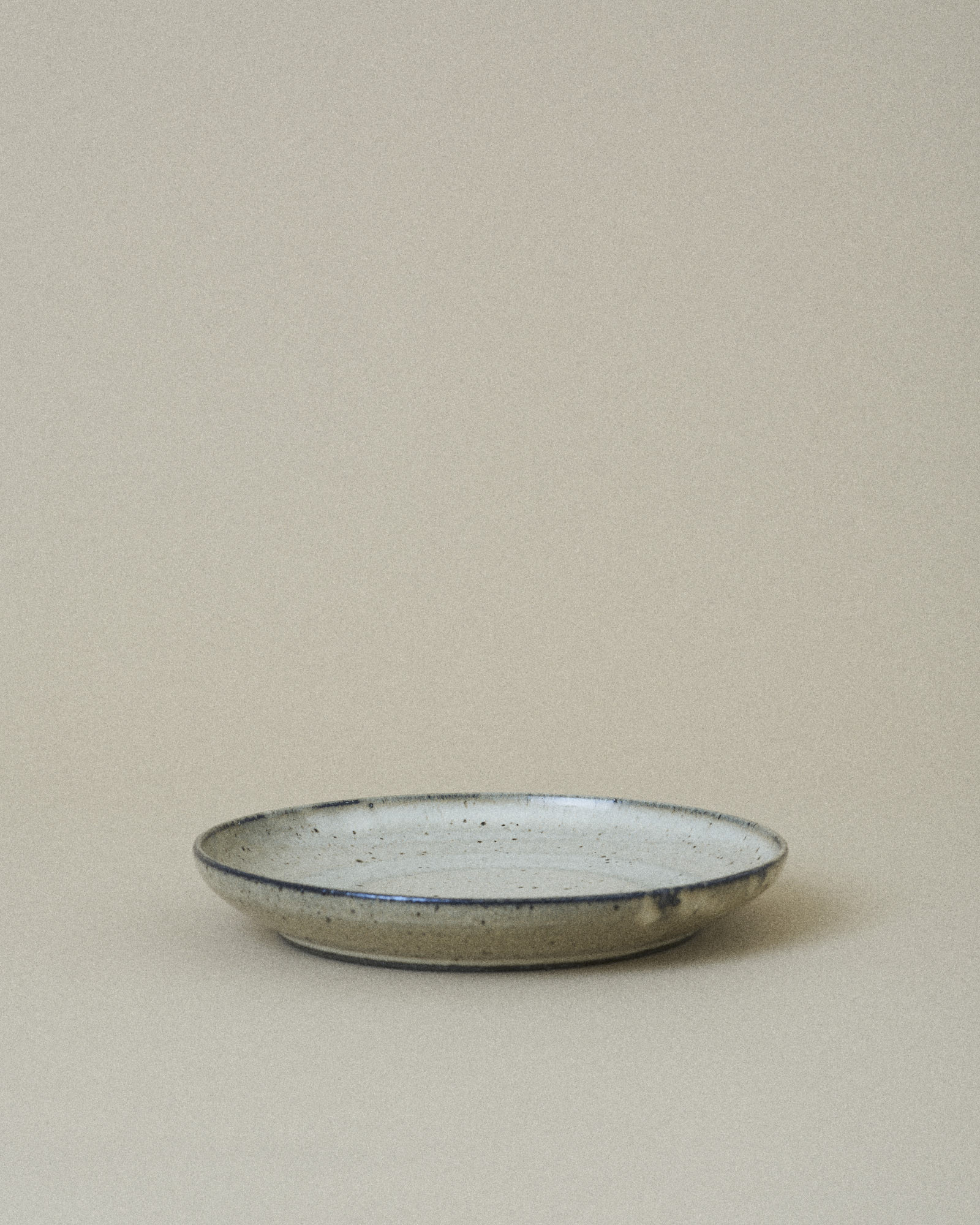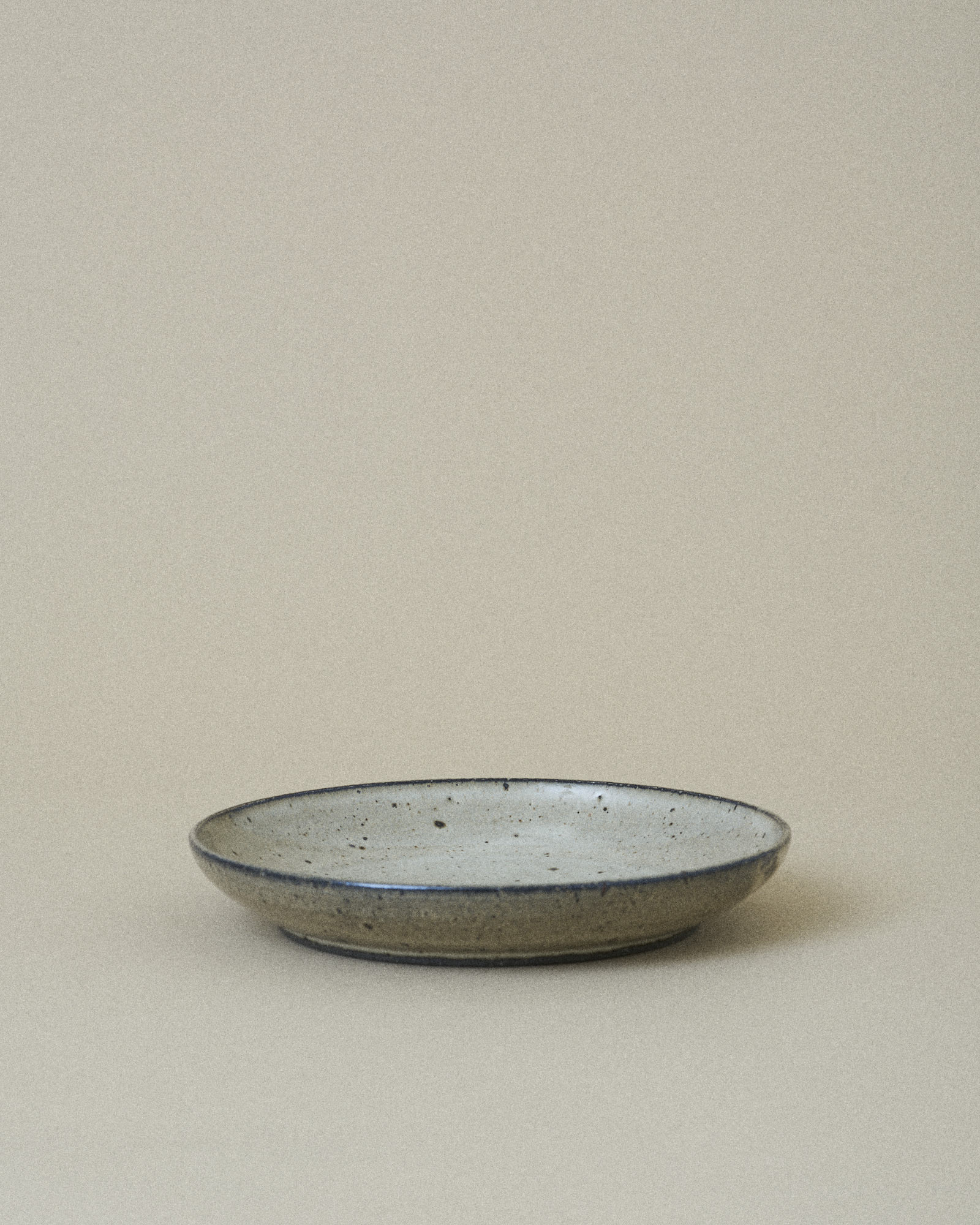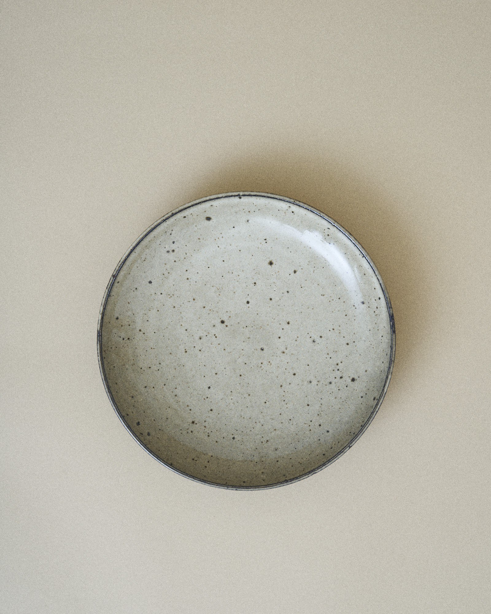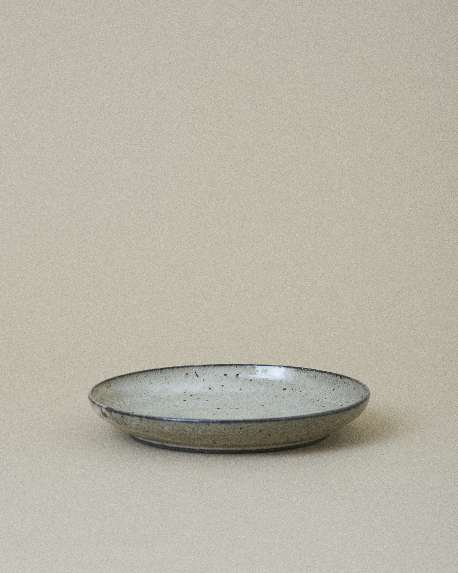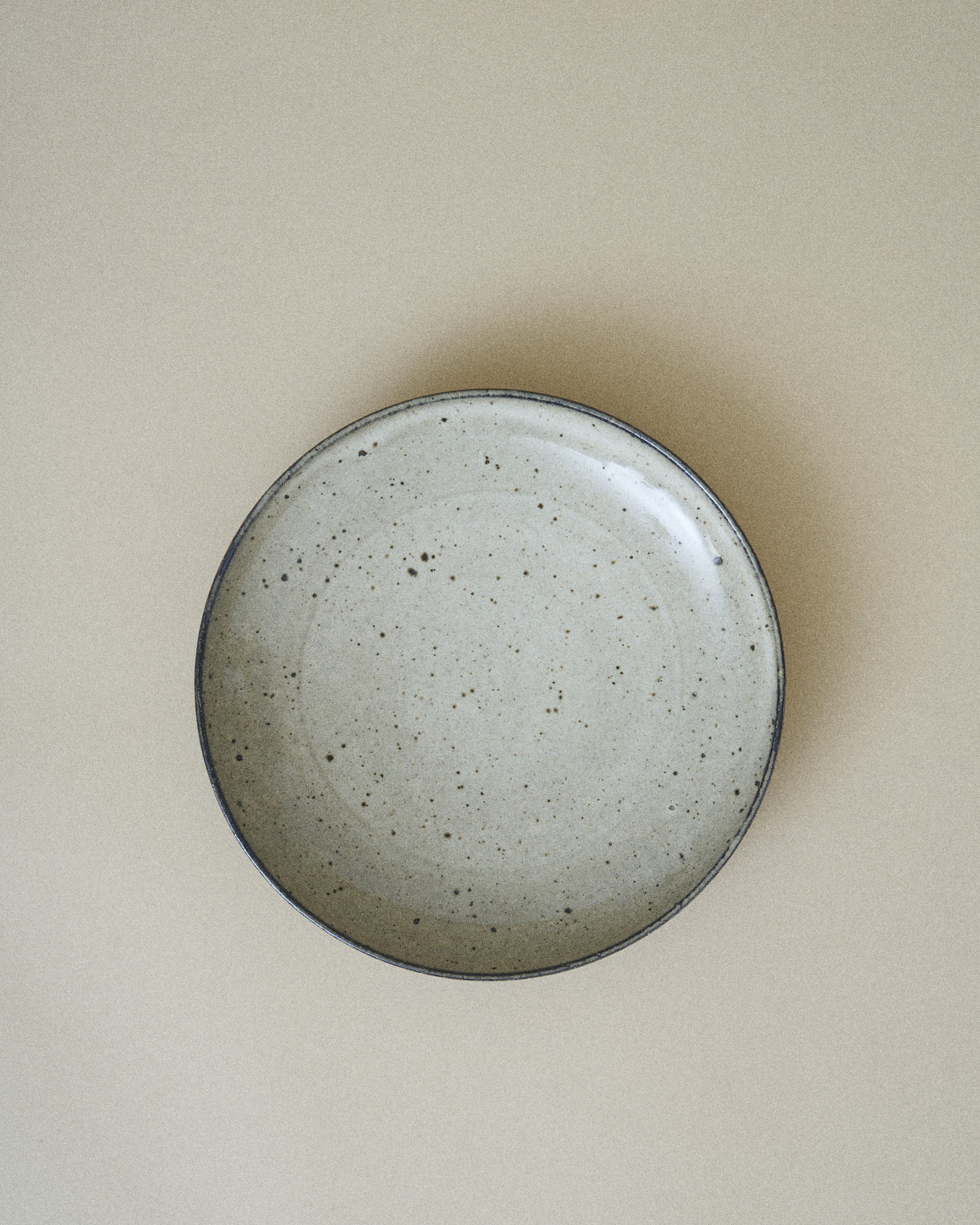 This plate’s surface is coated in a serene, speckled stone-grey glaze. A striking, dark charcoal rim beautifully frames the dish. The front and backside also showcase artful glaze variations, with white flowing streaks that highlight the plate’s unique handcrafted form.