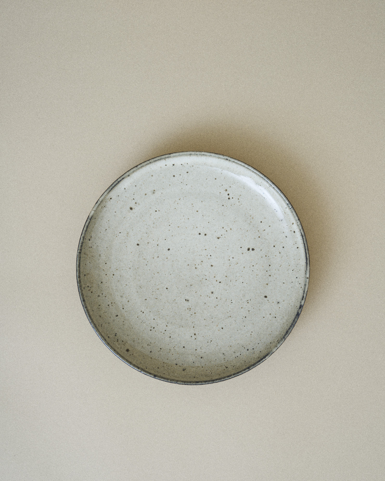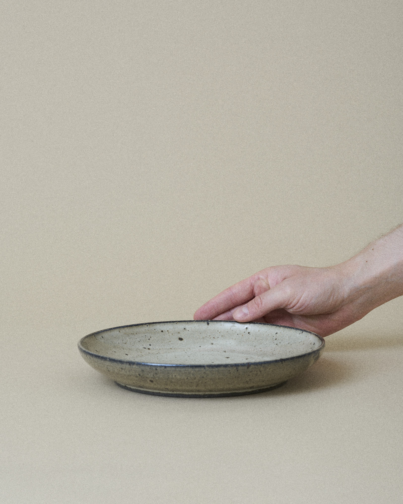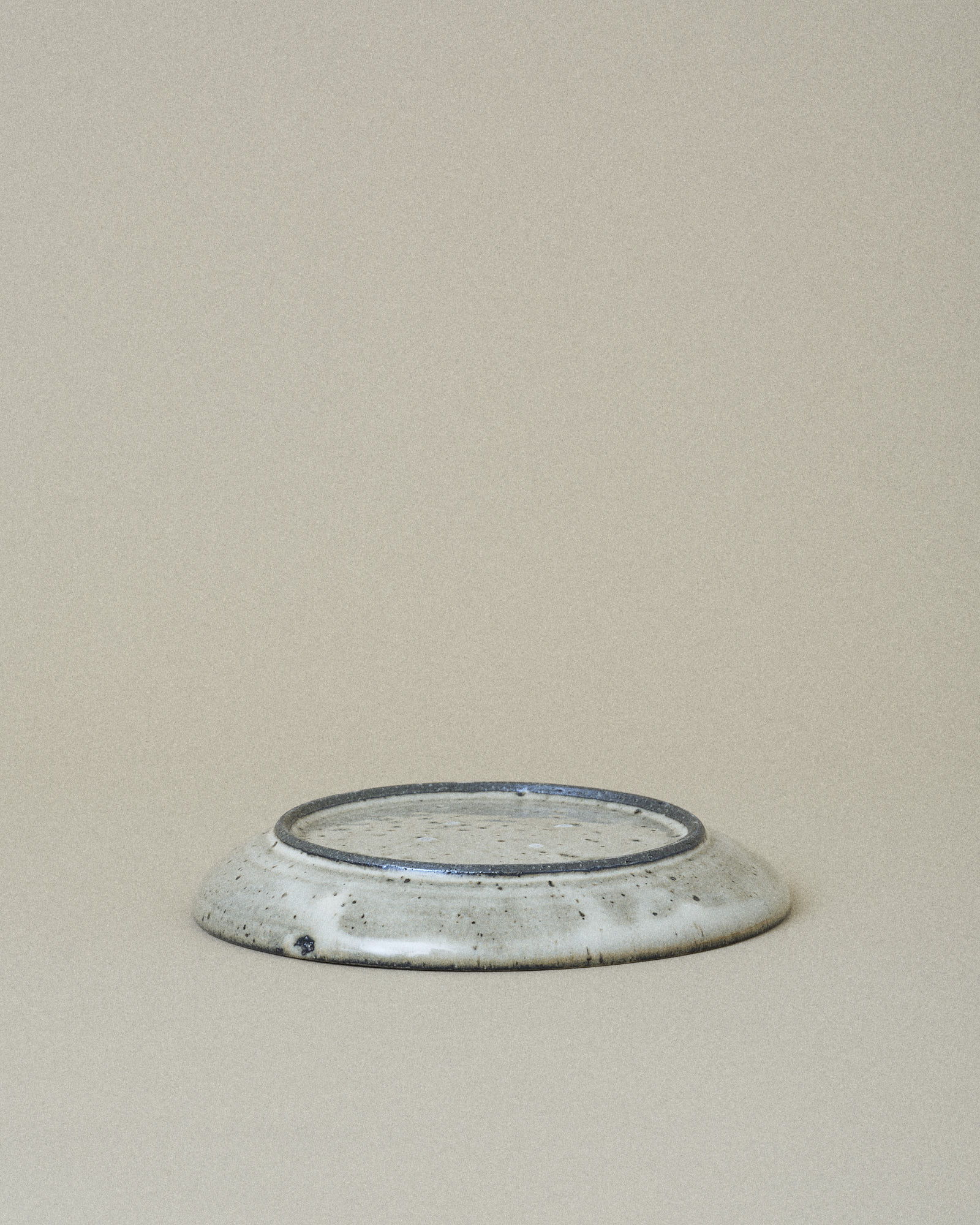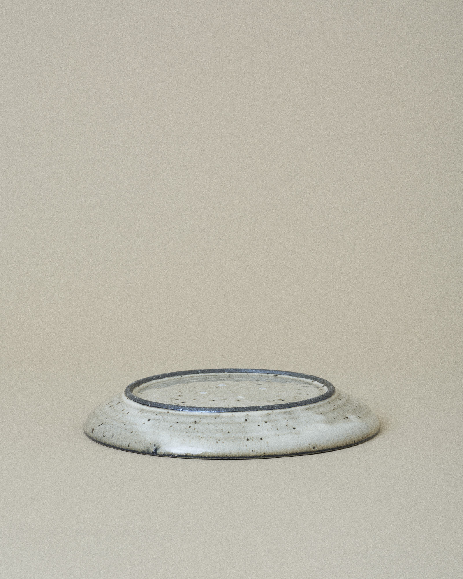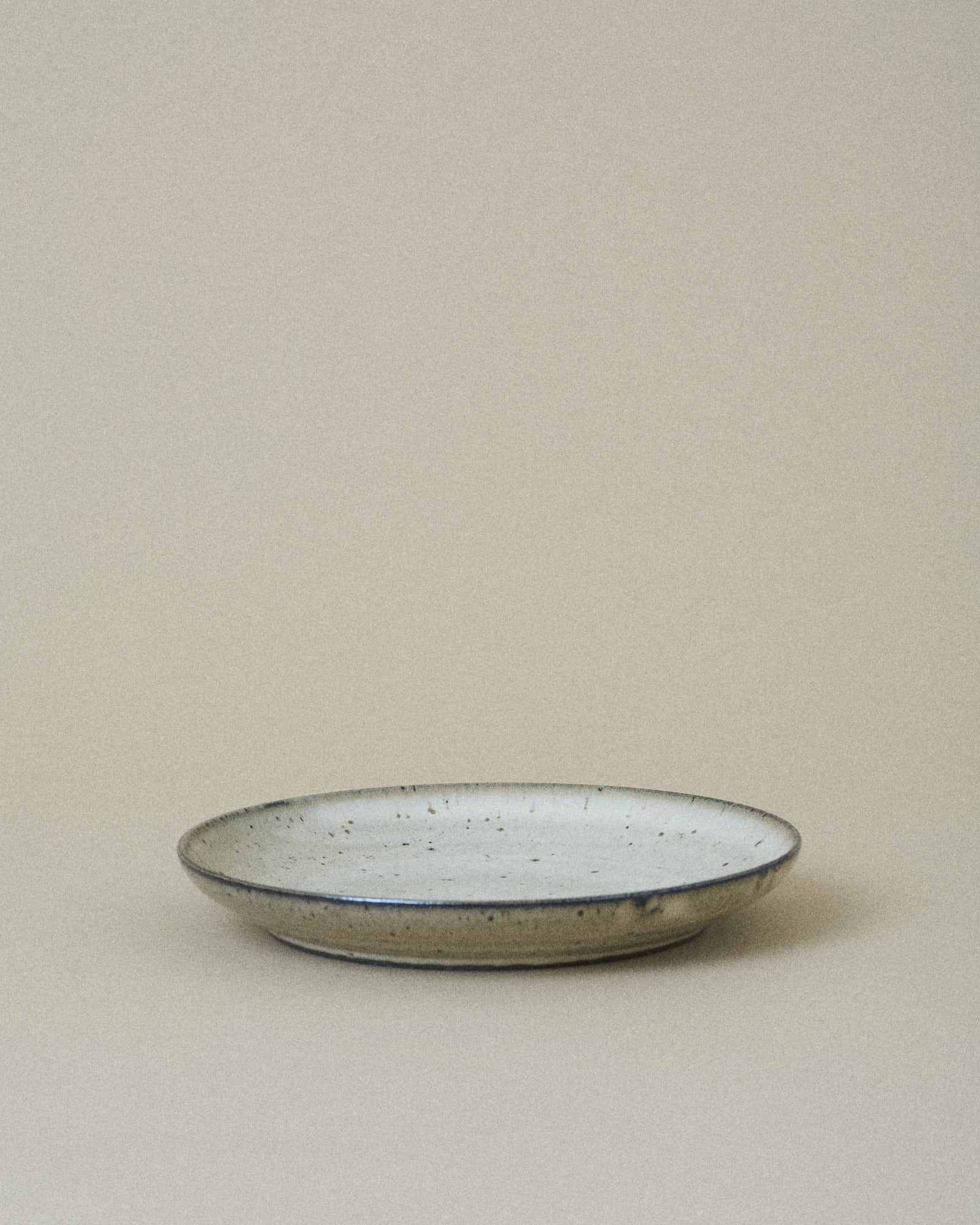 This plate’s surface is coated in a serene, speckled stone-grey glaze. A striking, dark charcoal rim beautifully frames the dish. The front and backside also showcase artful glaze variations, with white flowing streaks that highlight the plate’s unique handcrafted form.