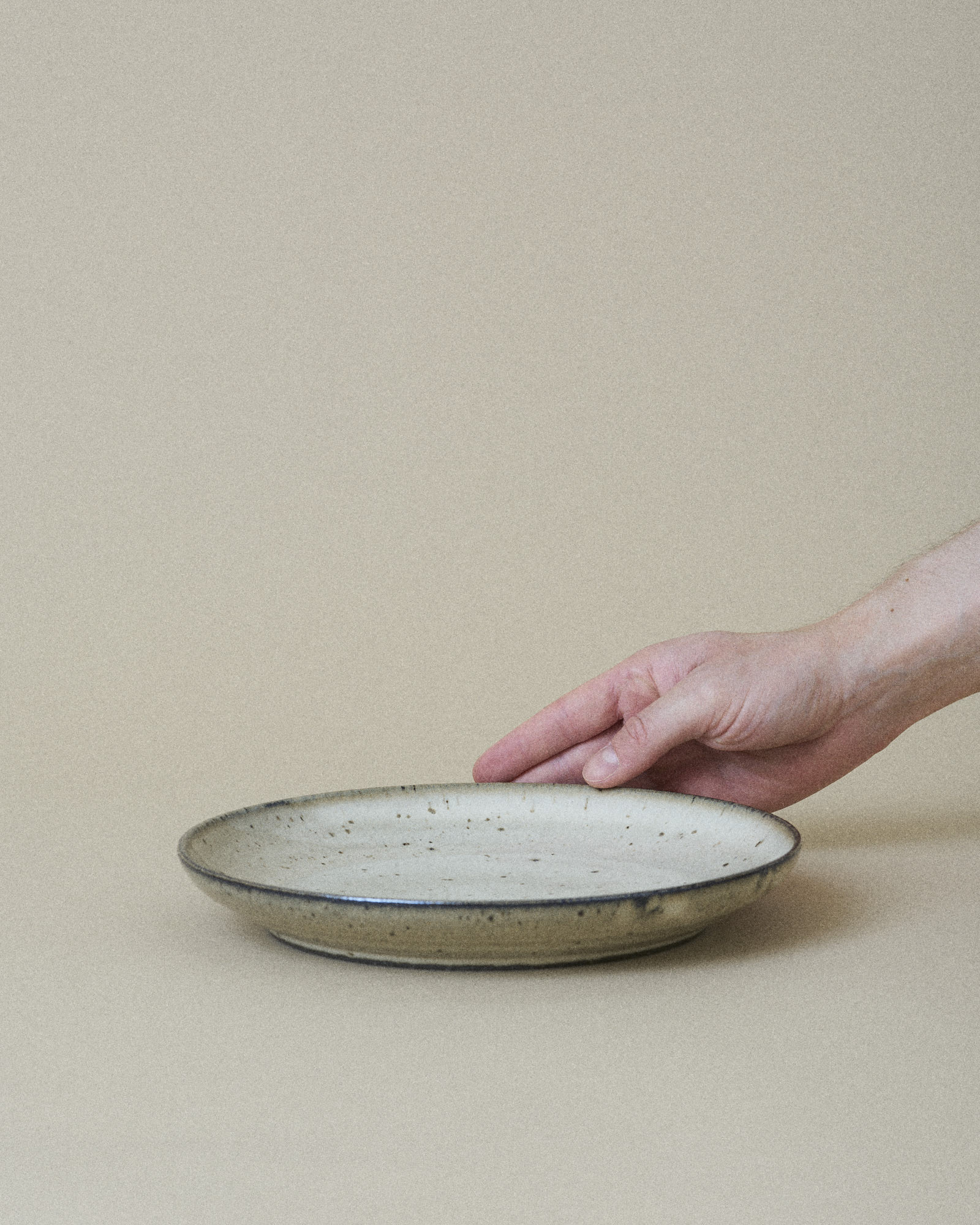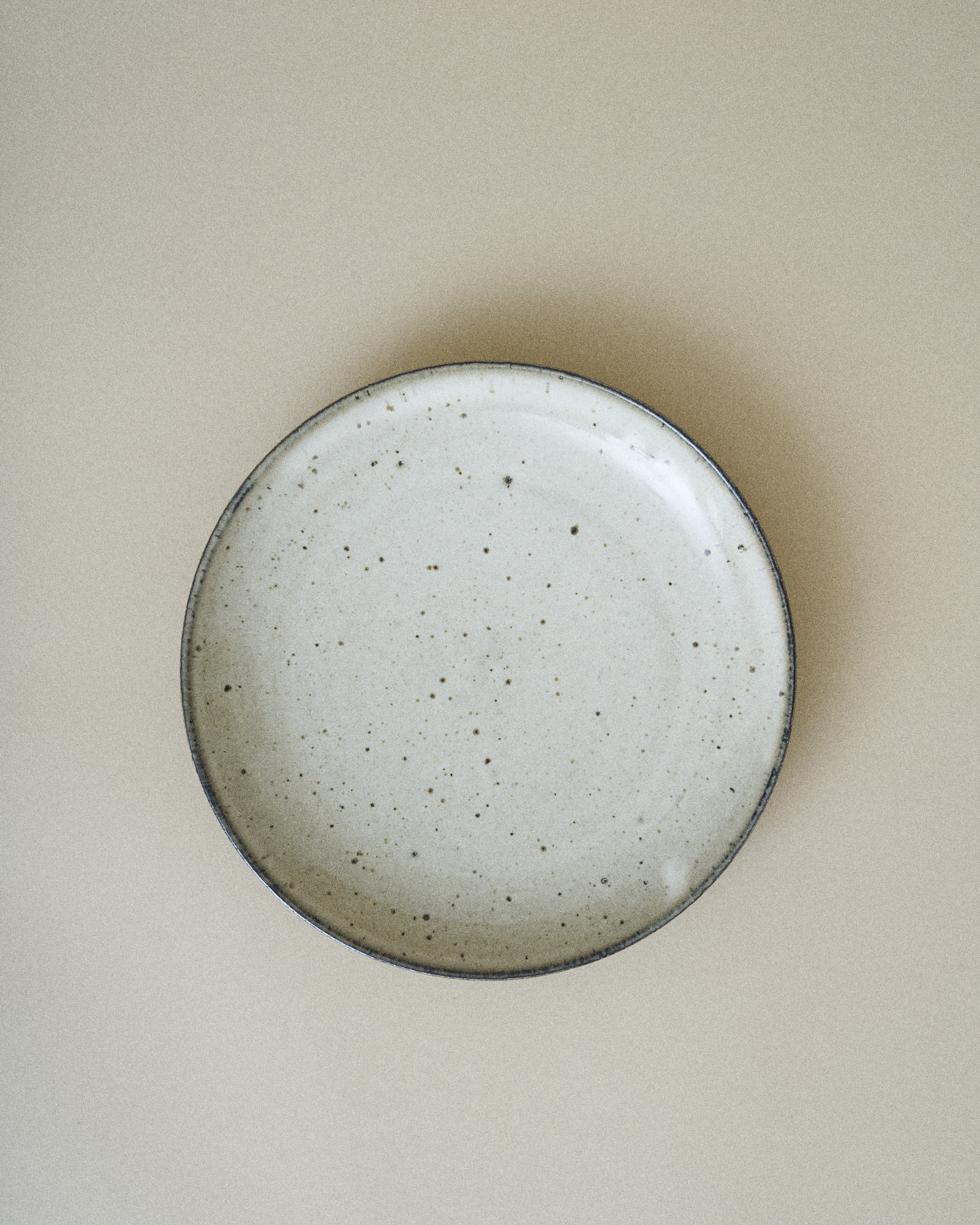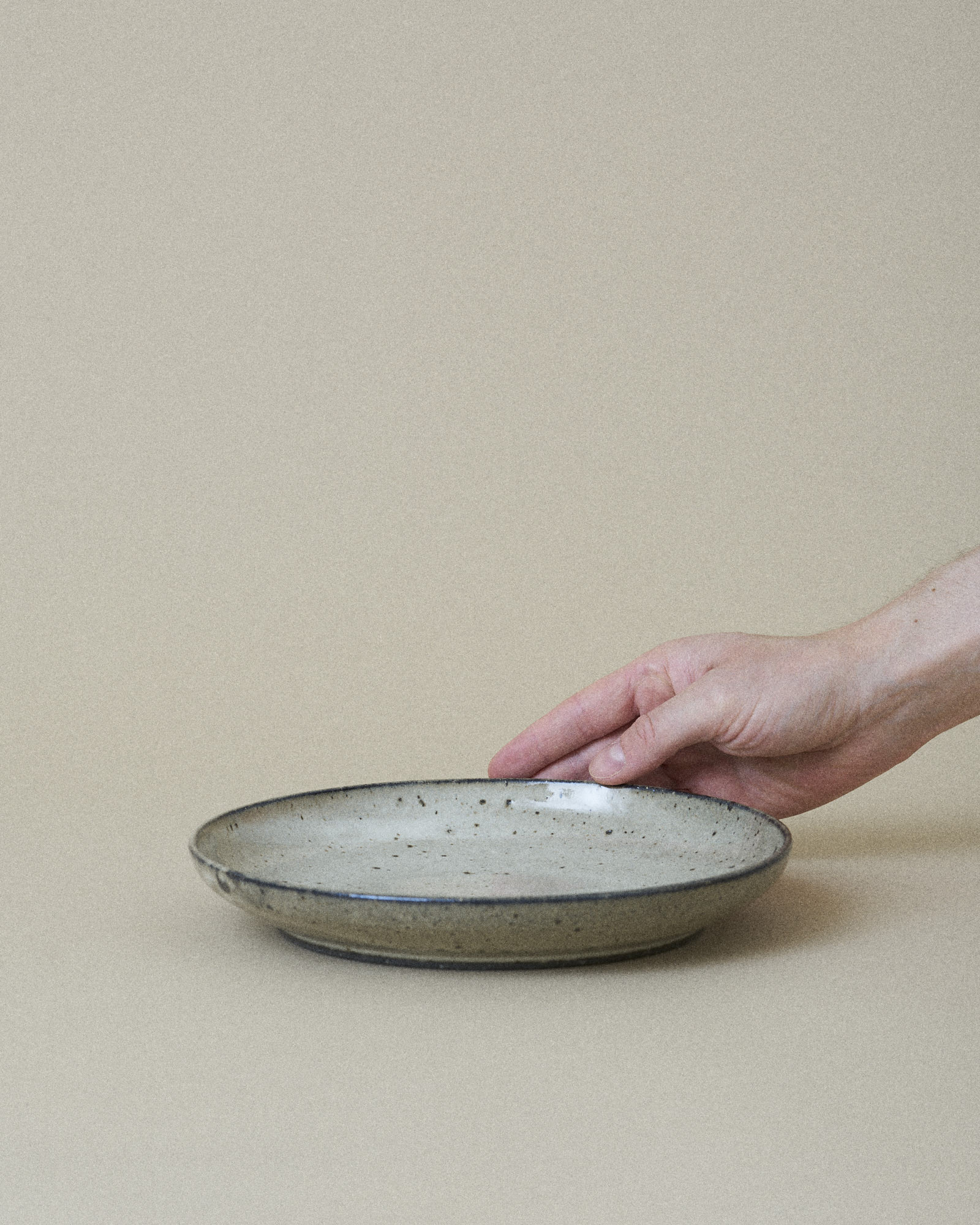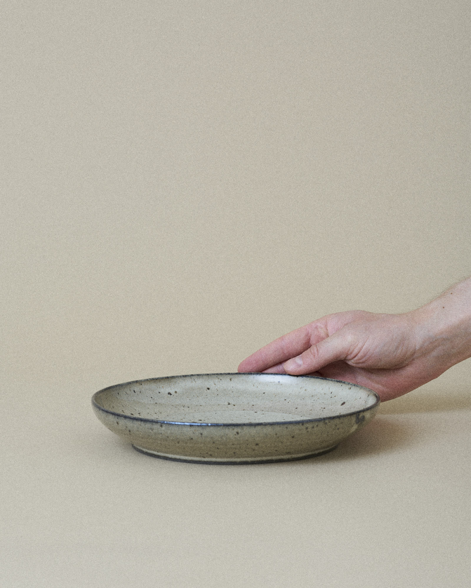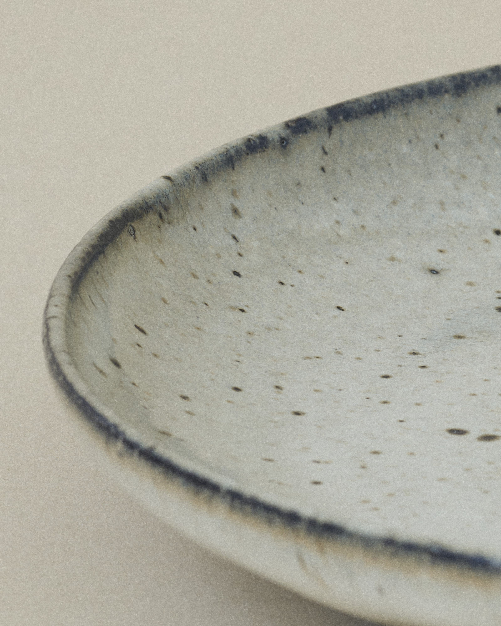 This plate’s surface is coated in a serene, speckled stone-grey glaze. A striking, dark charcoal rim beautifully frames the dish. The front and backside also showcase artful glaze variations, with white flowing streaks that highlight the plate’s unique handcrafted form.