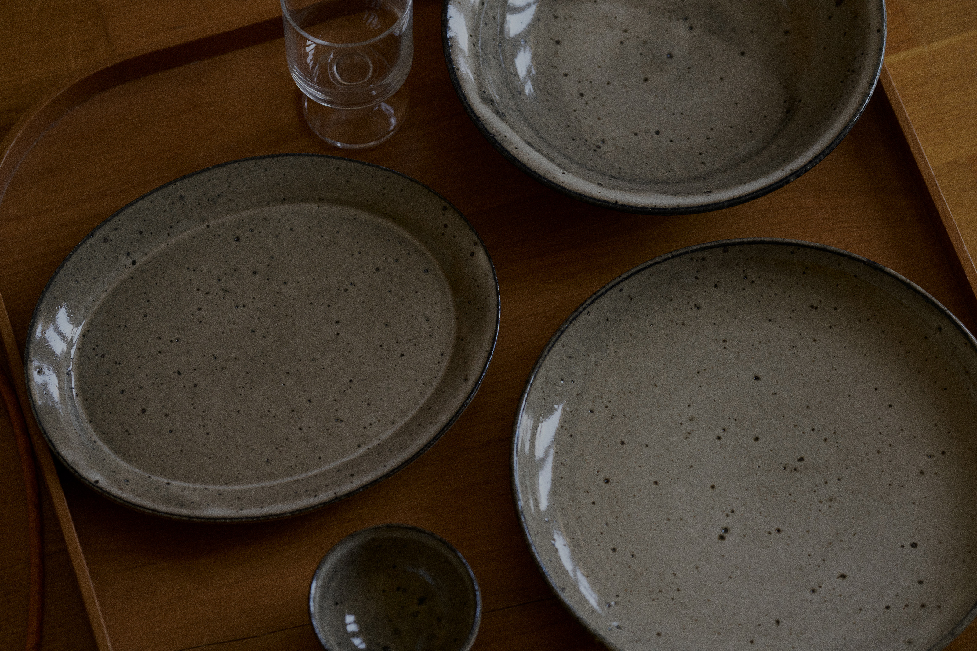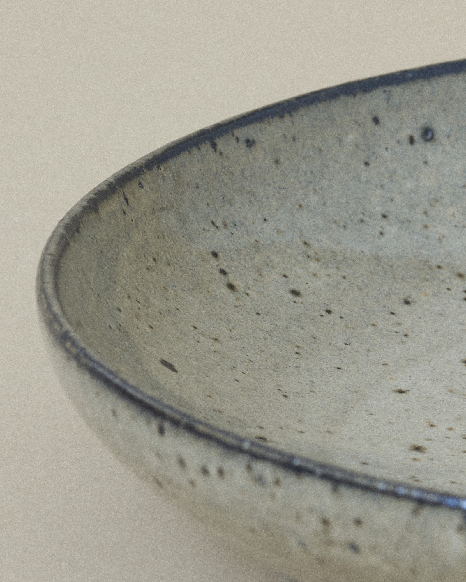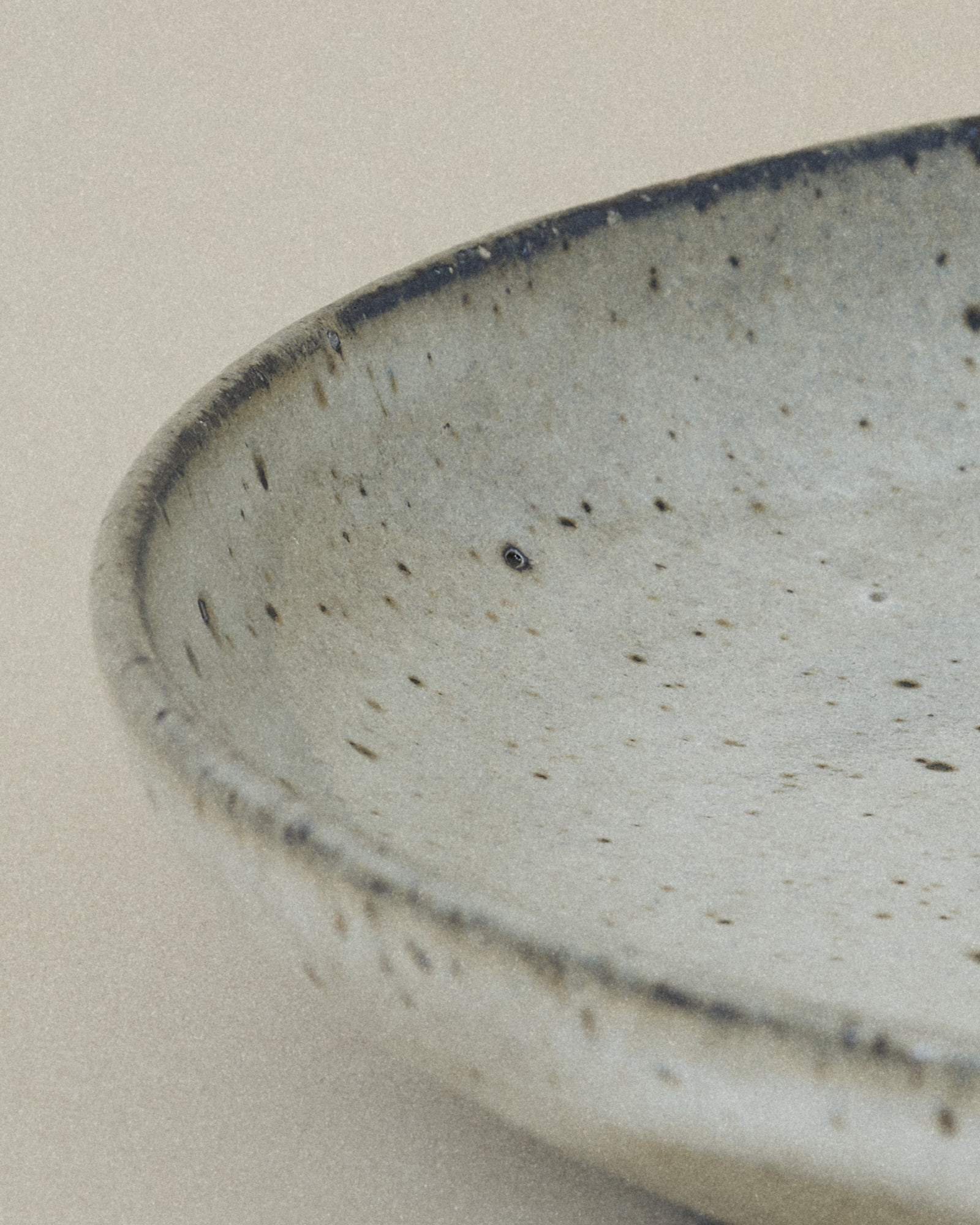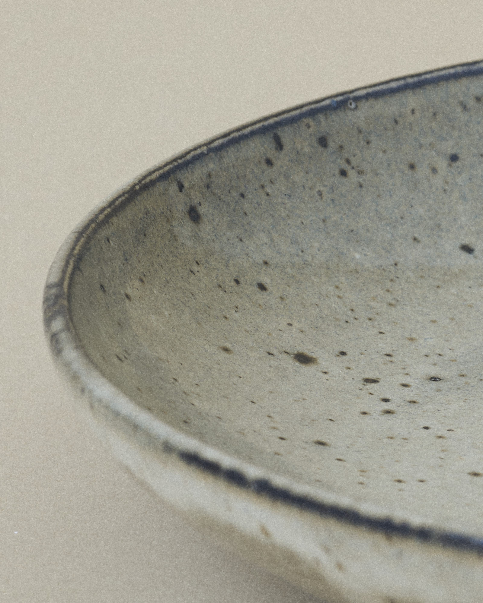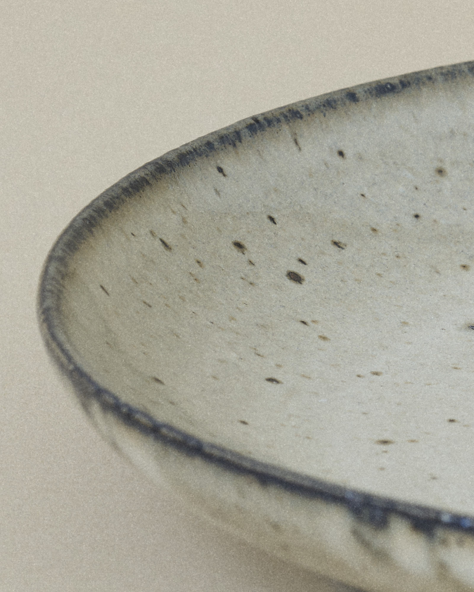 This plate’s surface is coated in a serene, speckled stone-grey glaze. A striking, dark charcoal rim beautifully frames the dish. The front and backside also showcase artful glaze variations, with white flowing streaks that highlight the plate’s unique handcrafted form.