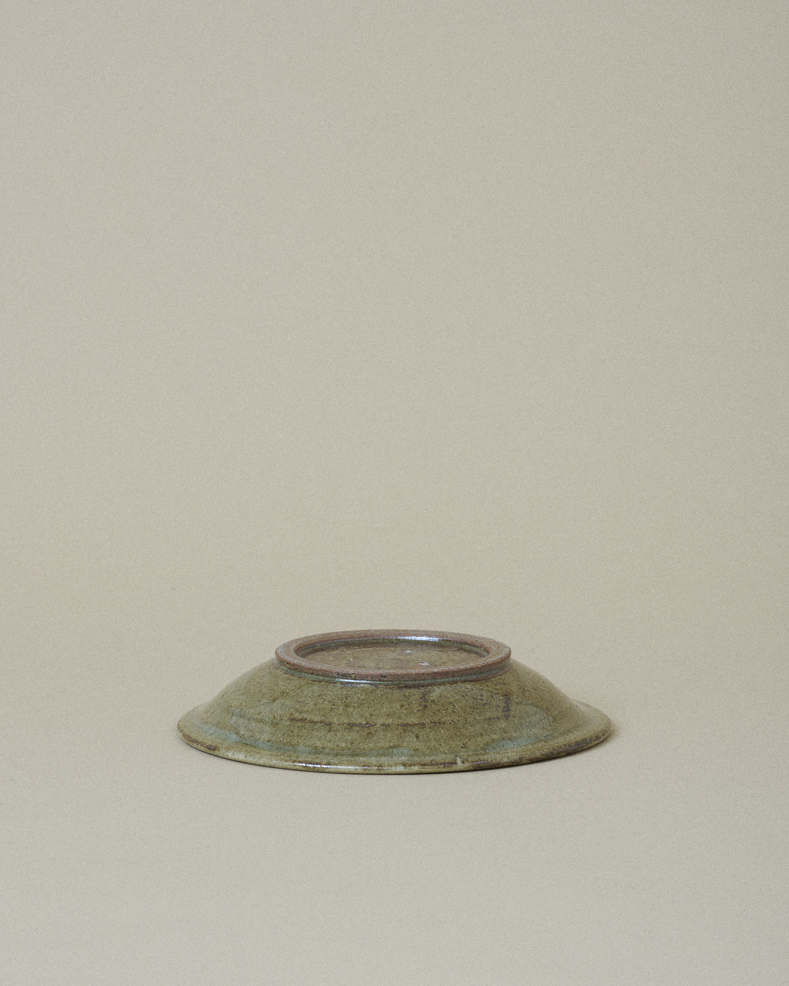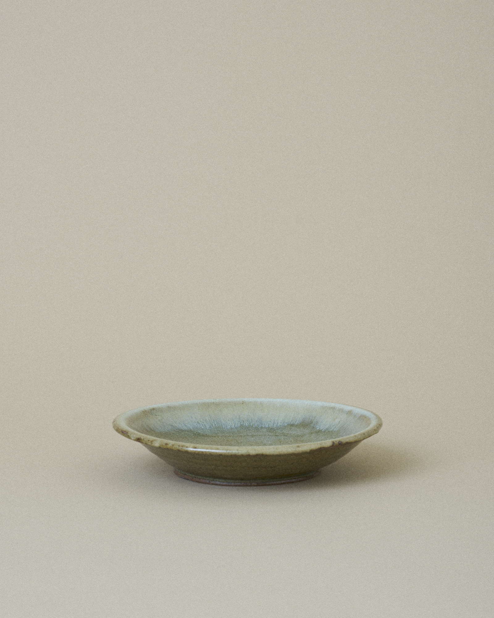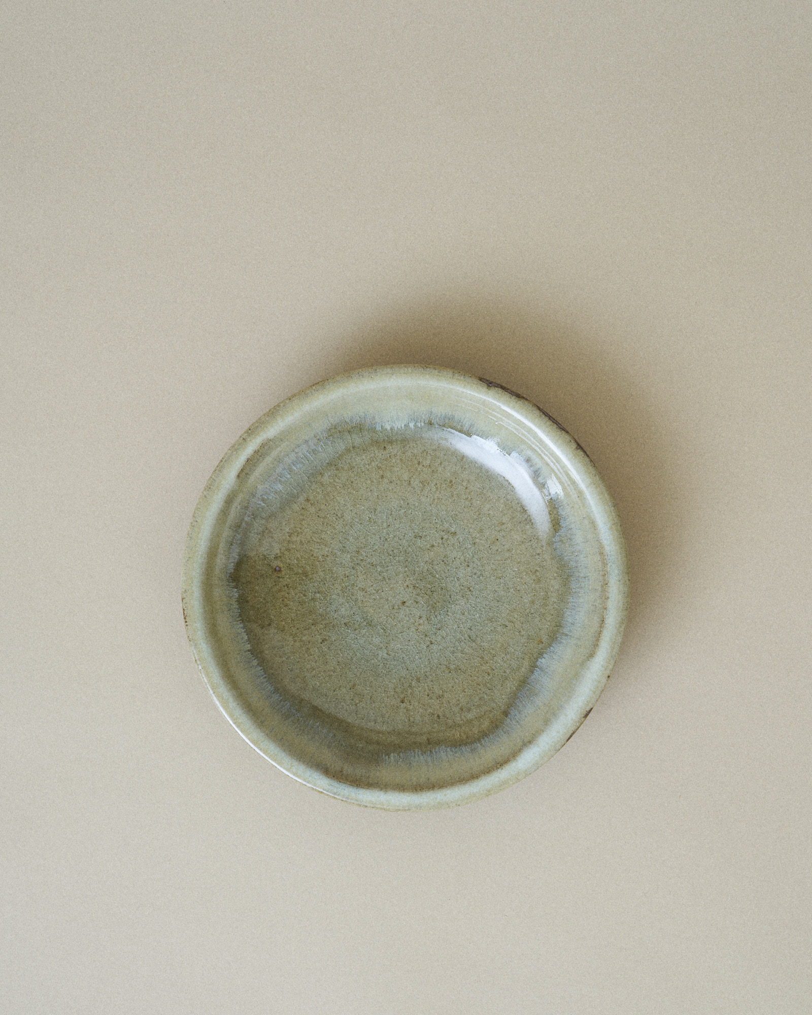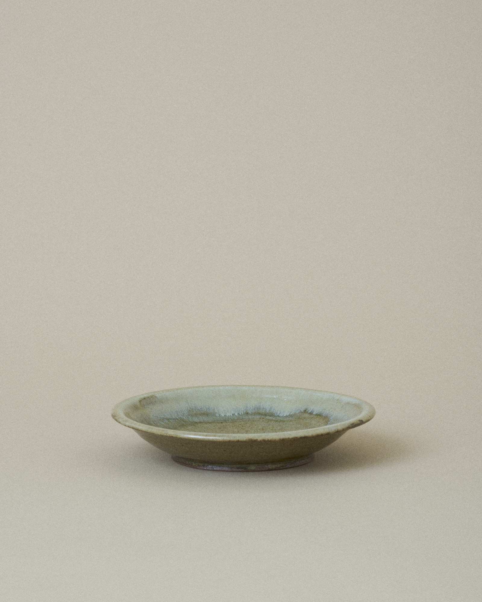 This plate features a tranquil, sage green glaze that fills the inner surface, artfully bordered by an irregular, pale turquoise rim that gently flows down the edge. This organic transition of color highlights the plate’s handmade quality.