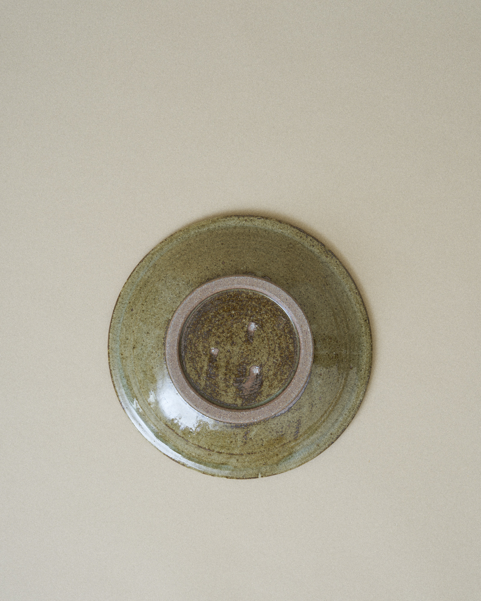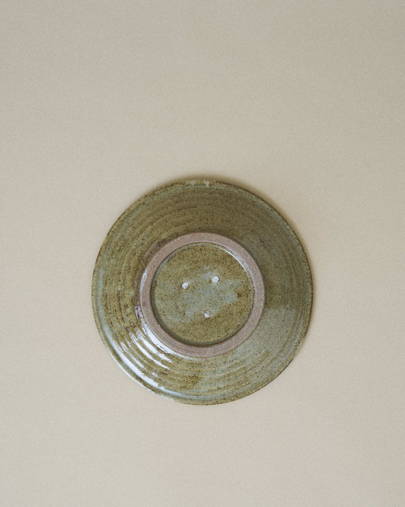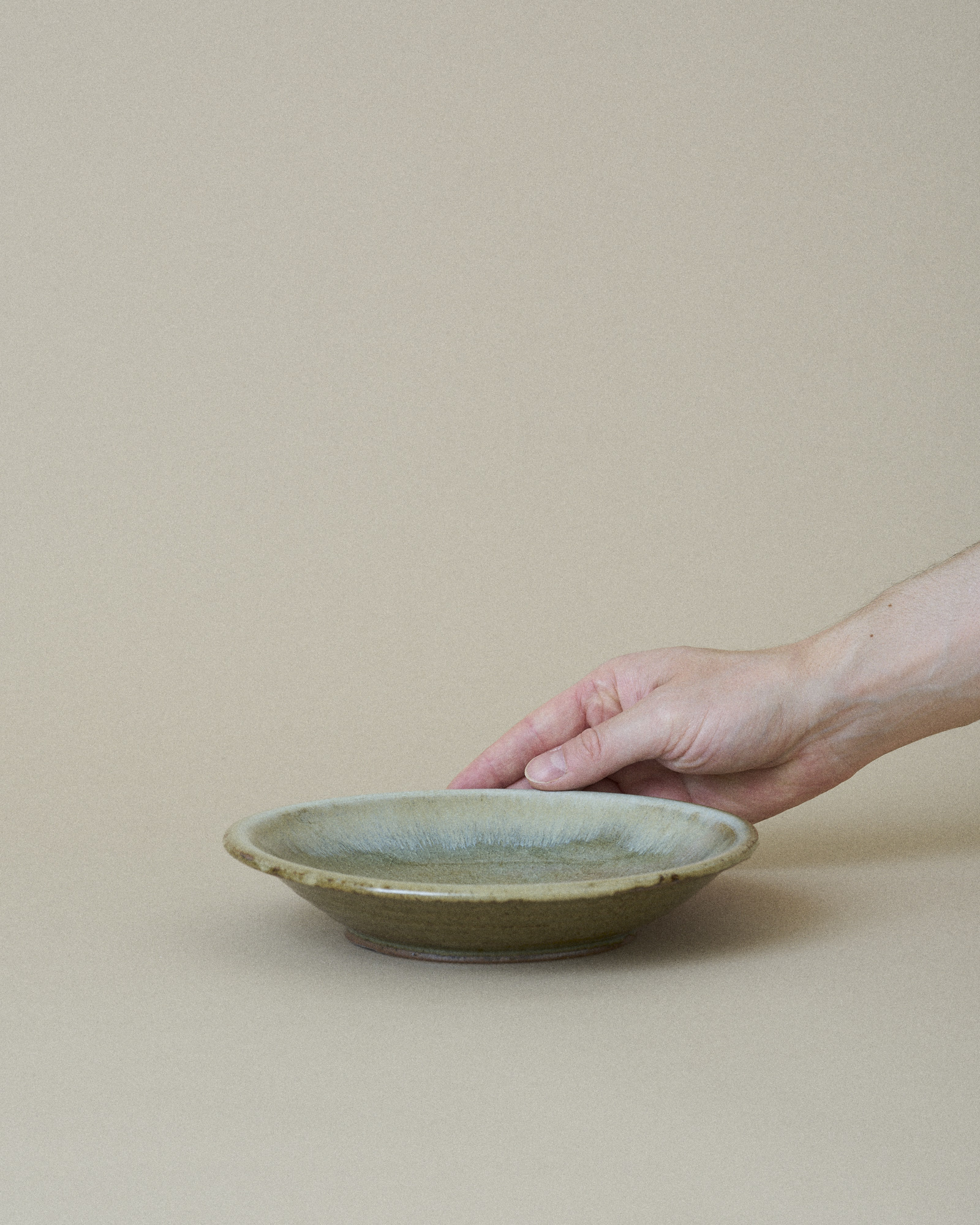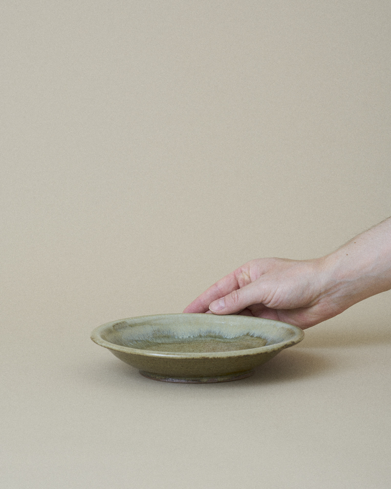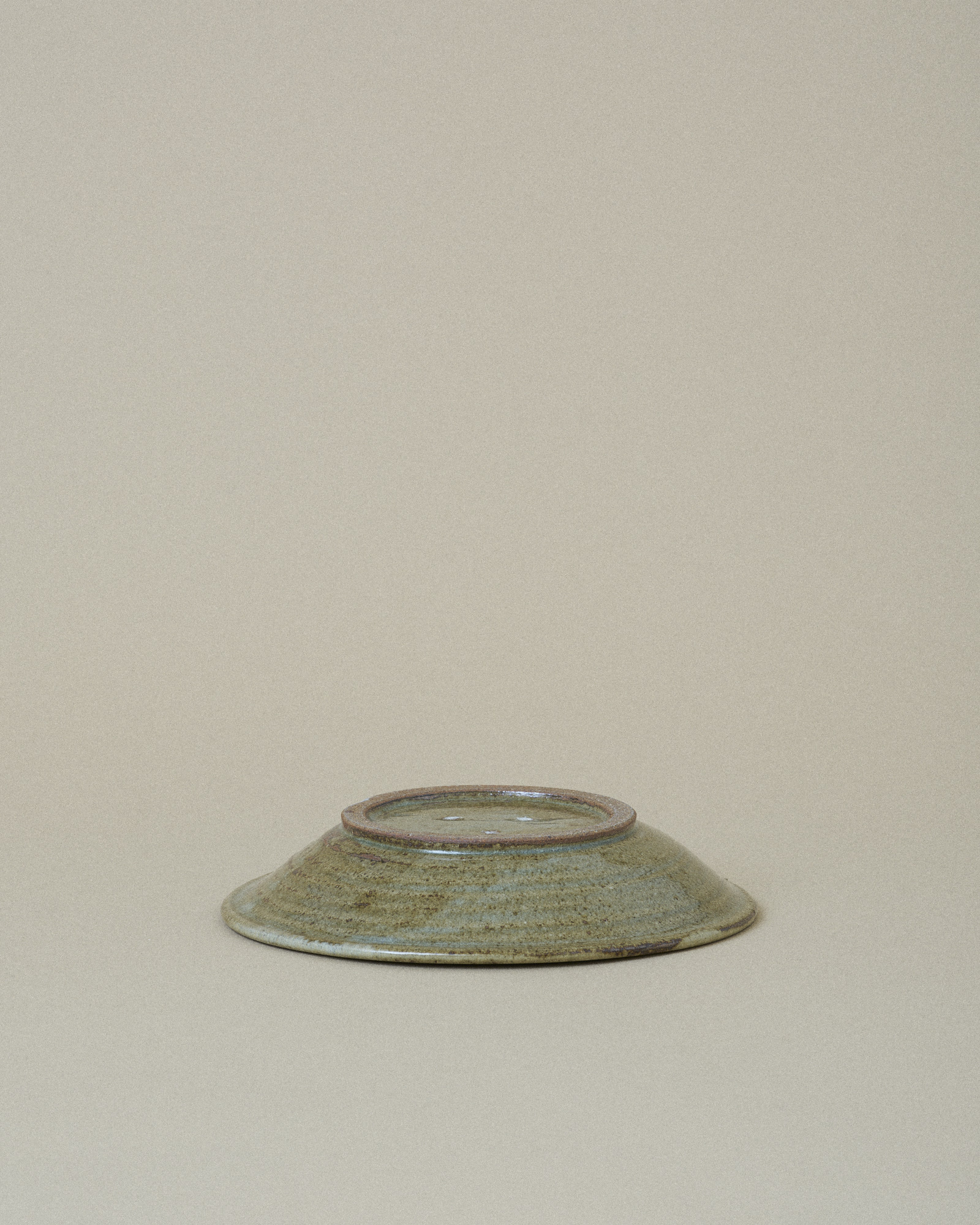 This plate features a tranquil, sage green glaze that fills the inner surface, artfully bordered by an irregular, pale turquoise rim that gently flows down the edge. This organic transition of color highlights the plate’s handmade quality.