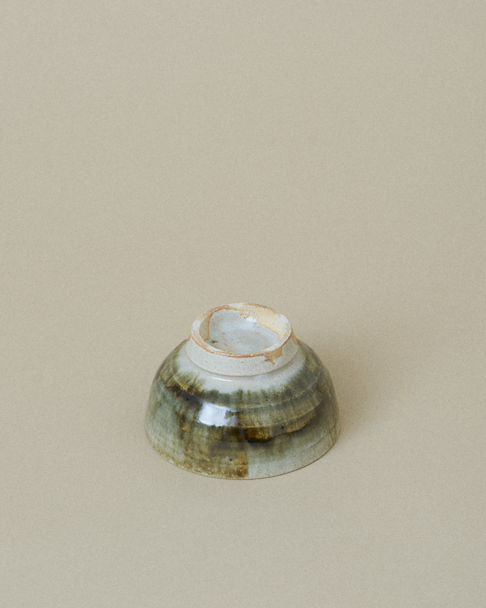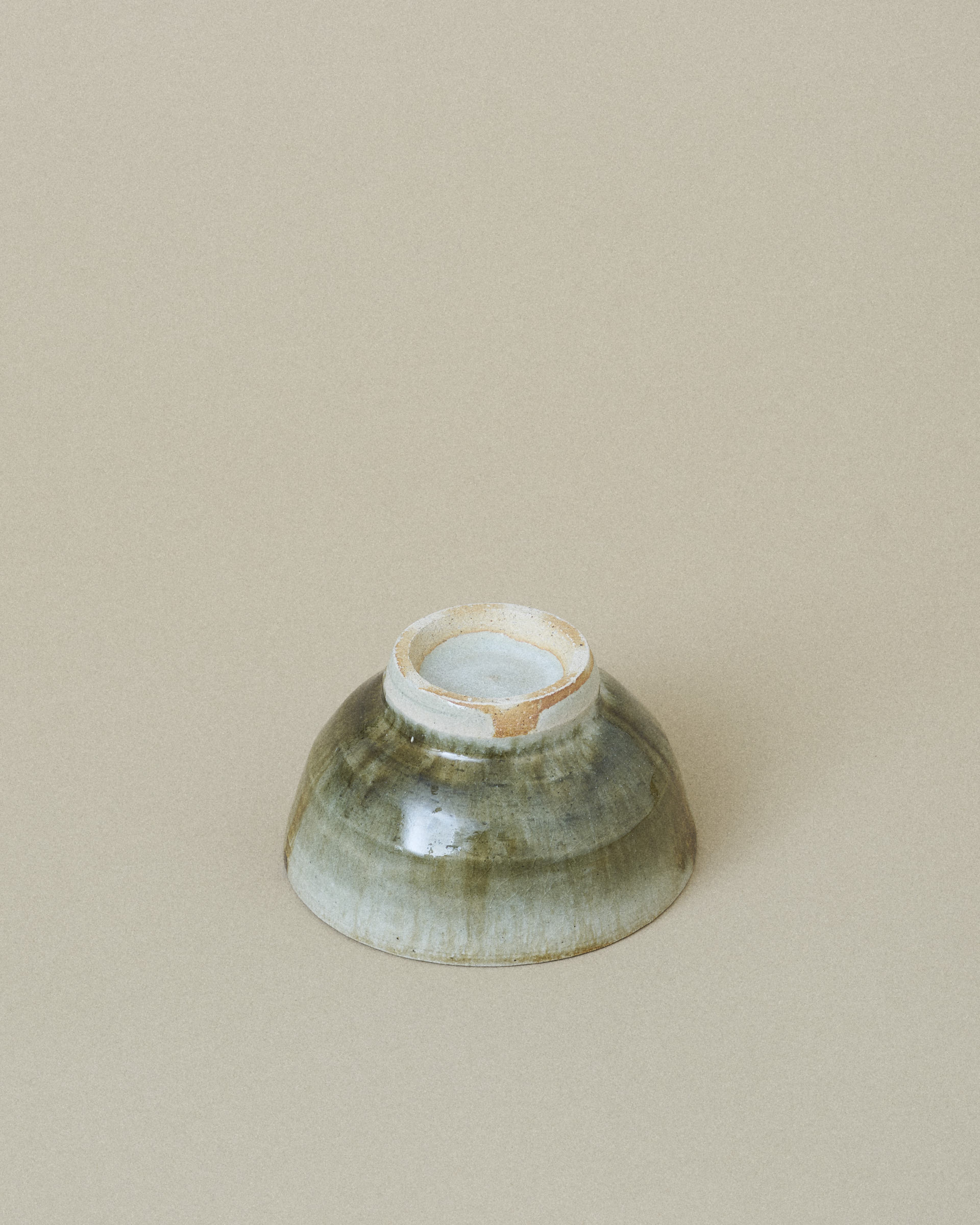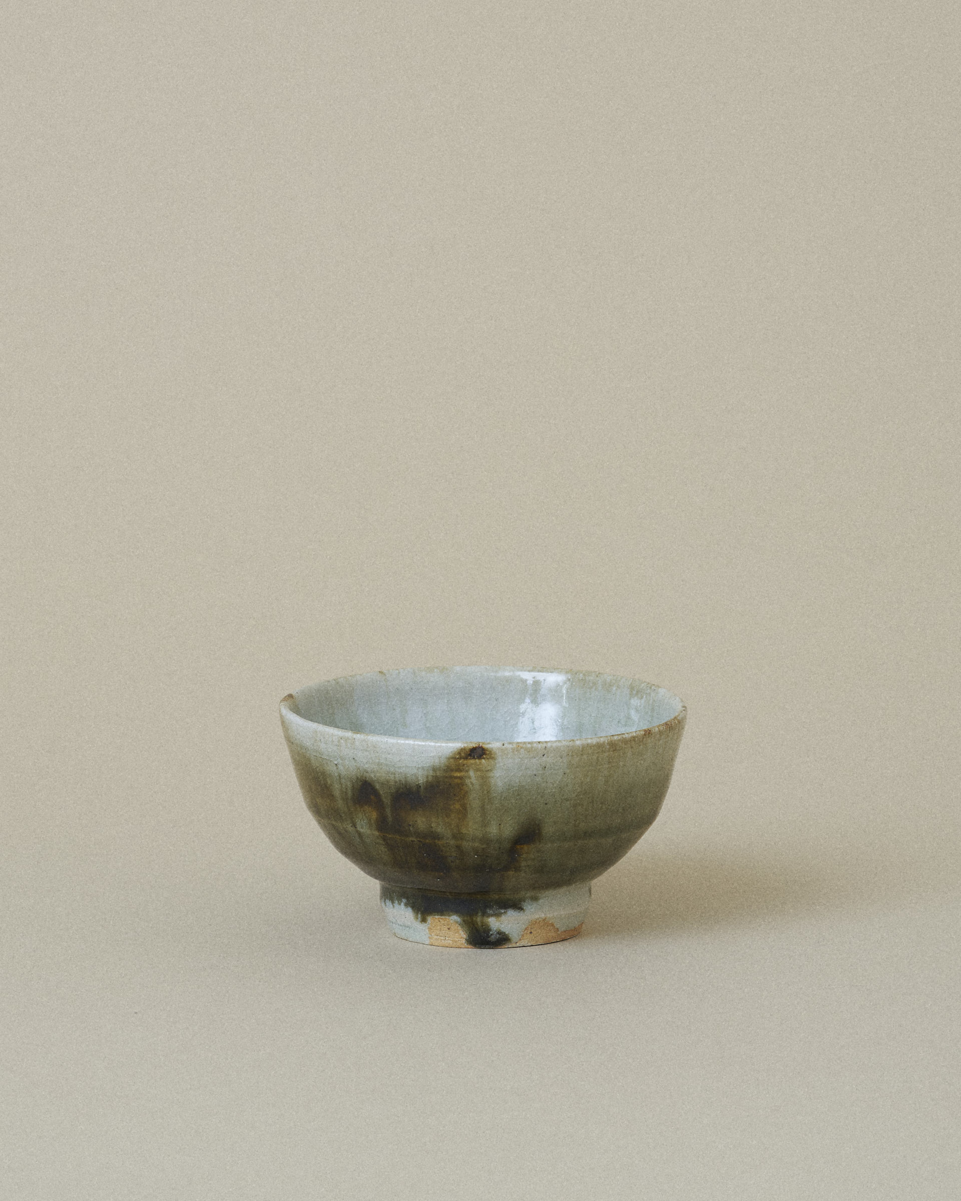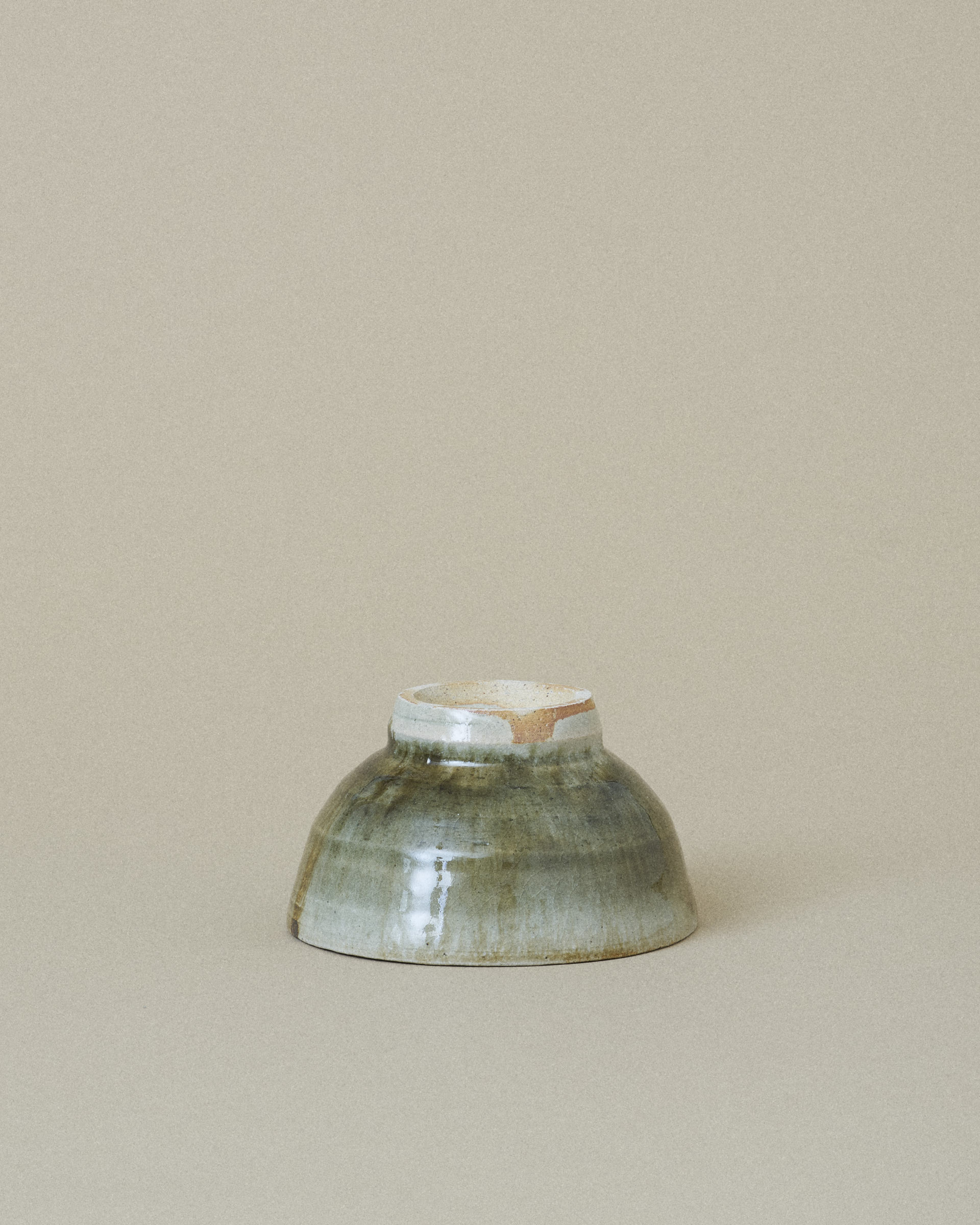 This bowl features a soft grey glaze with a subtle shimmer of jade, framing a striking center of dark green and brown glaze flowing downward. The glazes blend organically, creating rich gradients and a sense of quiet movement.