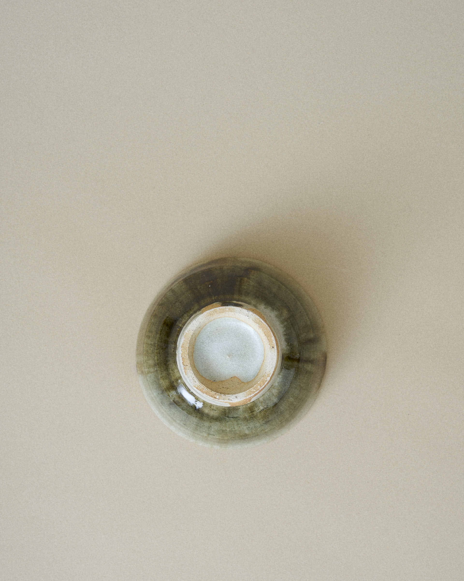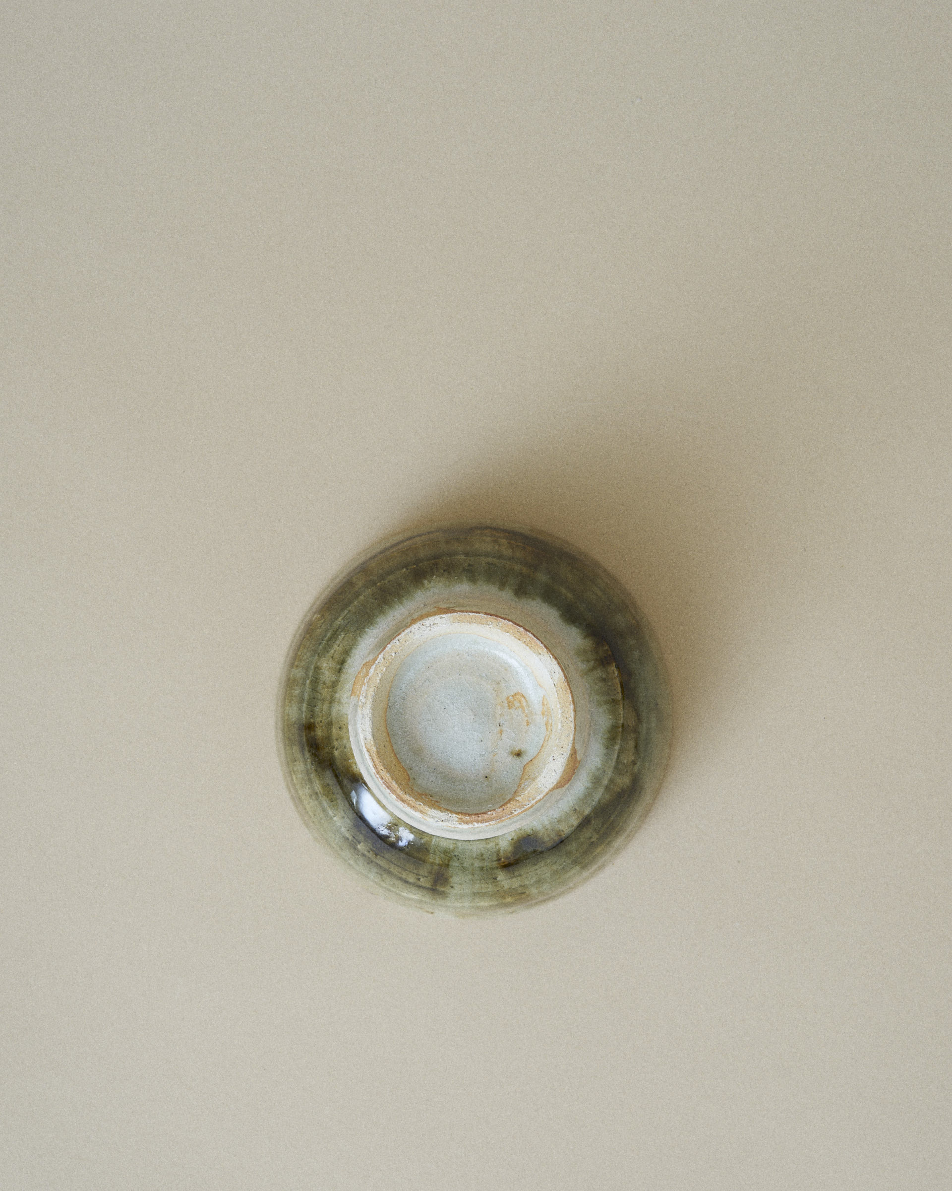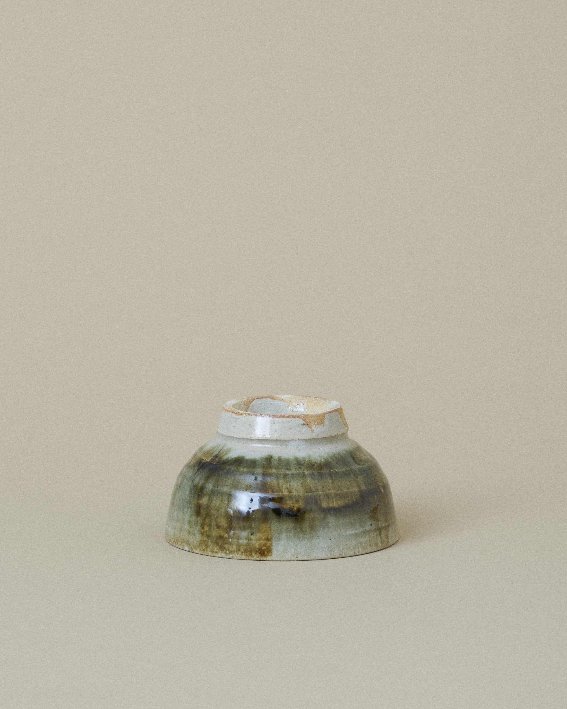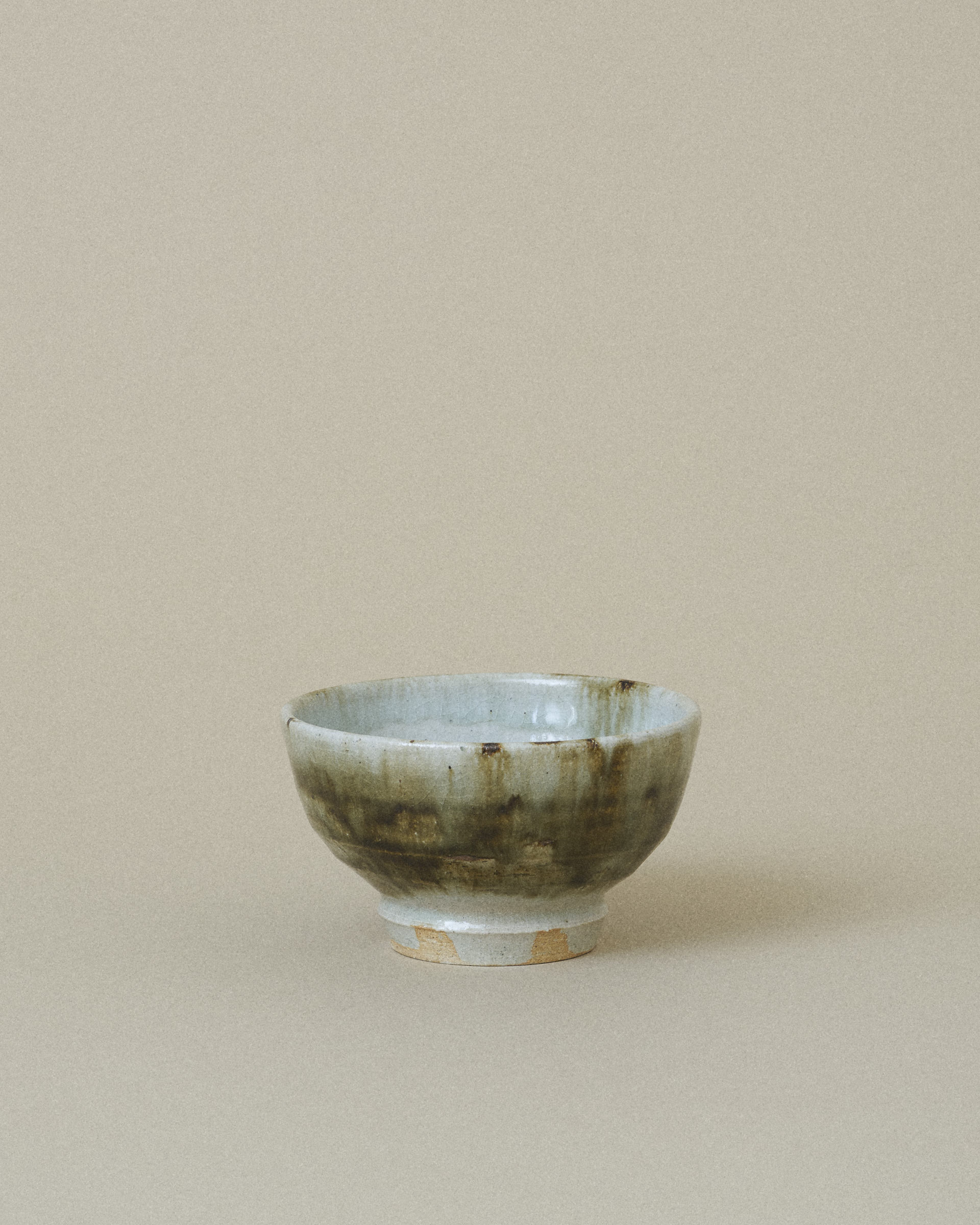 This bowl features a soft grey glaze with a subtle shimmer of jade, framing a striking center of dark green and brown glaze flowing downward. The glazes blend organically, creating rich gradients and a sense of quiet movement.