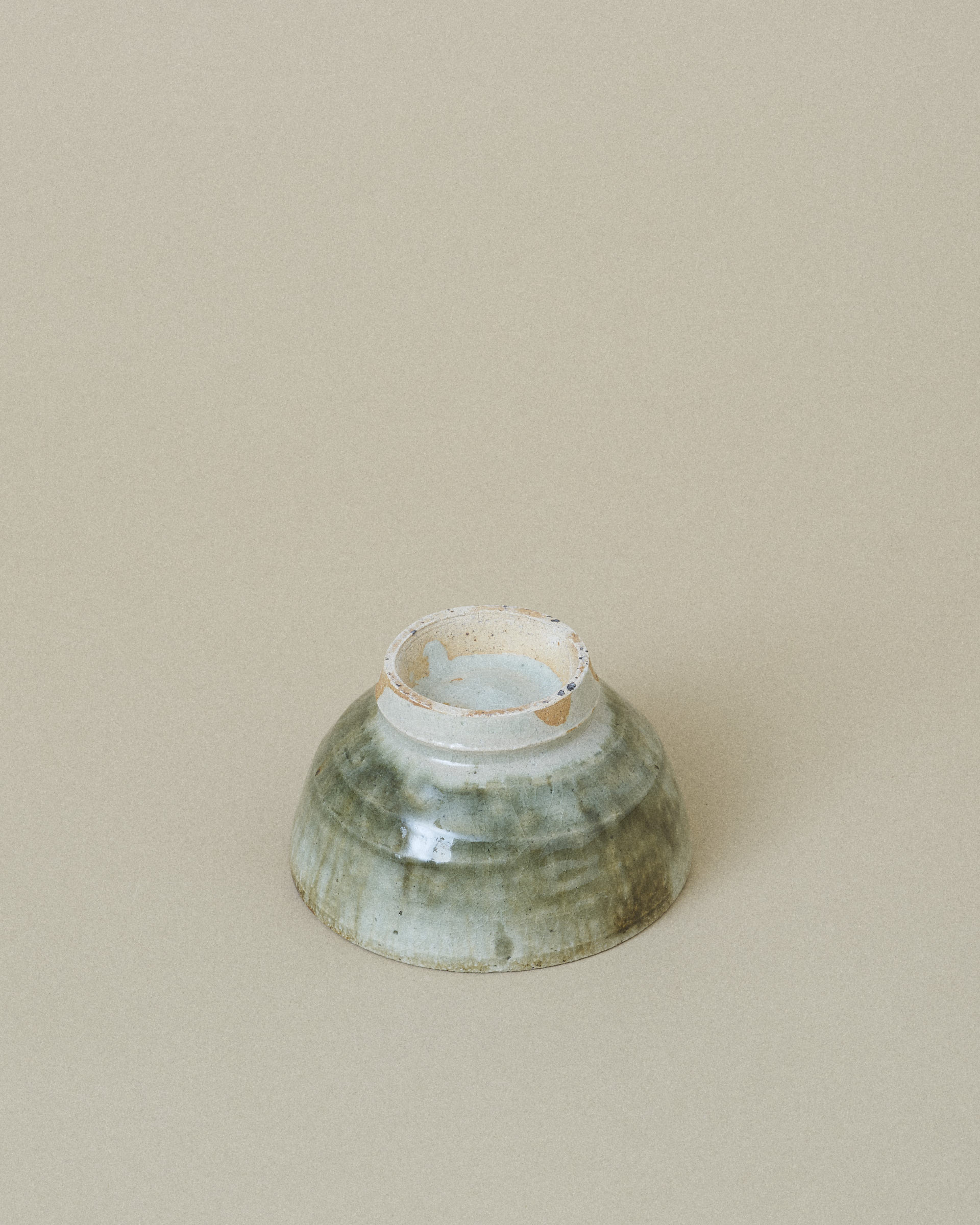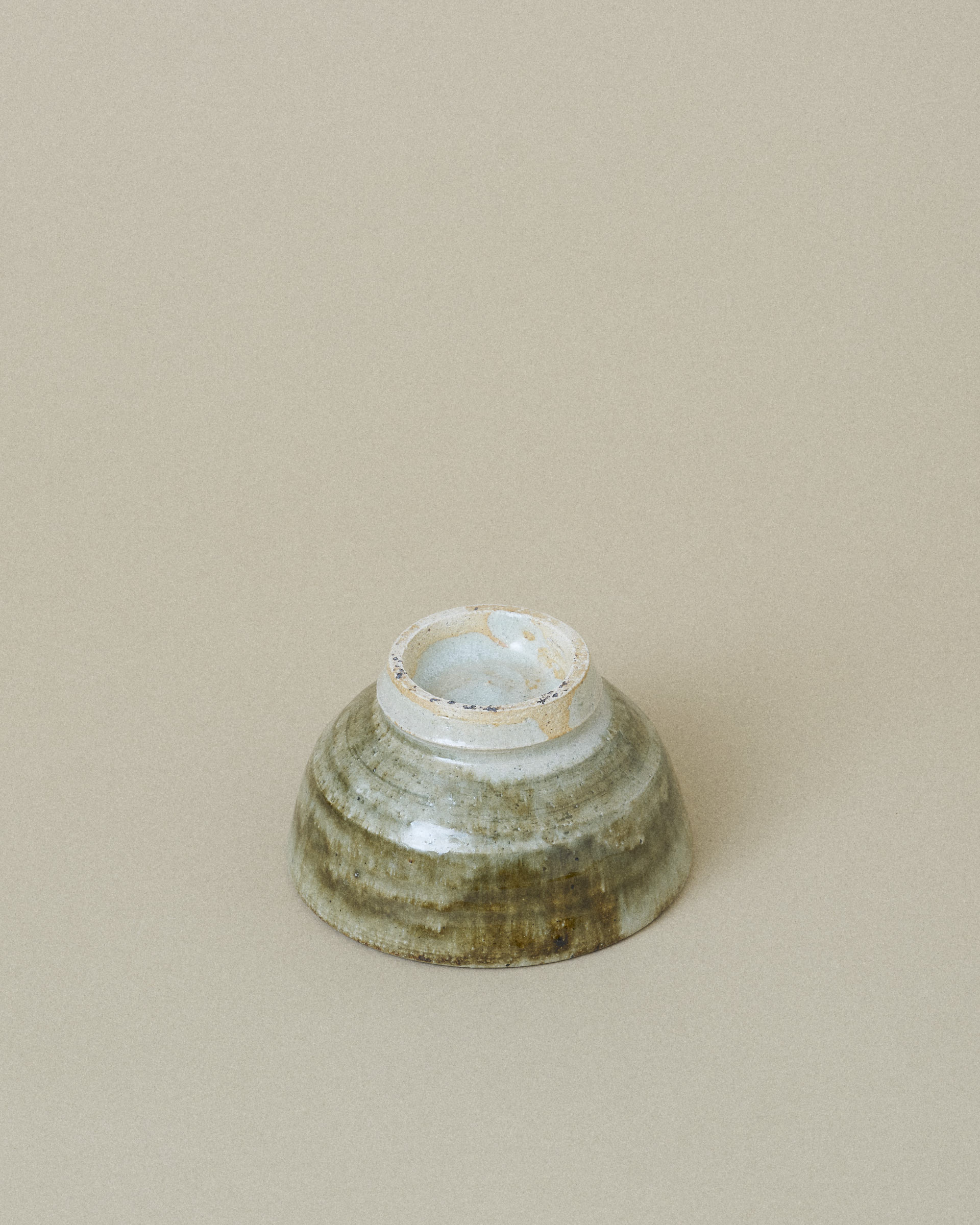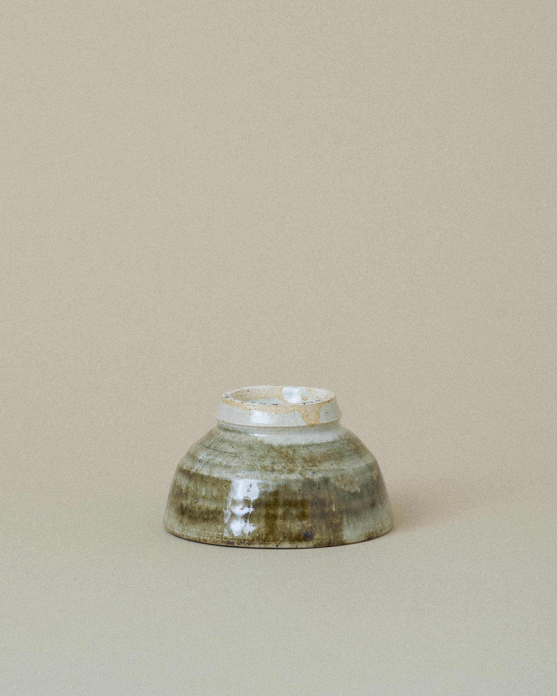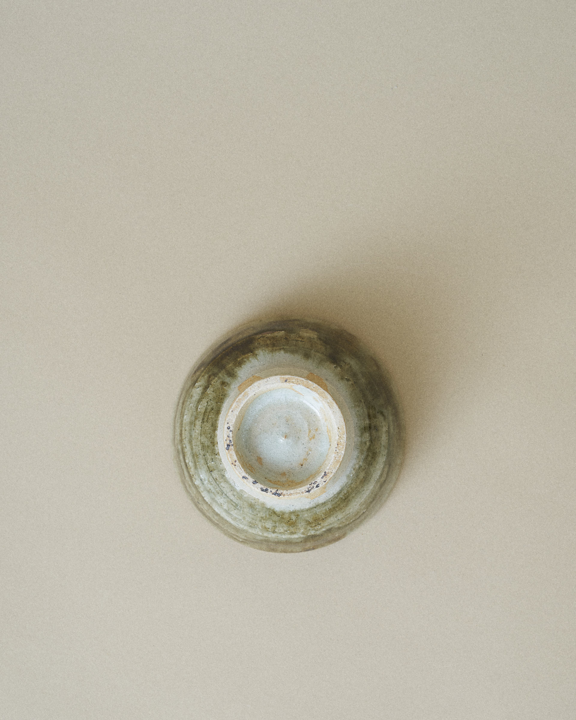 This bowl features a soft grey glaze with a subtle shimmer of jade, framing a striking center of dark green and brown glaze flowing downward. The glazes blend organically, creating rich gradients and a sense of quiet movement.