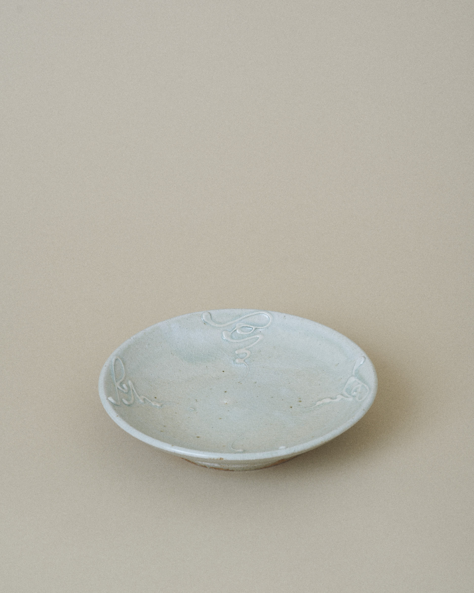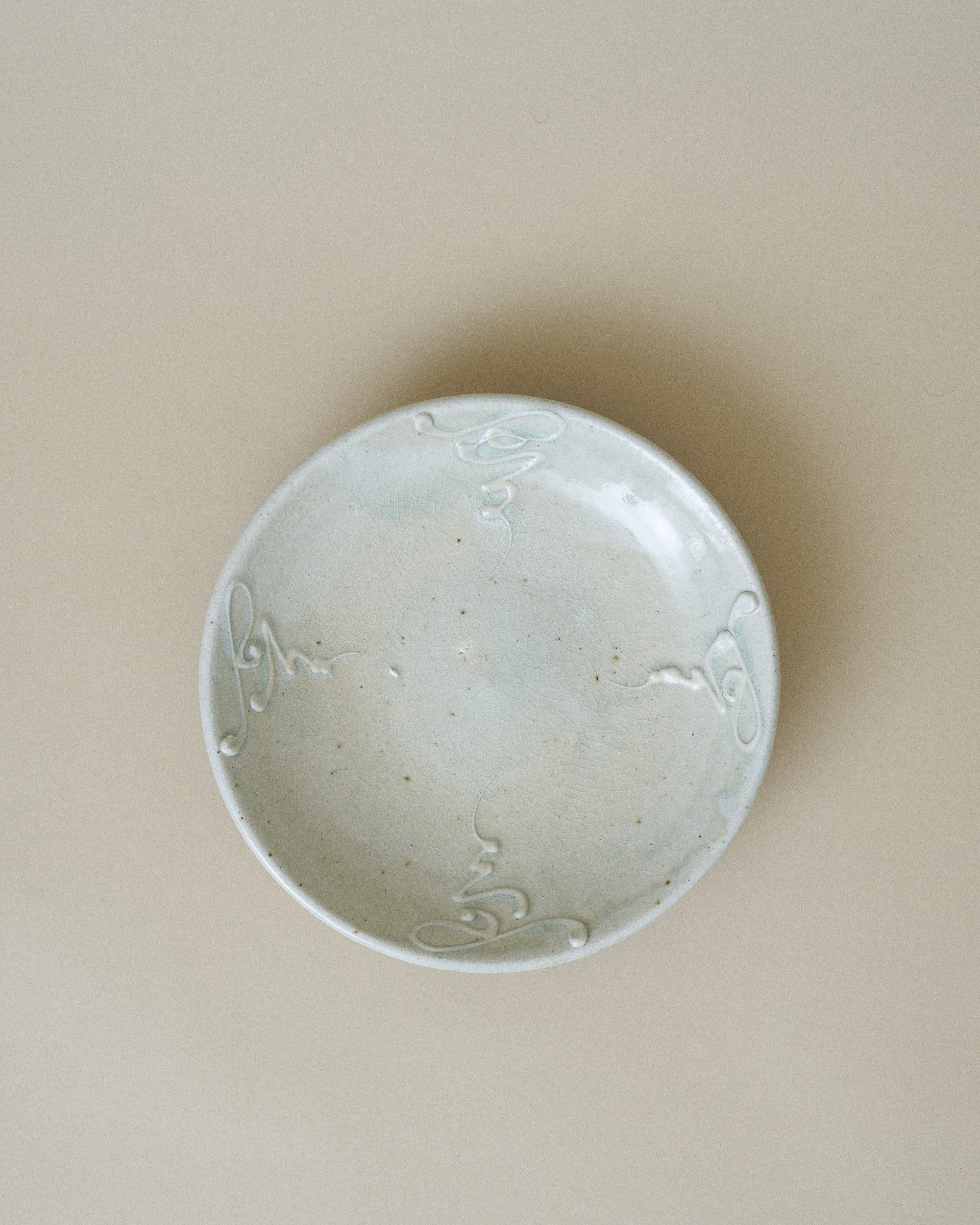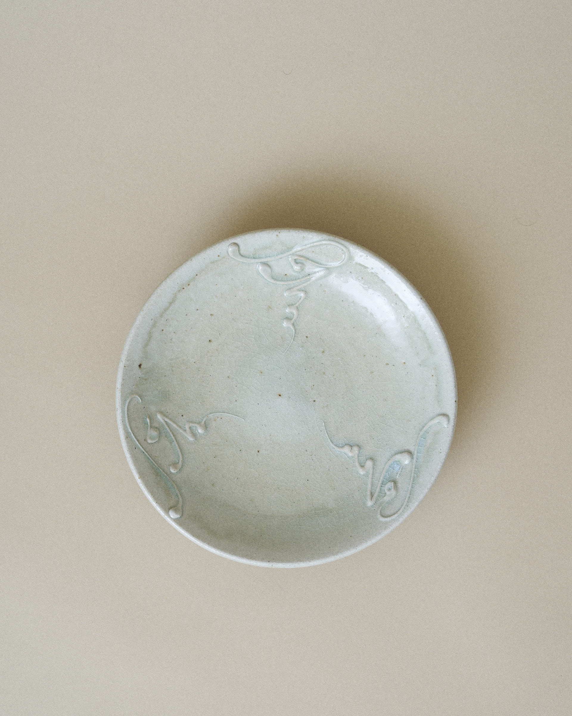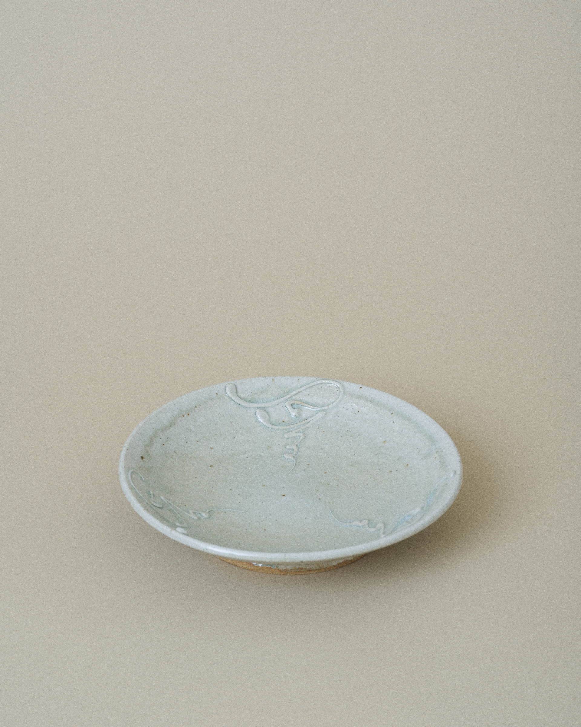 Plate with a delicate network of fine cracks on the surface weaving across the glaze, giving the surface a quiet sense of depth and age. Several patterns of slip (thick liquid clay) have been carefully trailed onto the plate, adding subtle texture and movement.