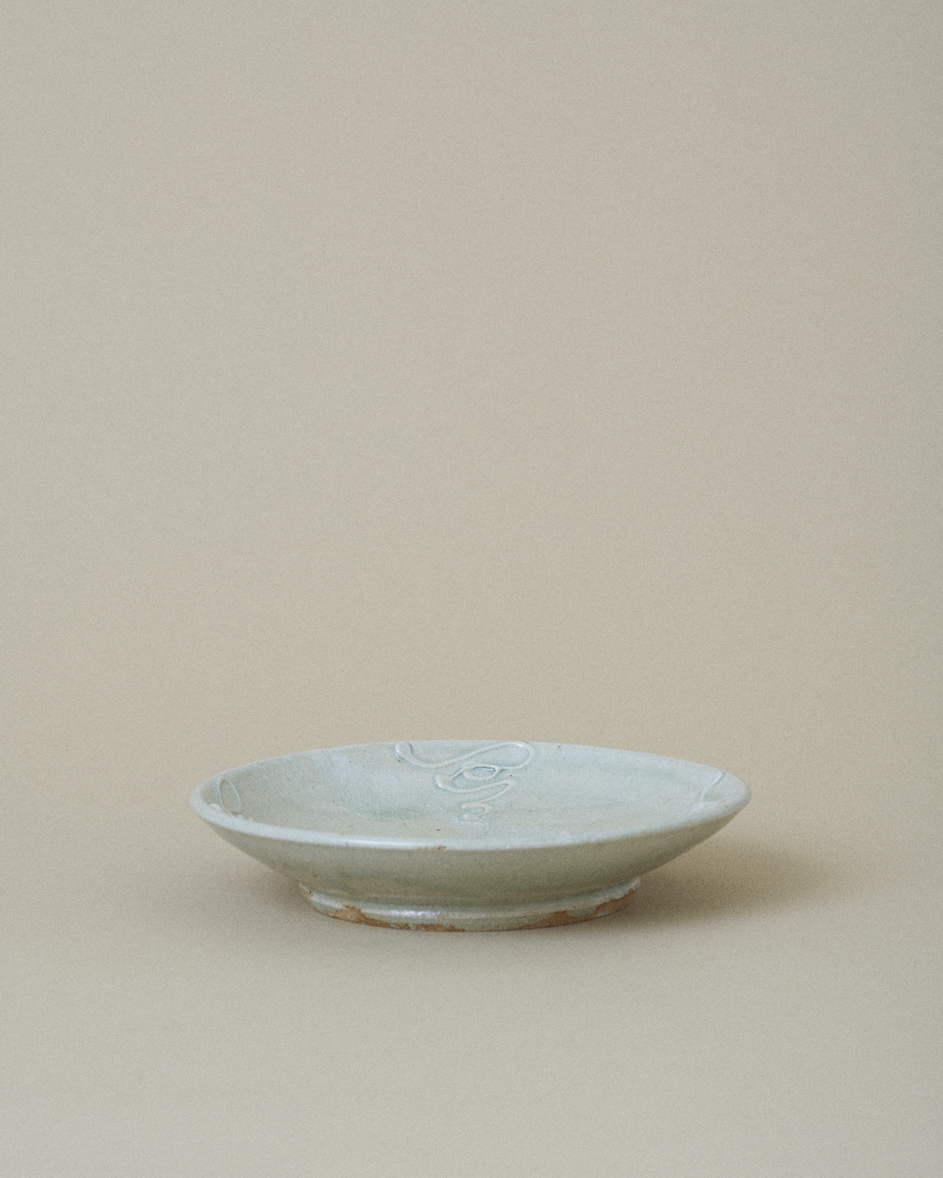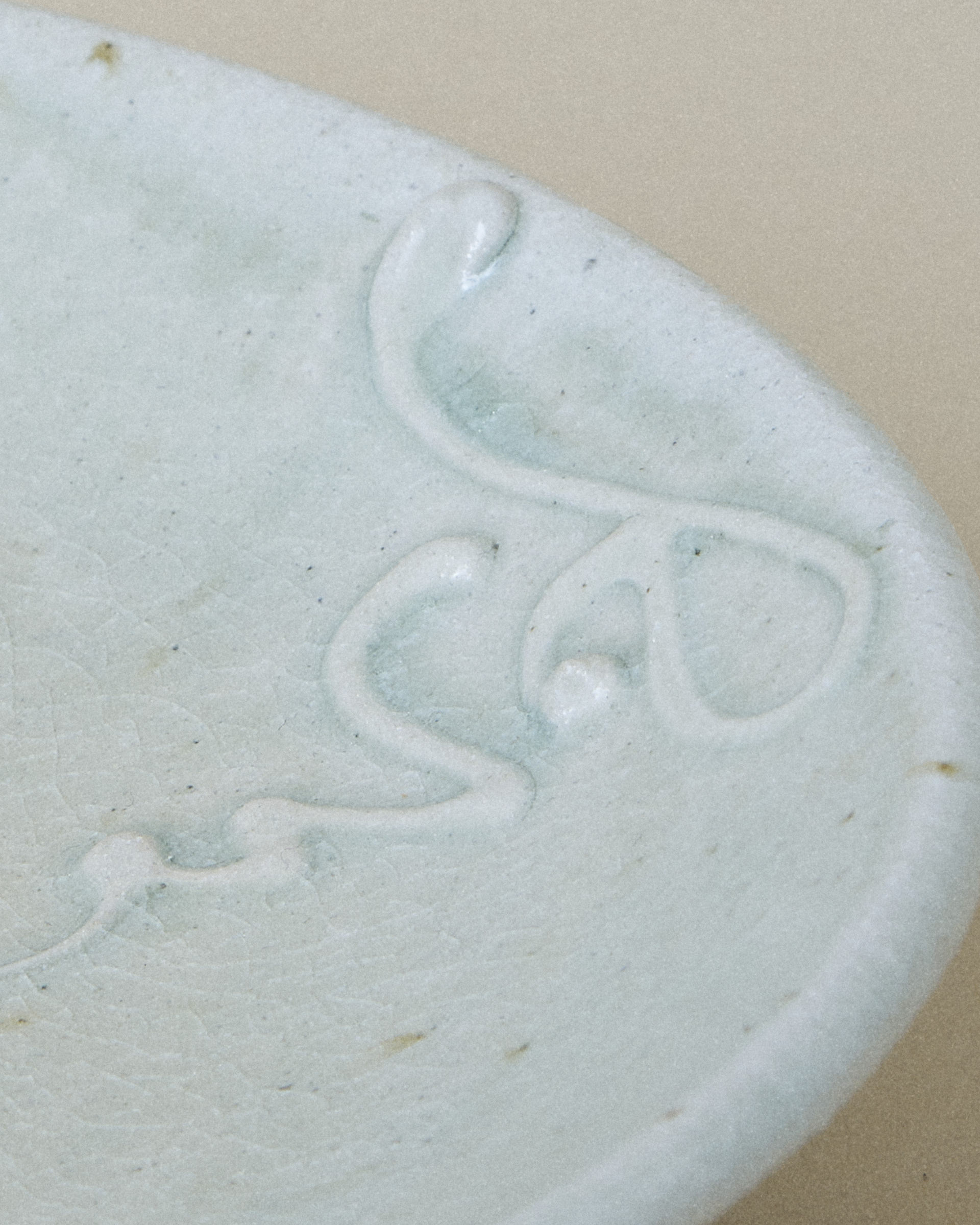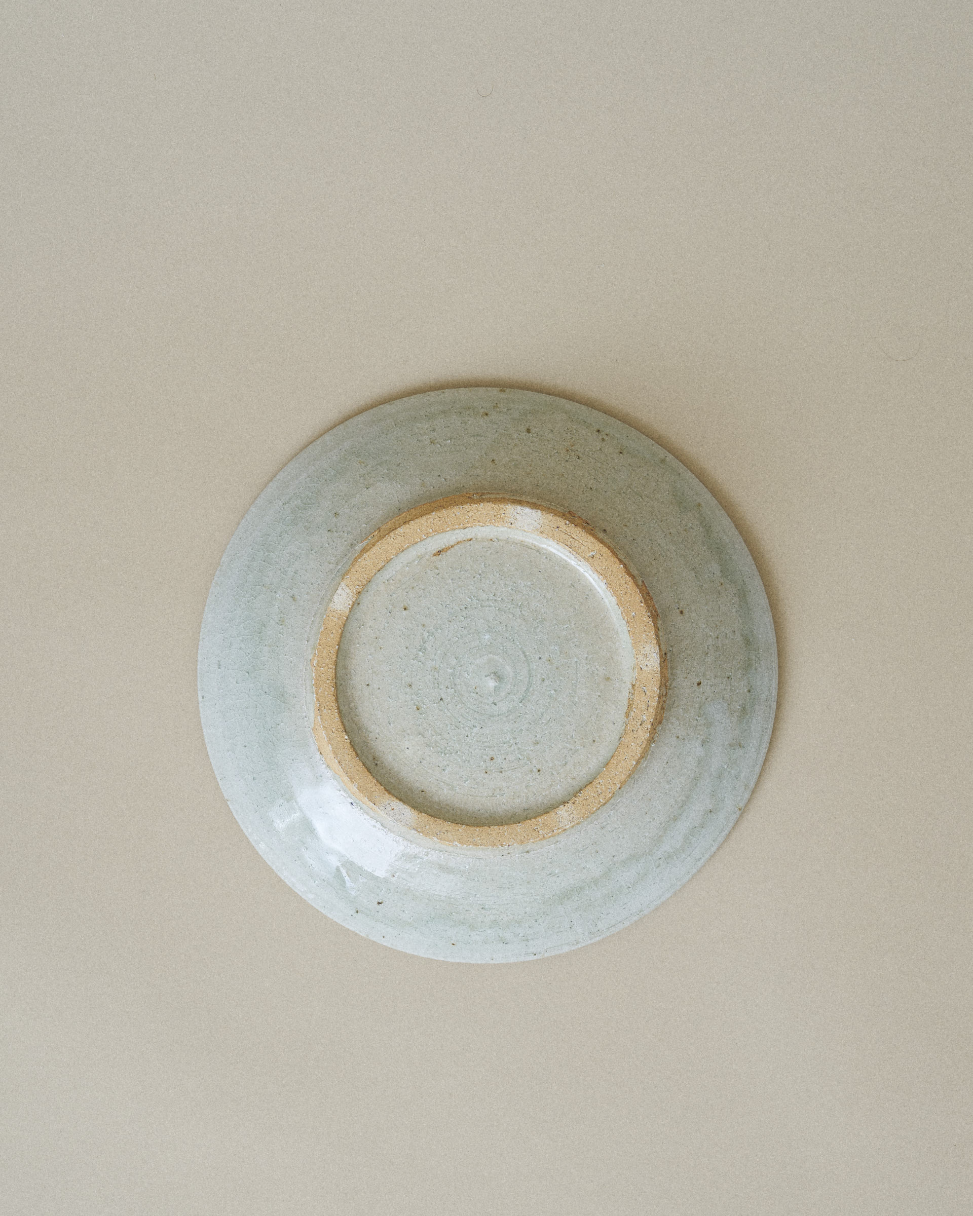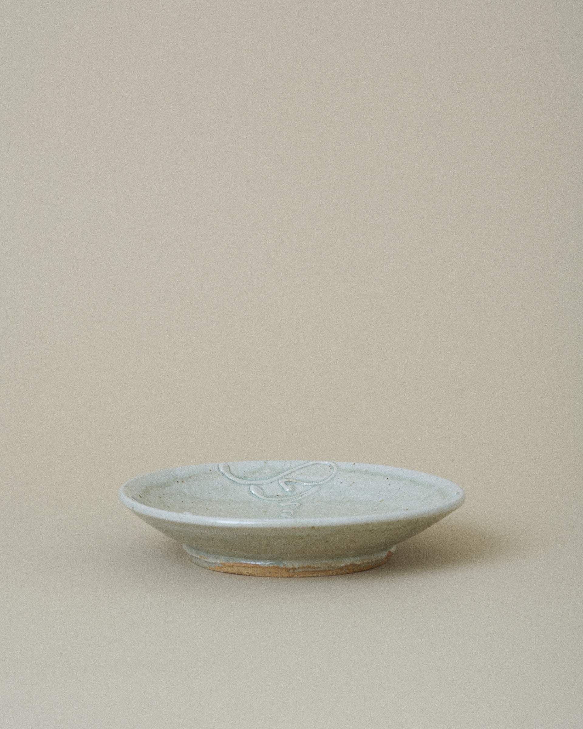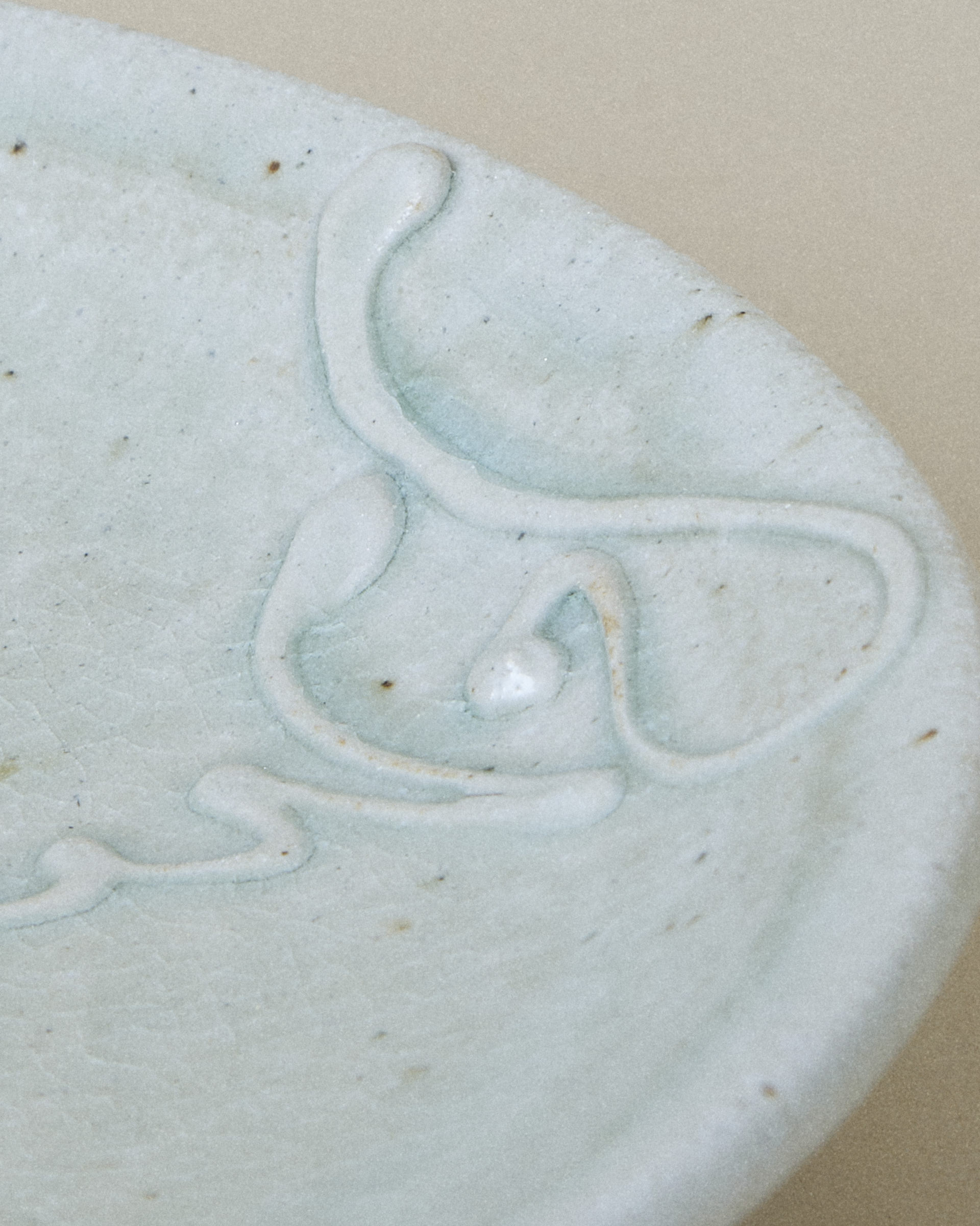 Plate with a delicate network of fine cracks on the surface weaving across the glaze, giving the surface a quiet sense of depth and age. Several patterns of slip (thick liquid clay) have been carefully trailed onto the plate, adding subtle texture and movement.