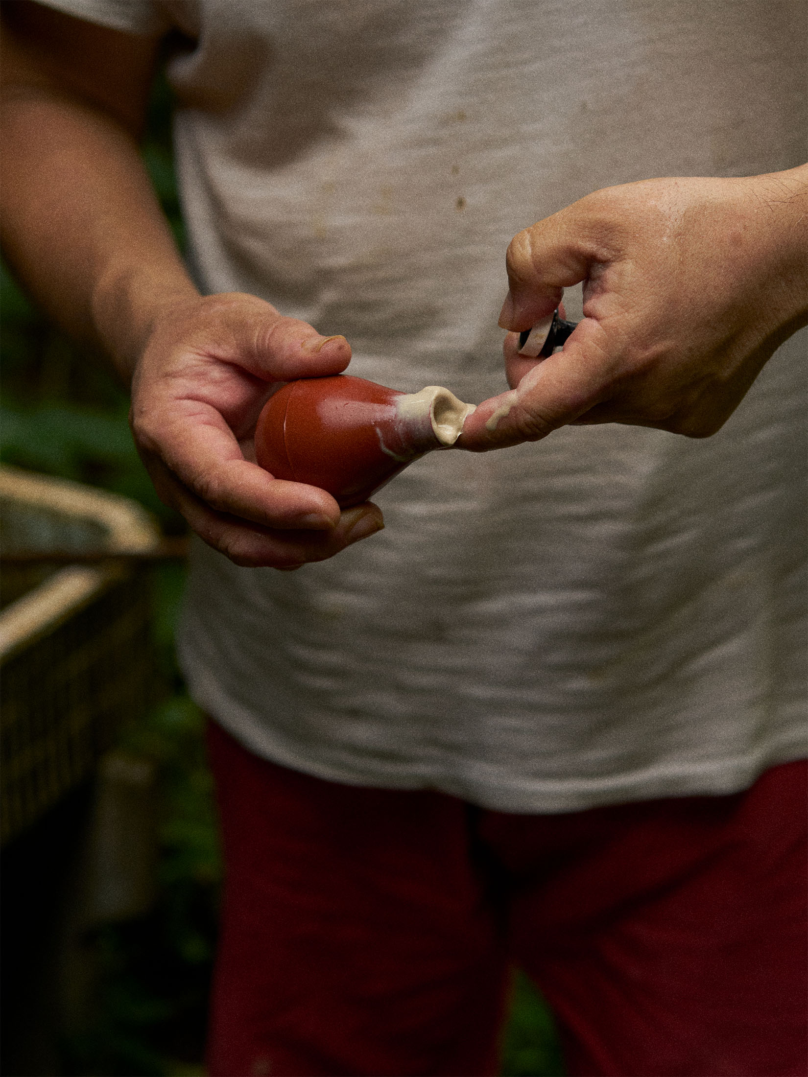 He also chops firewood, digs and processes clay by hand and prepares his own ash glazes to enhance the natural character of his ceramics. Much of his work takes place in the lush garden that surrounds his home and workshop.