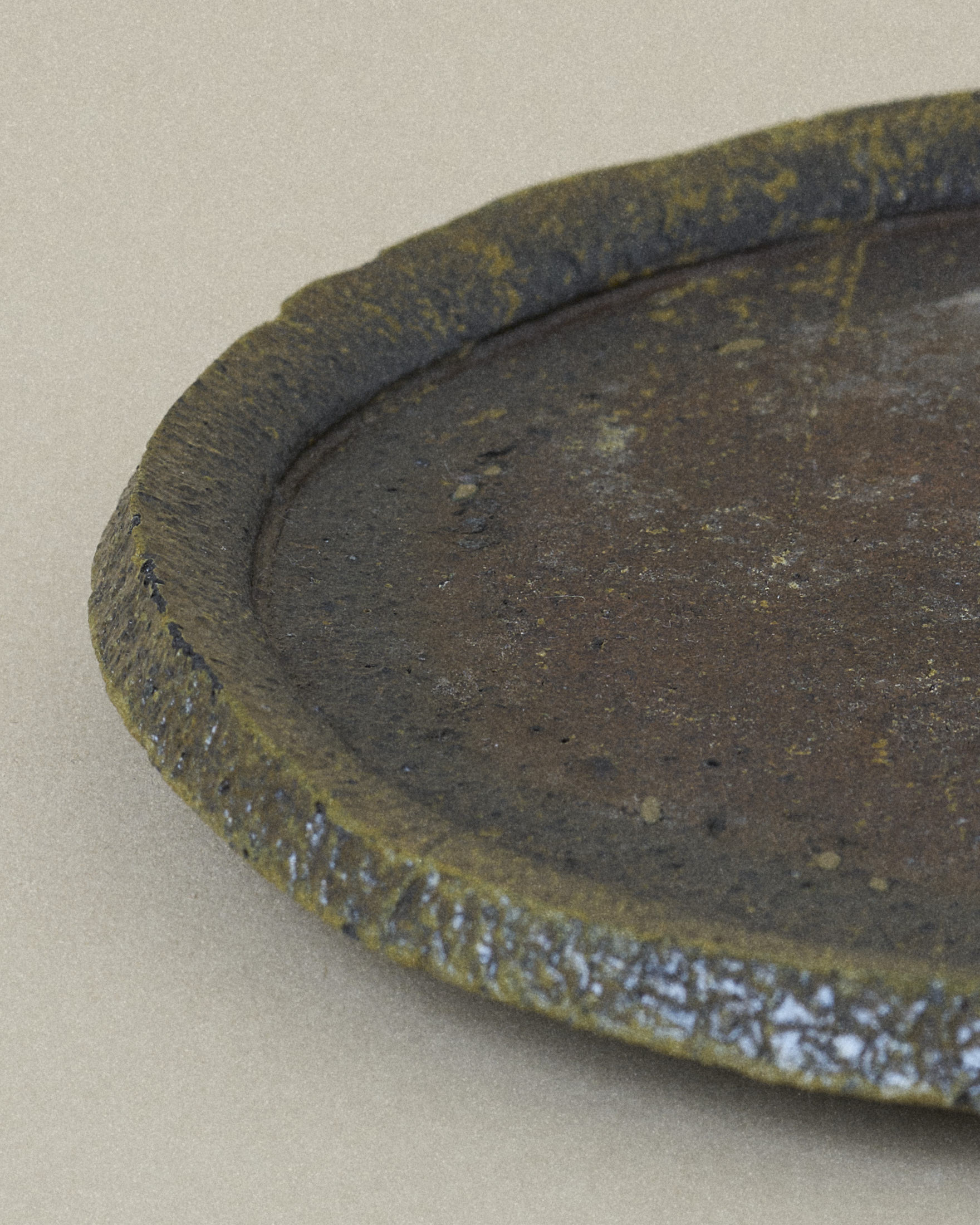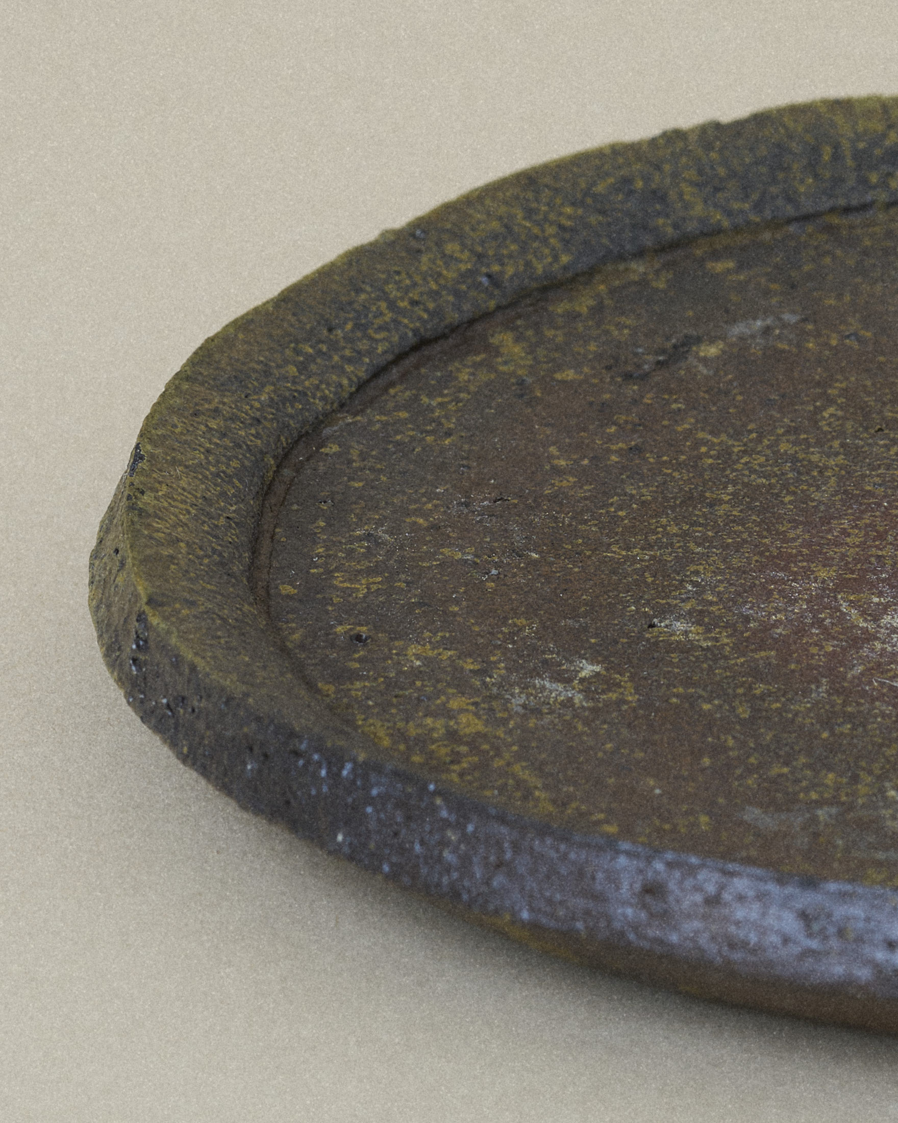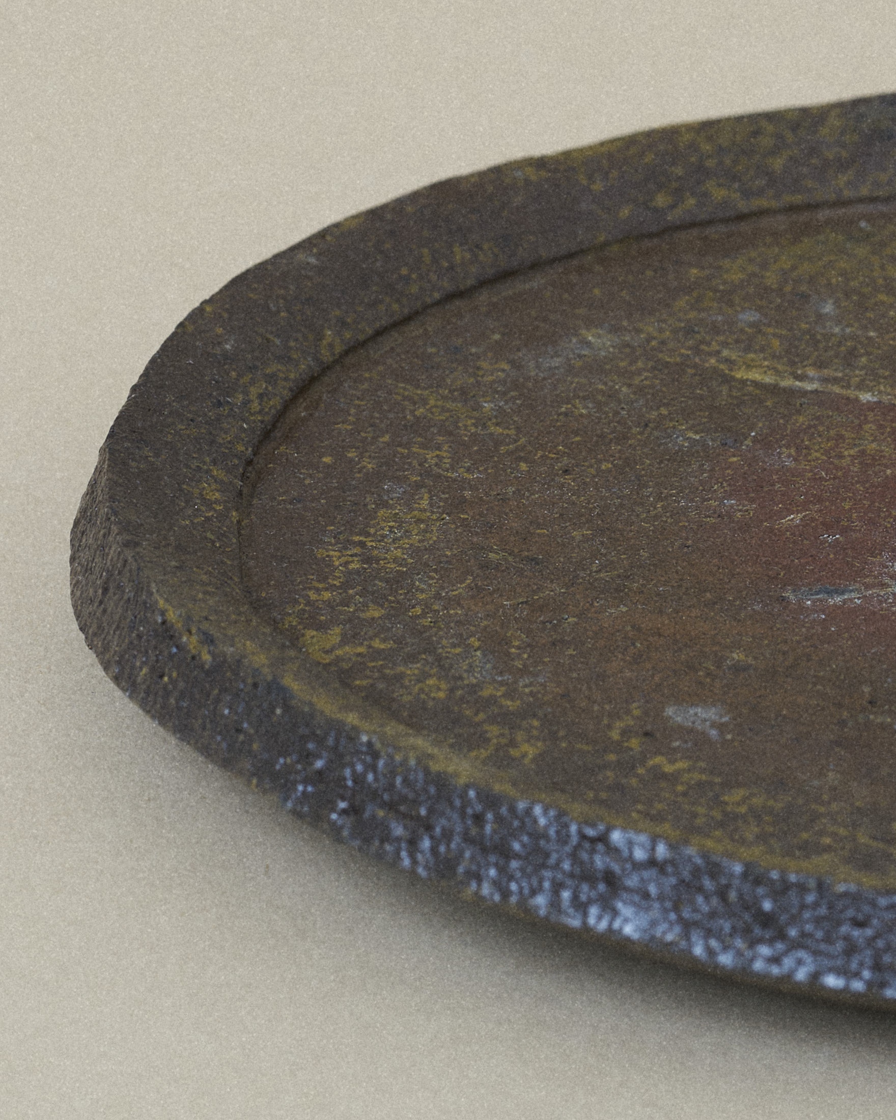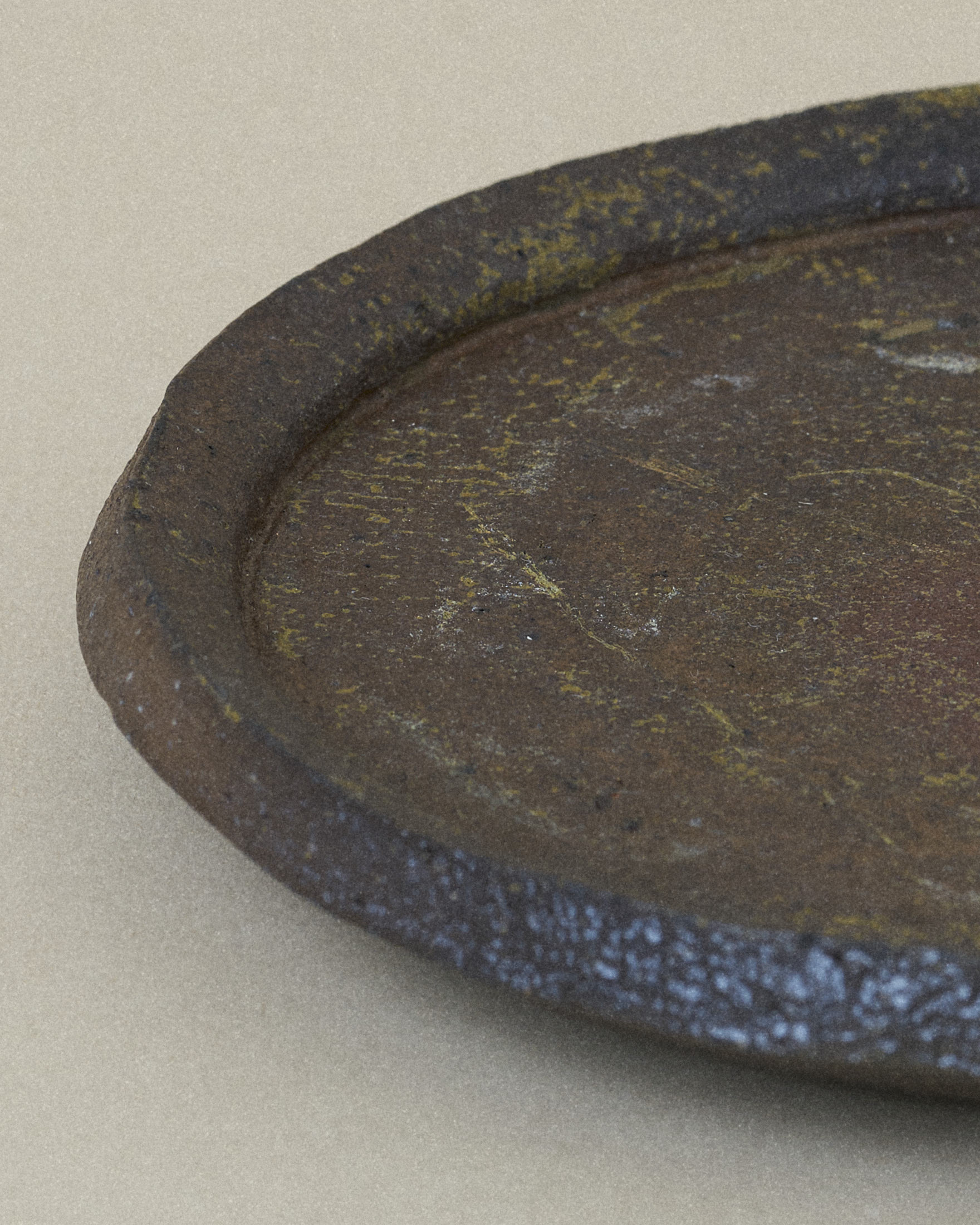 Komura employs a range of techniques and materials to shape the character of her ceramics. To create tonal variations in brown, green, and red, she works with ash, straw, coral, and mineral‑rich clays.